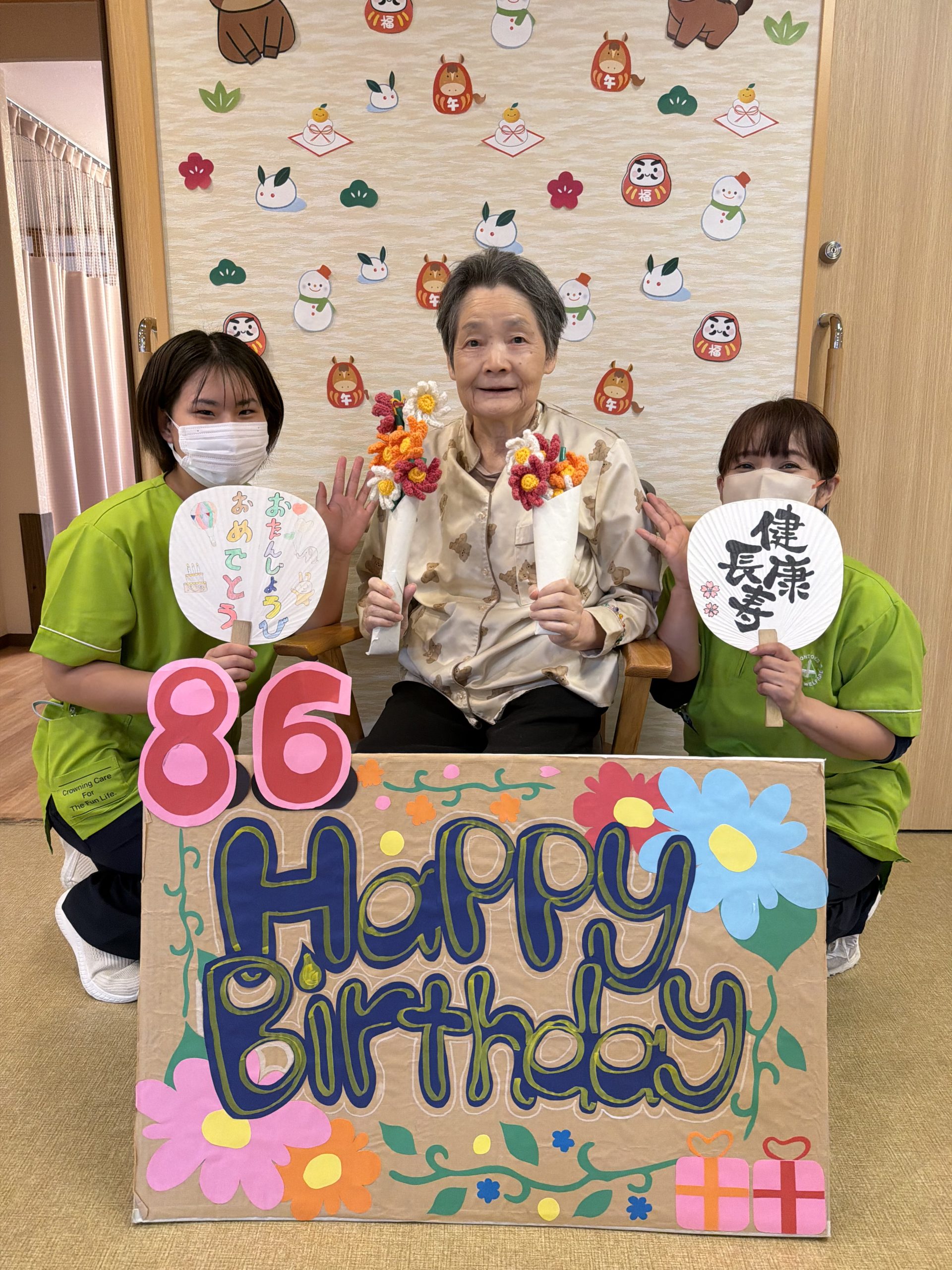 18名の皆様のお誕生日をお祝いでき、大変嬉しく思います。皆様の笑顔がこれからも毎日を彩り、穏やかで幸せな日々が続きますよう職員一同心より願っております。