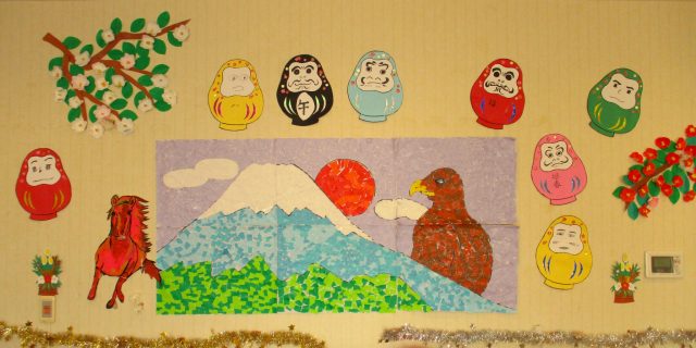 室内では みなさんで作った新年の 貼り絵 と 達磨 が!