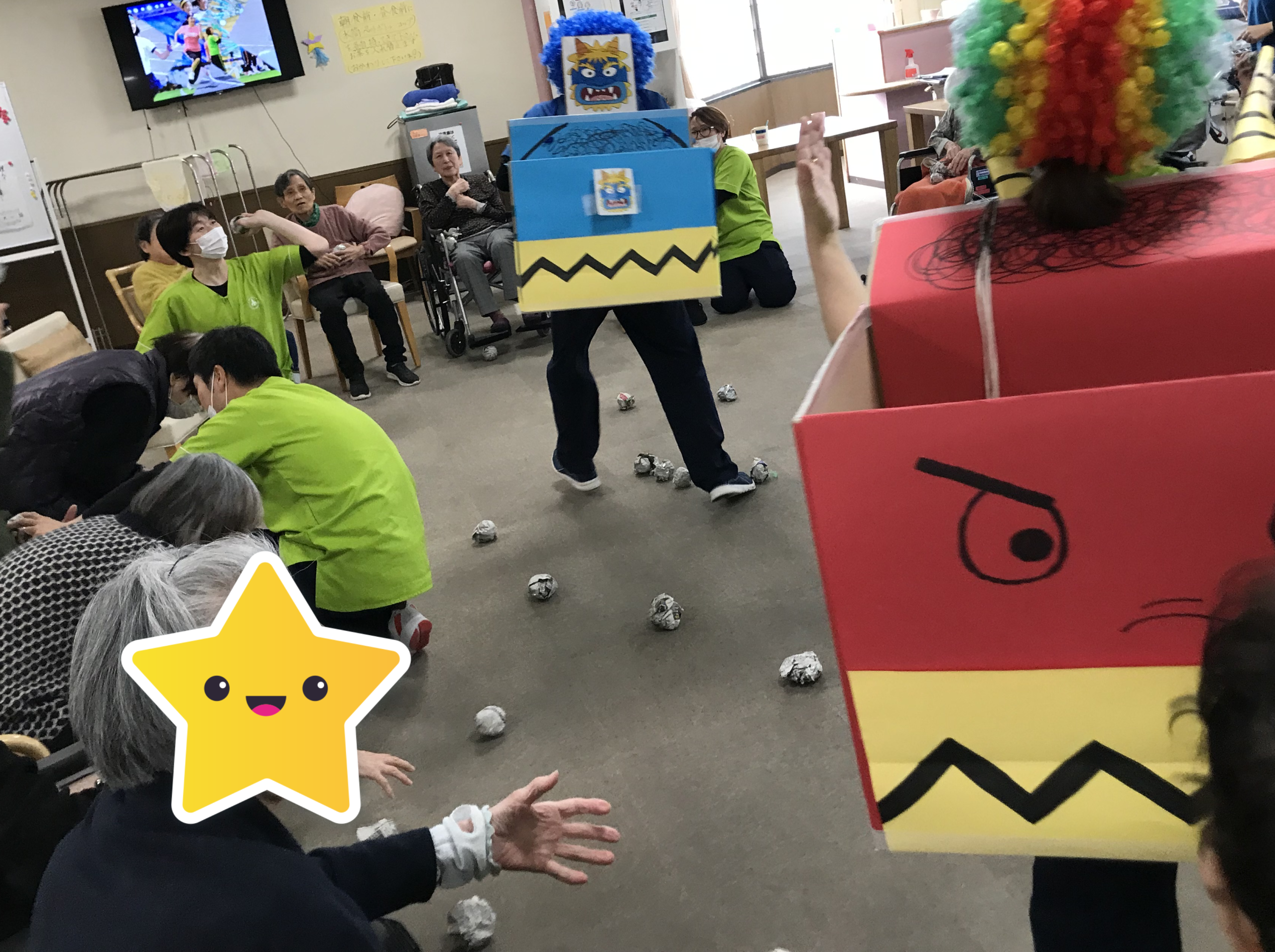 鬼に扮した職員に新聞紙で出来た豆を投げて頂き、