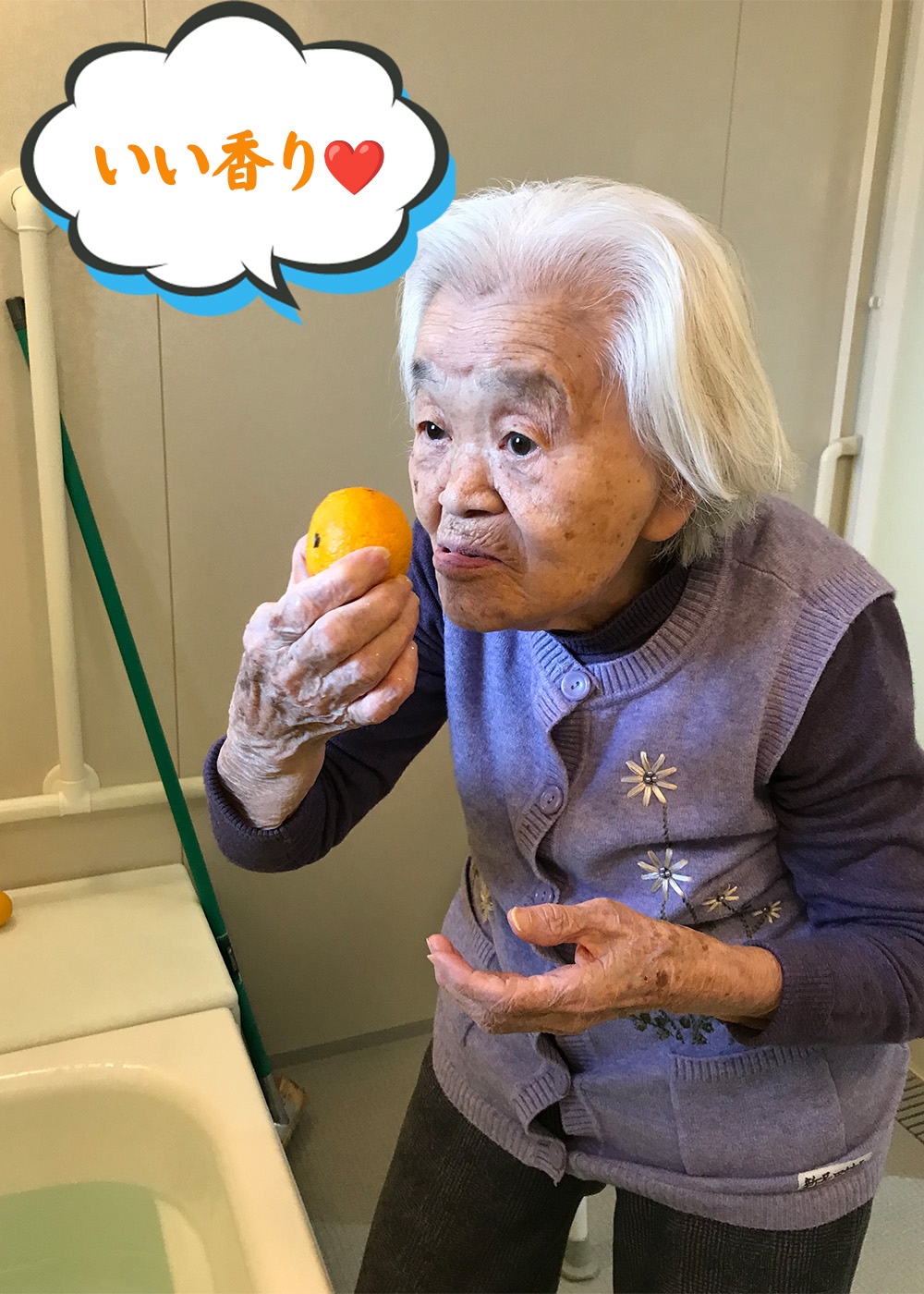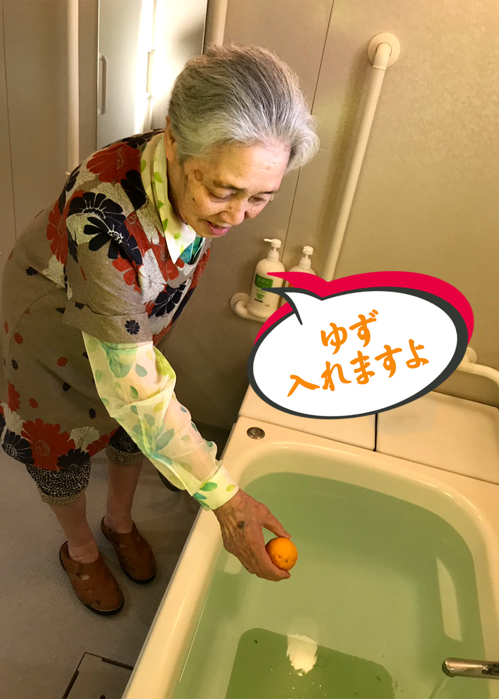 入浴シーンは、お見せできませんが(笑)ご利用者様はゆずの香りを楽しみ、ポカポカしたと喜んでくださいました。