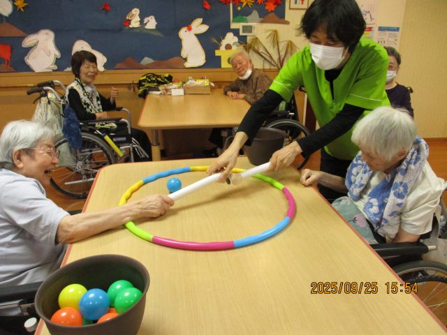 釣り堀に泳ぐボールを ひっつく棒で釣り上げます😊