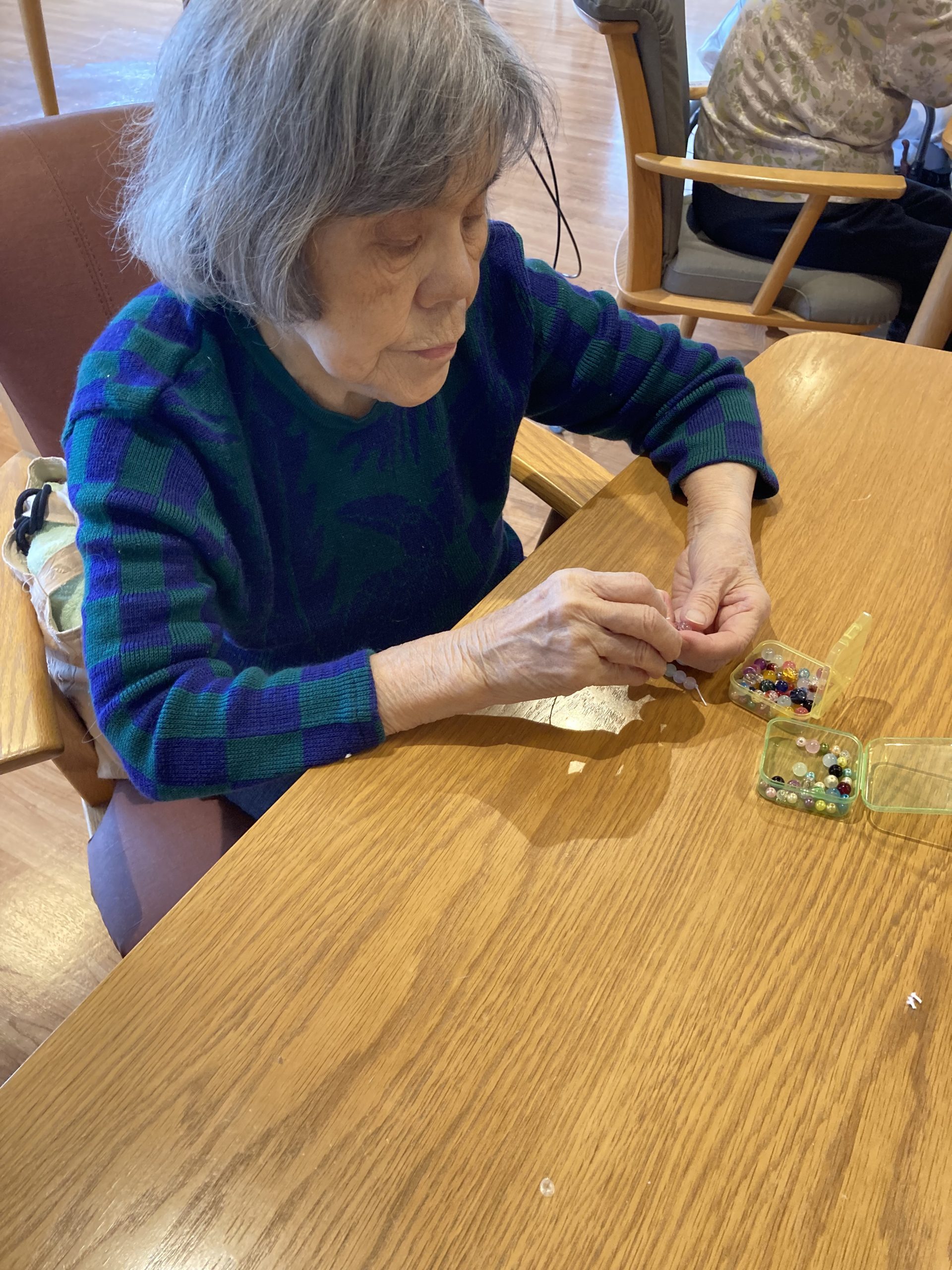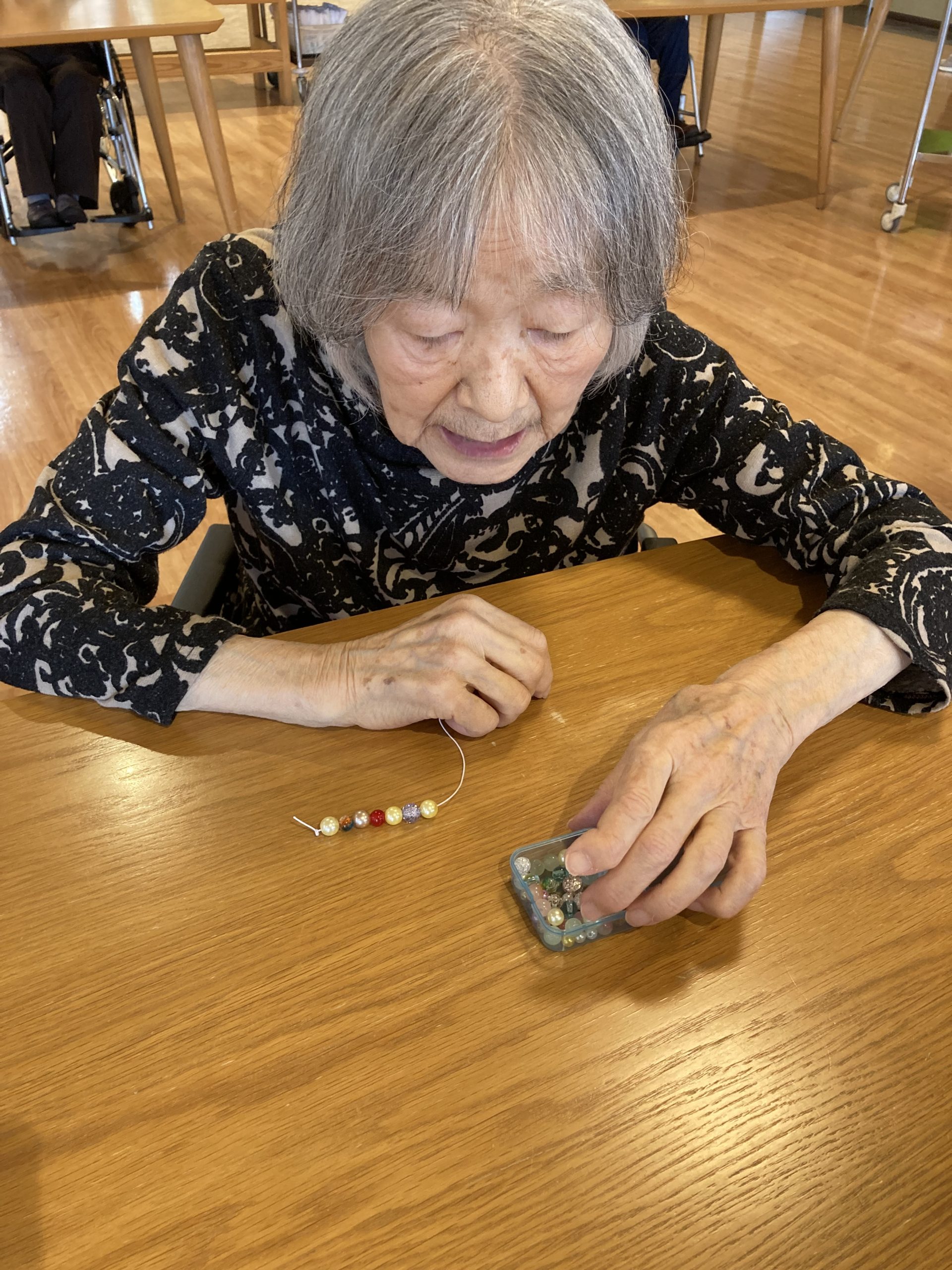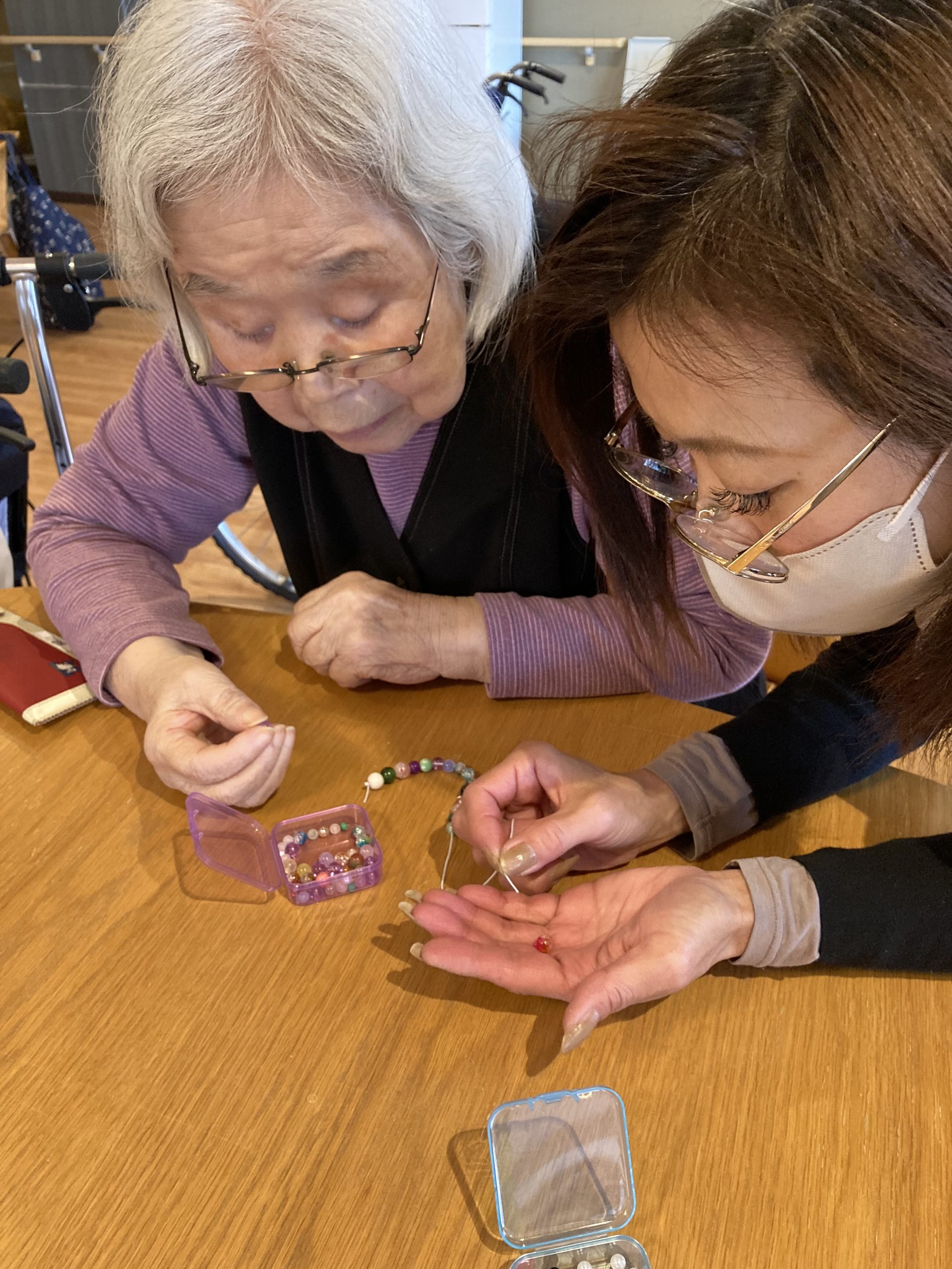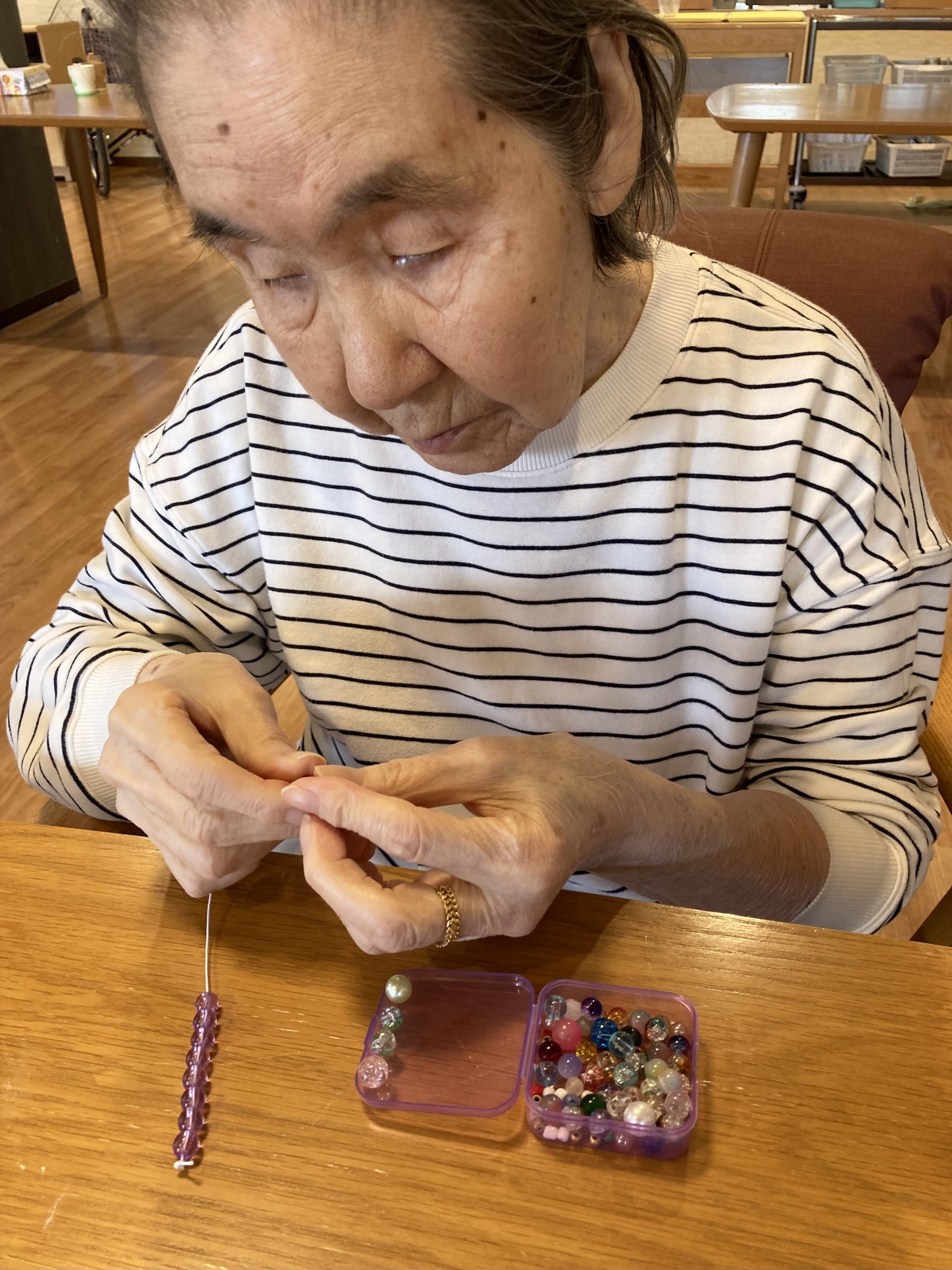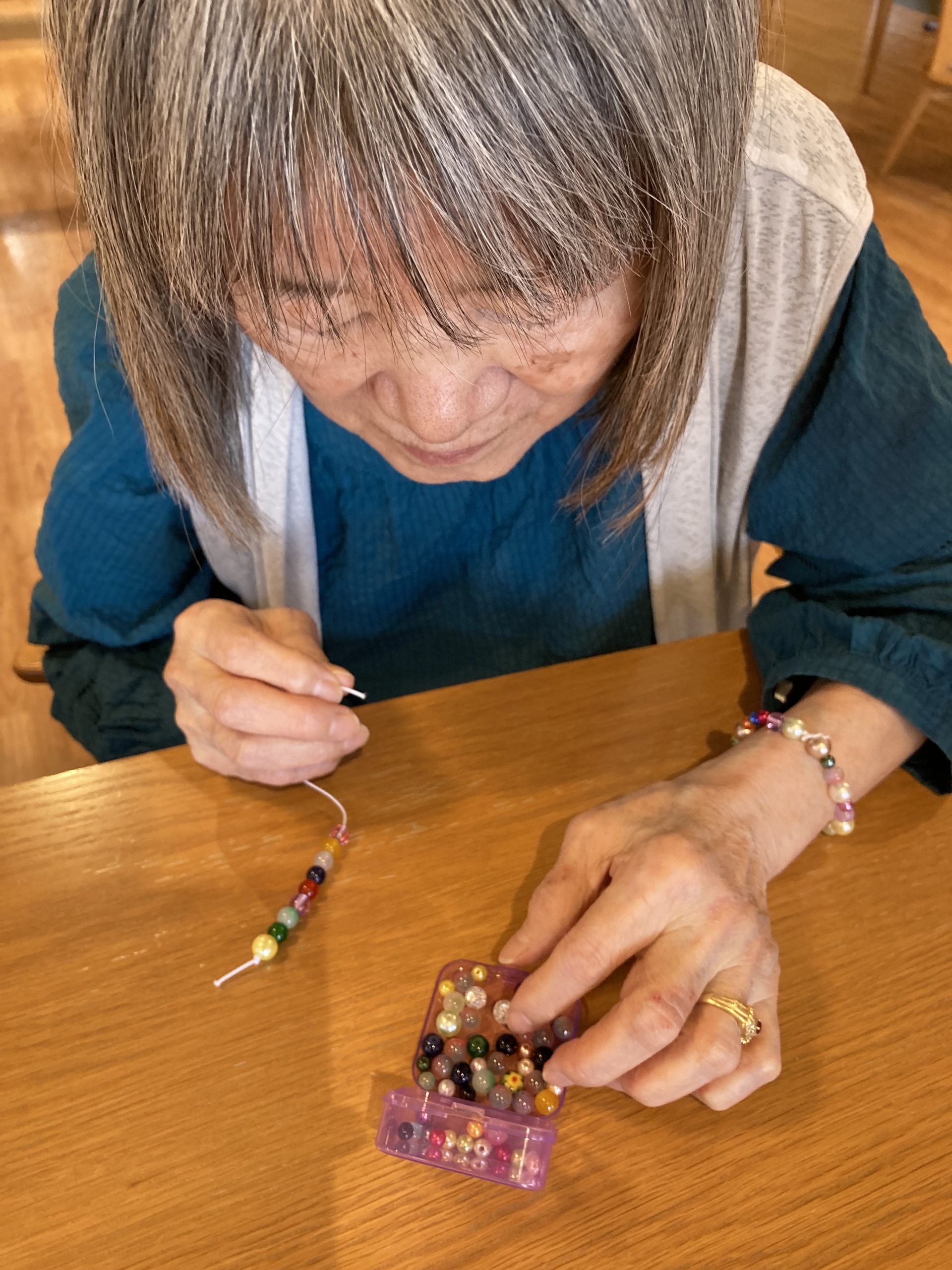 大小さまざまなビーズを紐へ通していく細やかな作業。「こんなに細かい作業、久しぶり。」と話しながら、皆さん一粒ずつ好みの色を選びながら丁寧に紐に通されていました。