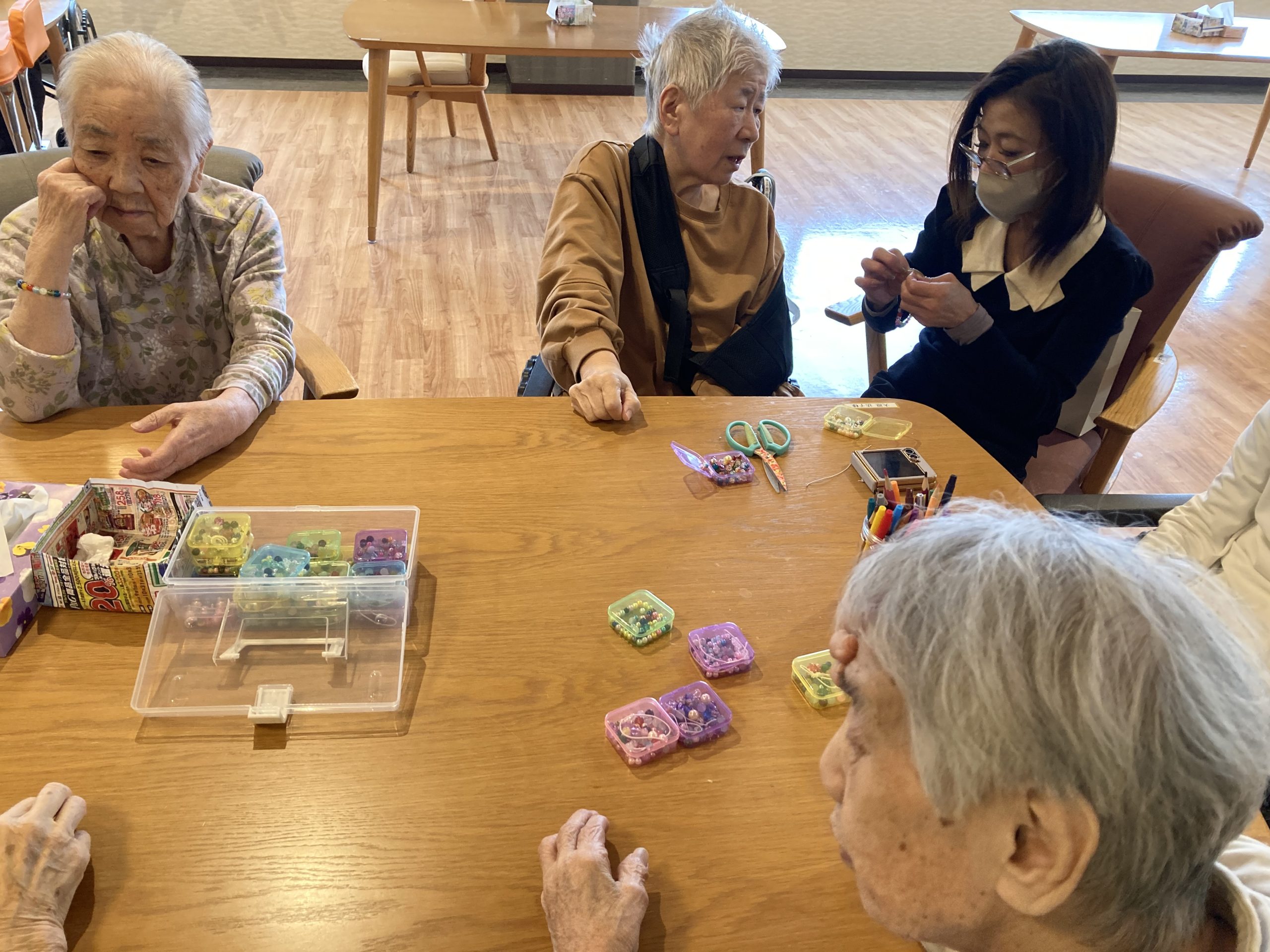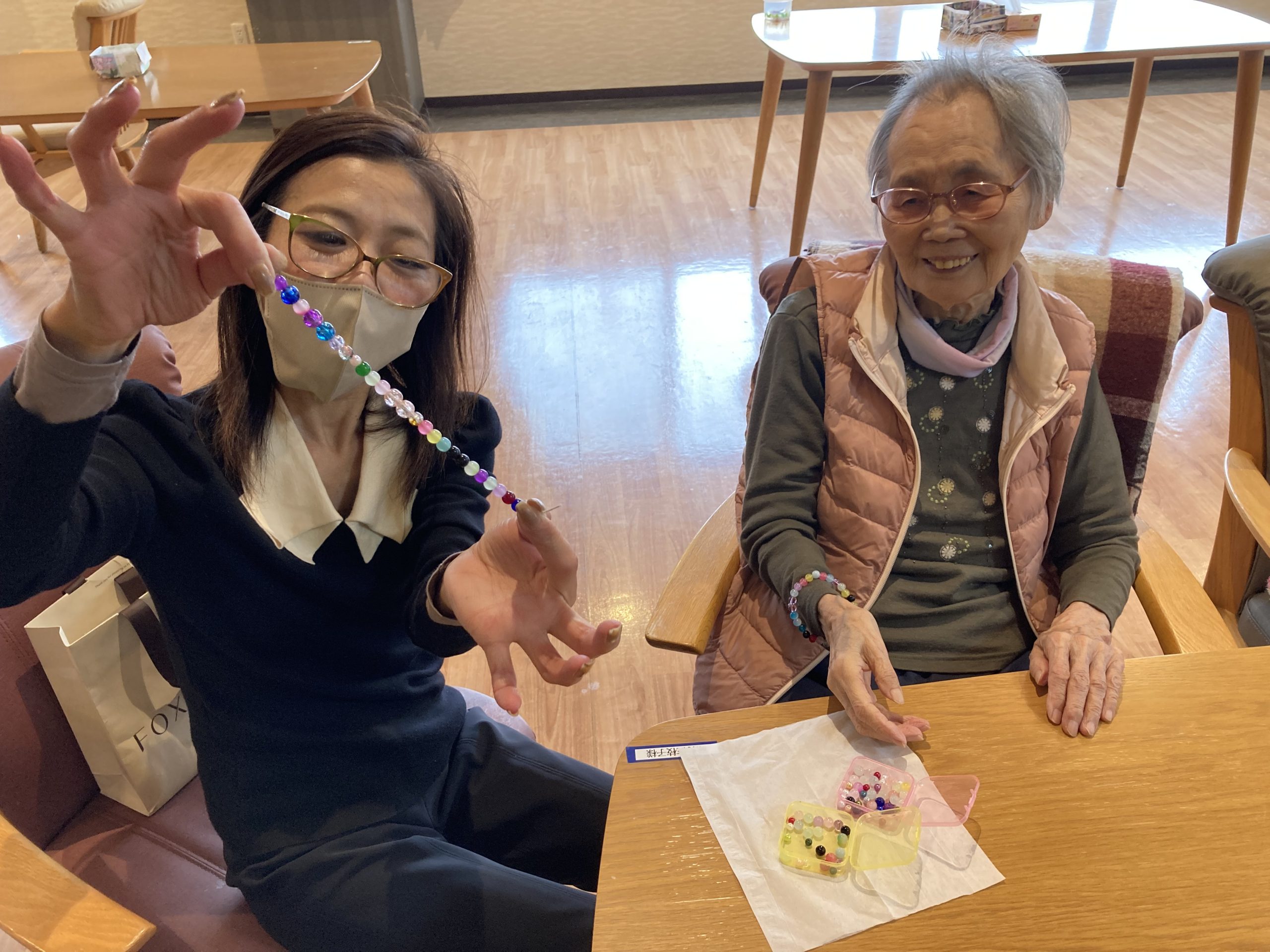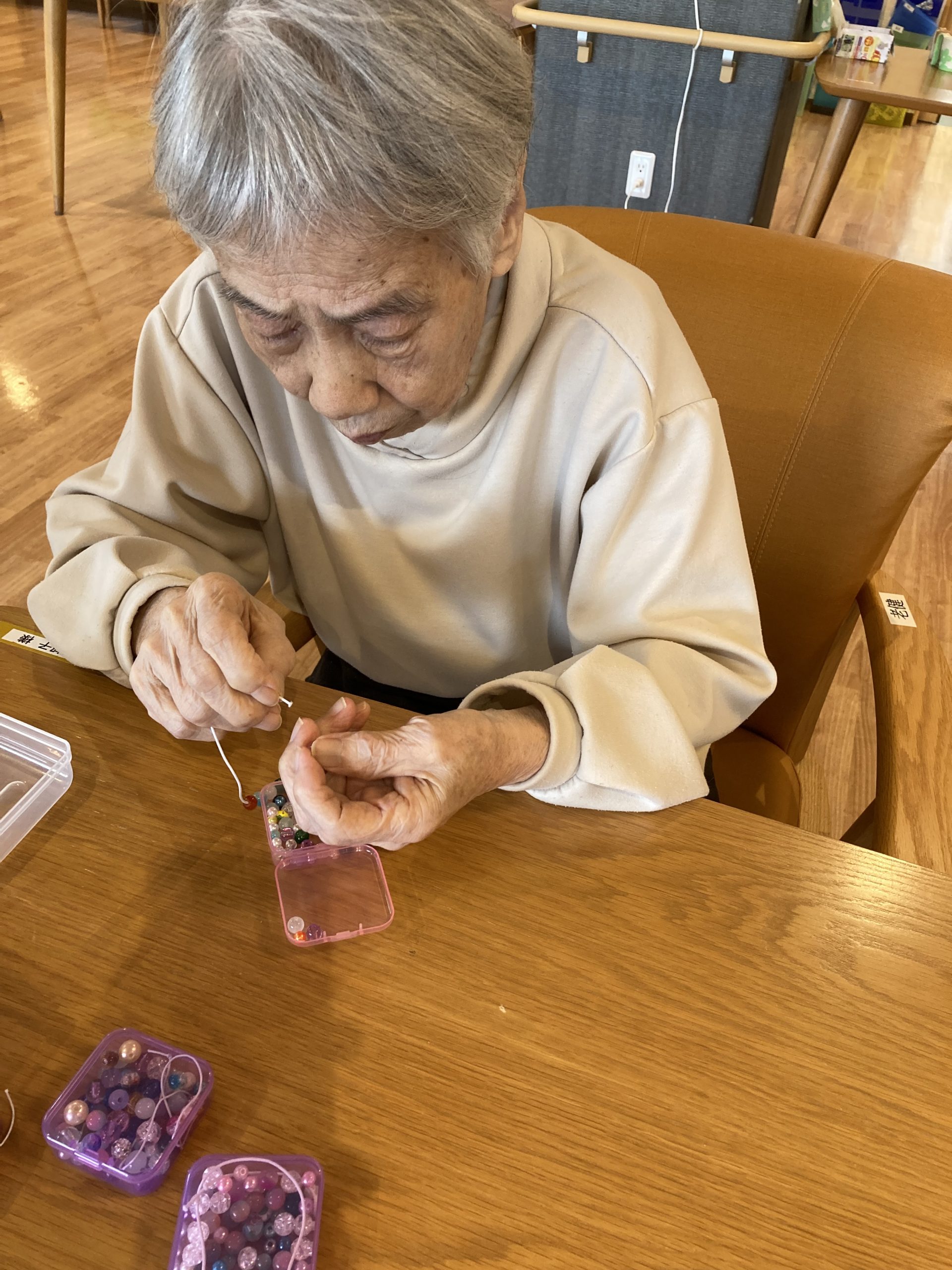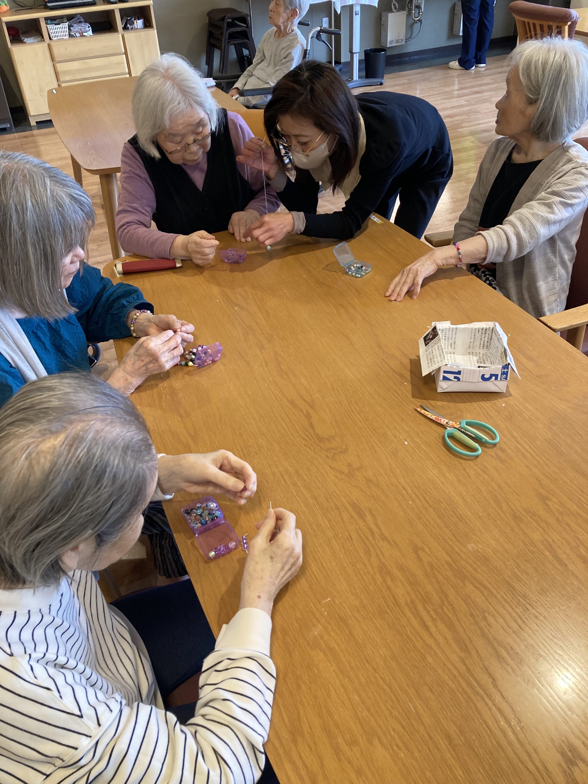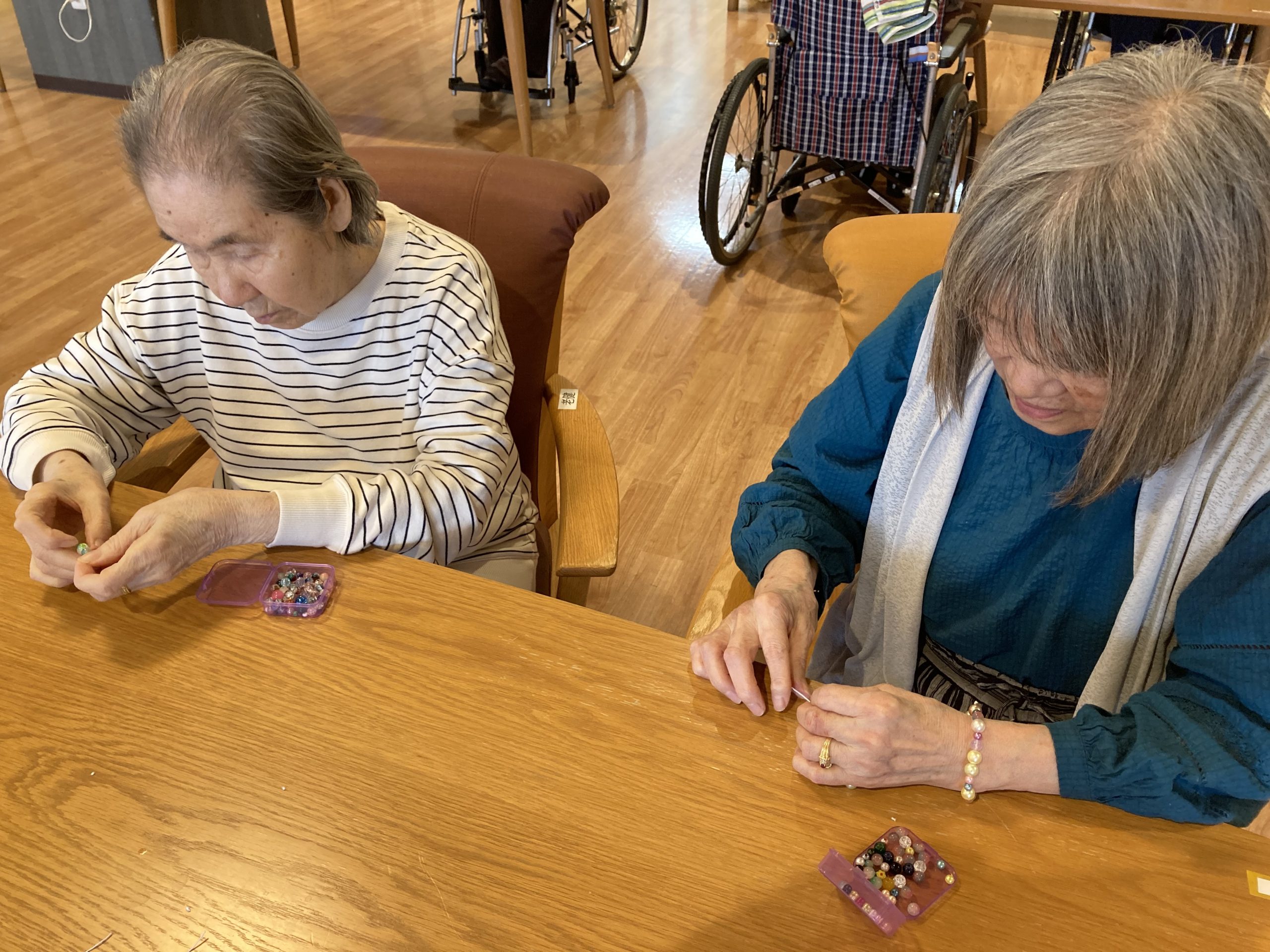 大小さまざまなビーズを紐へ通していく細やかな作業。「こんなに細かい作業、久しぶり。」と話しながら、皆さん一粒ずつ好みの色を選びながら丁寧に紐に通されていました。