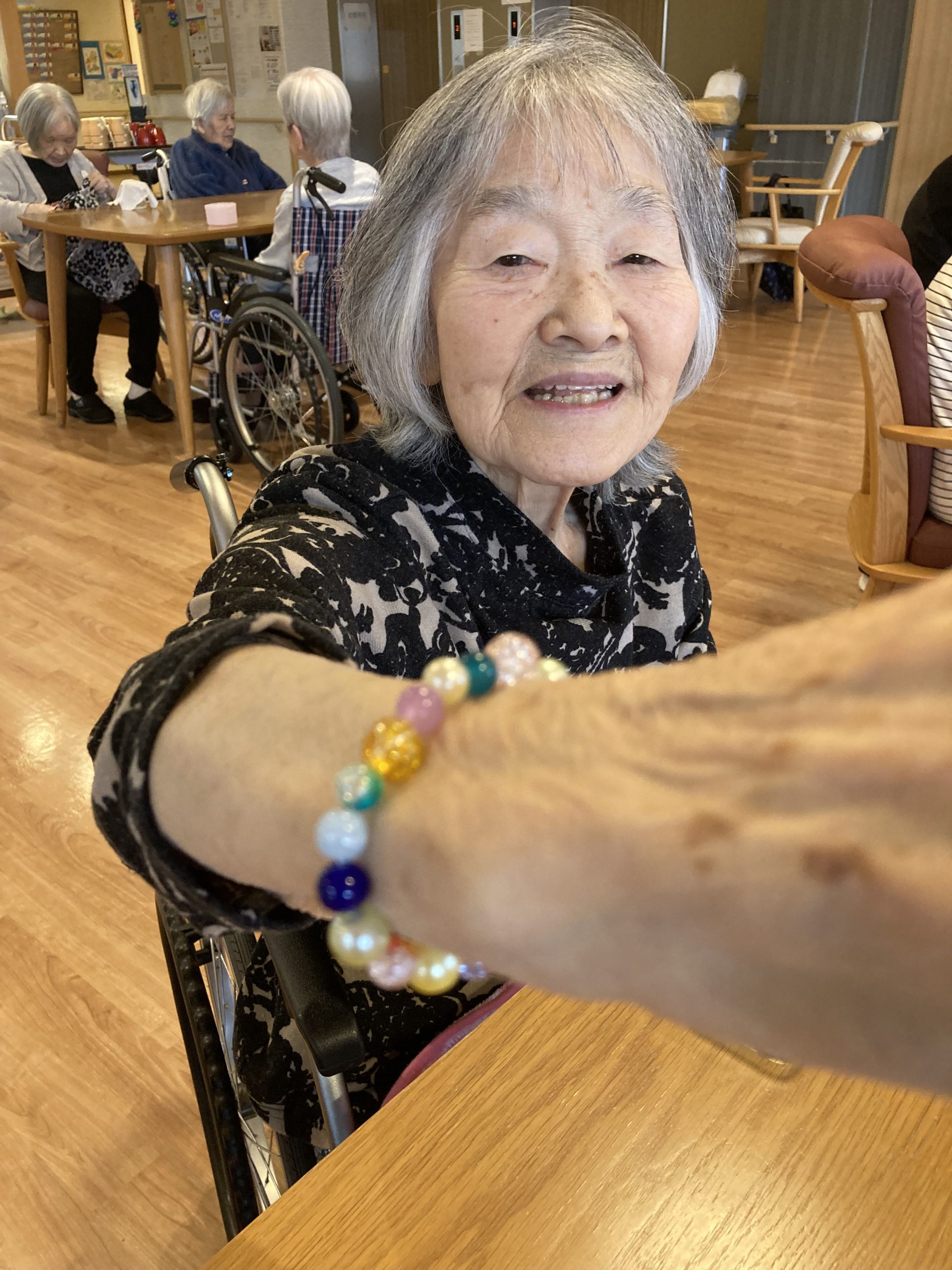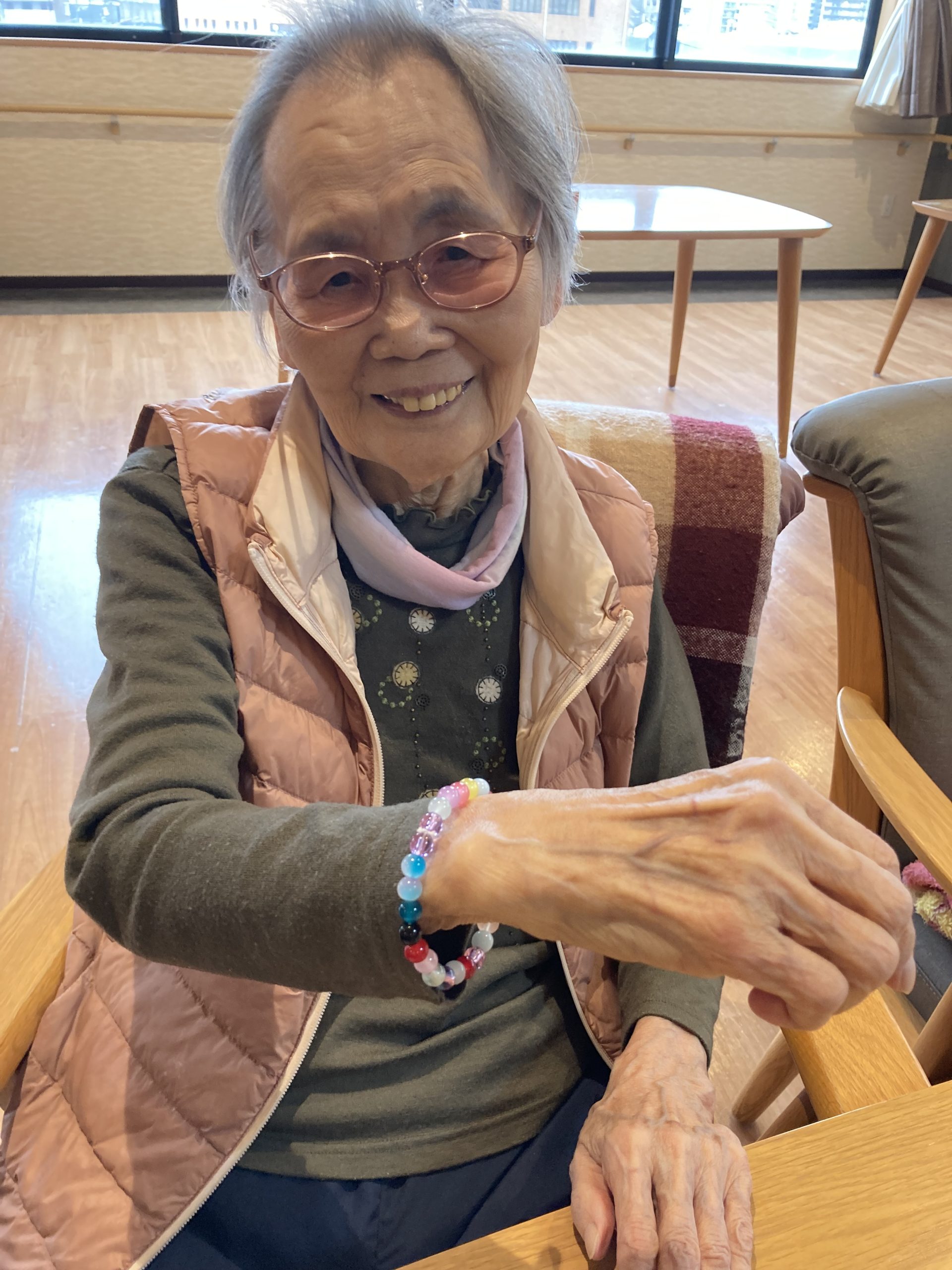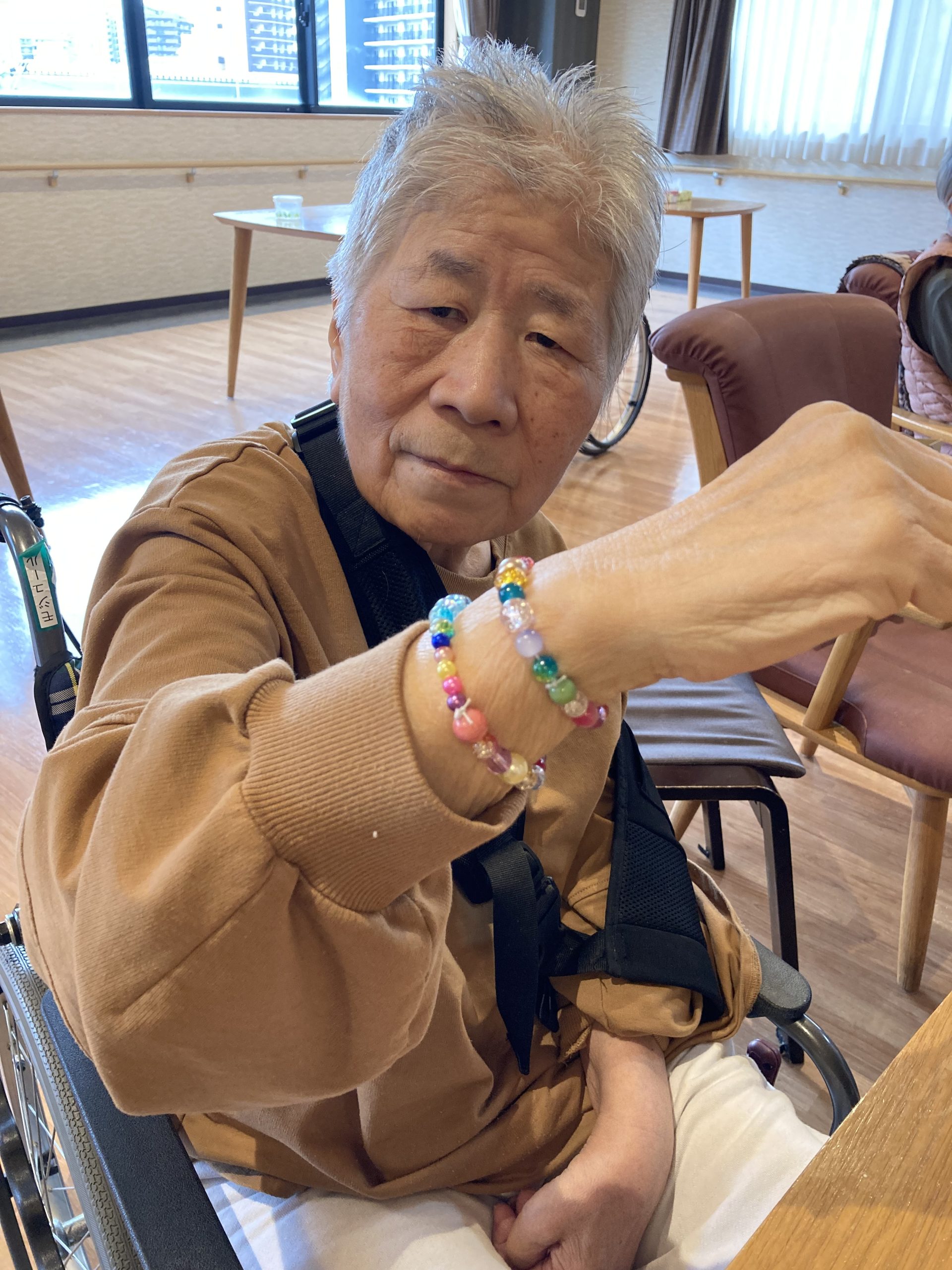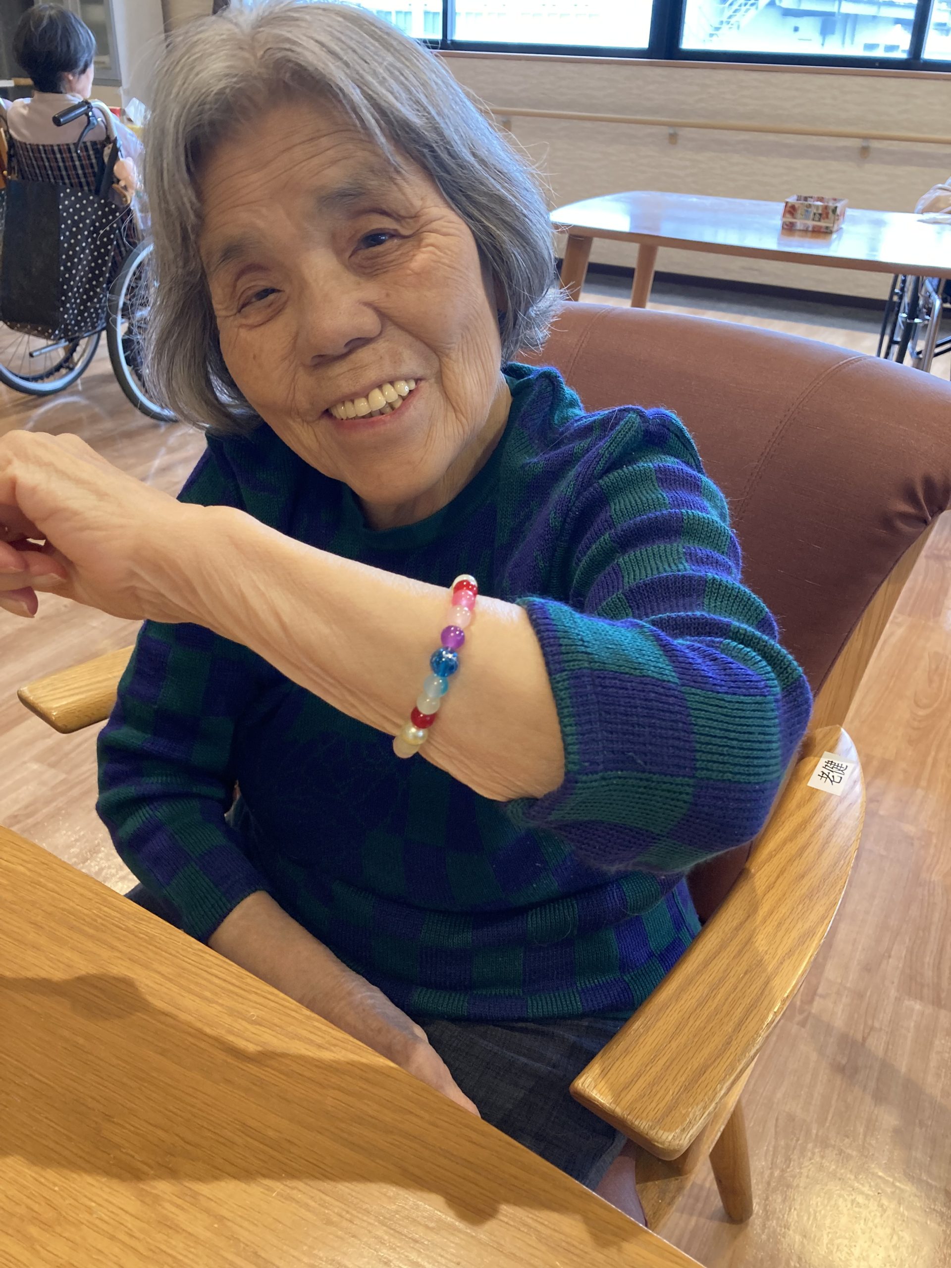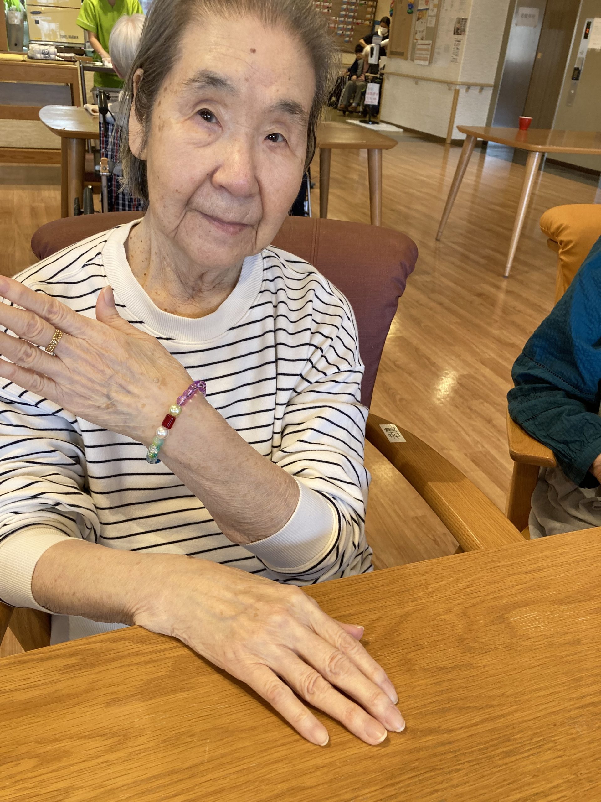 完成したブレスレットは、手首にぴったり合うように調整され、前回も参加された利用者さんは、「前よりもうまくできた。」と話されていました。