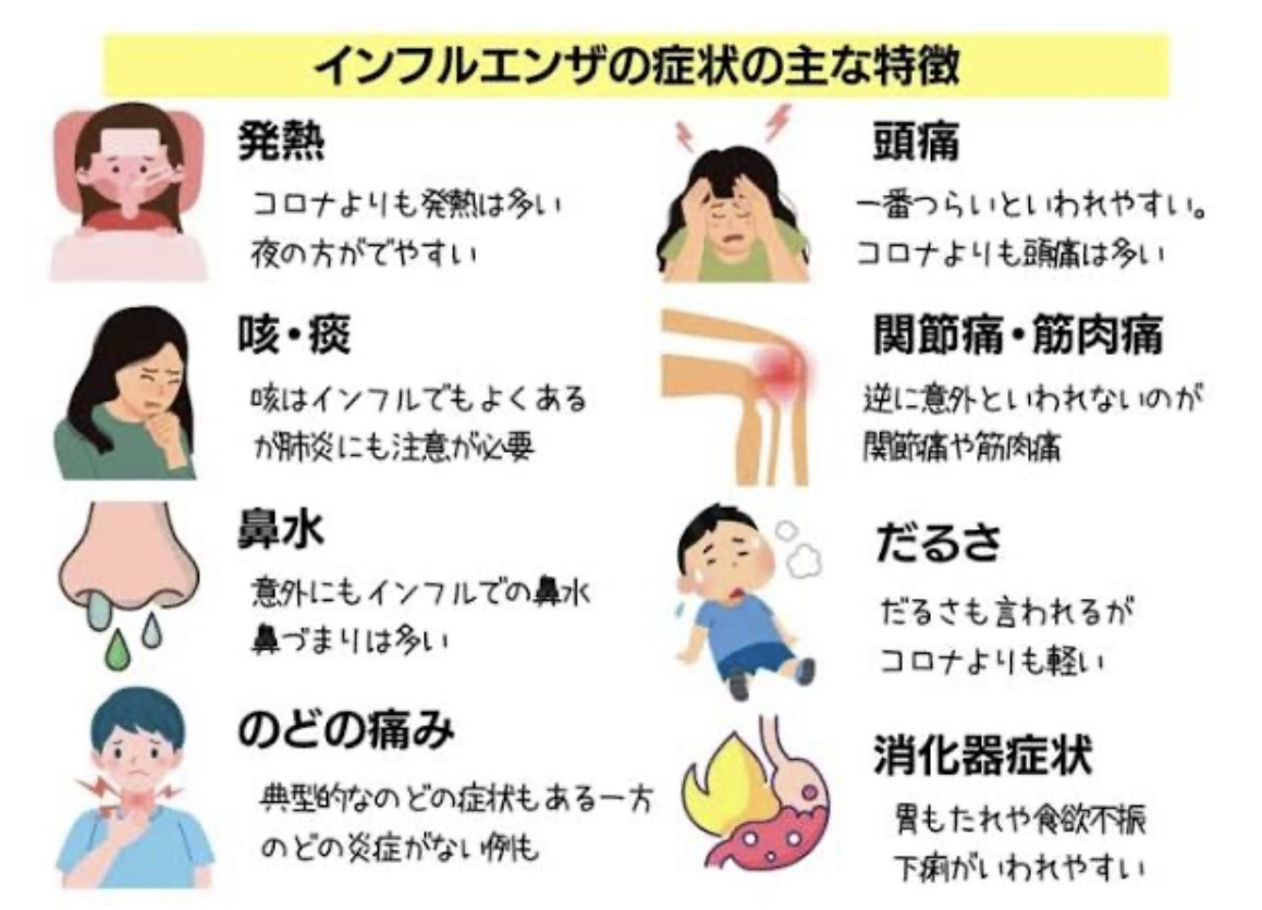 突然の高熱、強い悪寒、全身の倦怠感、頭痛、関節痛等の