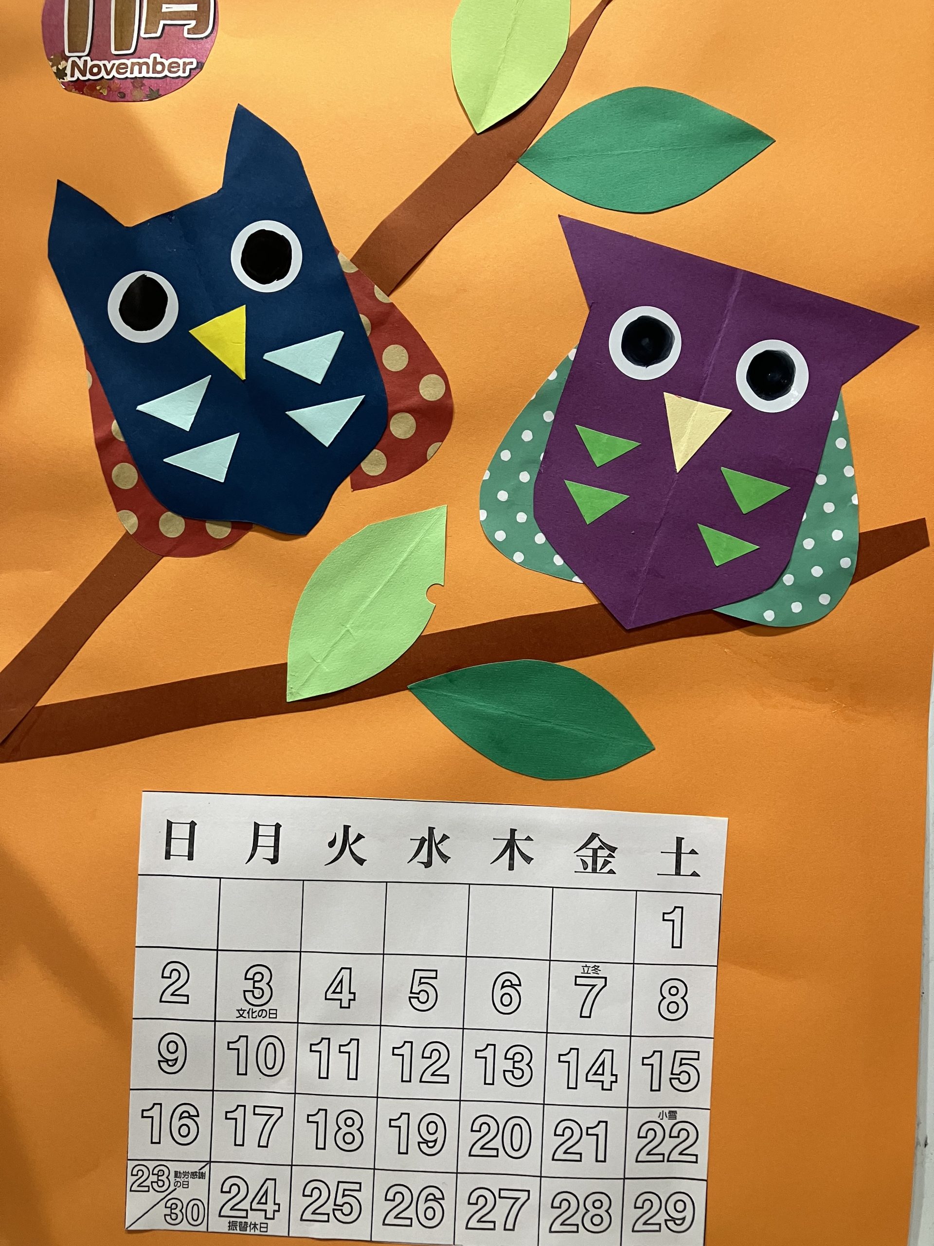 10月のカレンダーは 落ち着いた色合いが可愛いフクロウデザインでした(*´艸`*)