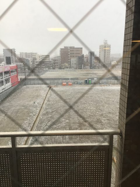 風が強く吹雪いていて、隣の工事現場やベランダにうっすら雪が積もっていました!