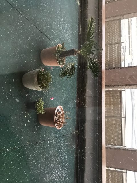 風が強く吹雪いていて、隣の工事現場やベランダにうっすら雪が積もっていました!