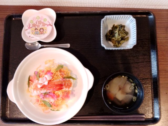 昼食は彩りよく盛り付けられたひなちらし寿司でした。
