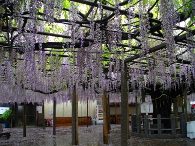 ケアハウスでは毎週木曜日に買い物バスを出しています。 5月12日もカワベ山崎店へ買い物に行きました。行きのバスの中では皆さんわい談に花を咲かせ、帰りは少し寄り道をして大歳神社の藤を見てきました。あいにくの雨で車窓から香しい花のにおいと美しい藤の花を見て うっとり・・・・ 去年より花は少なく短めでしたが、美しい光景でした