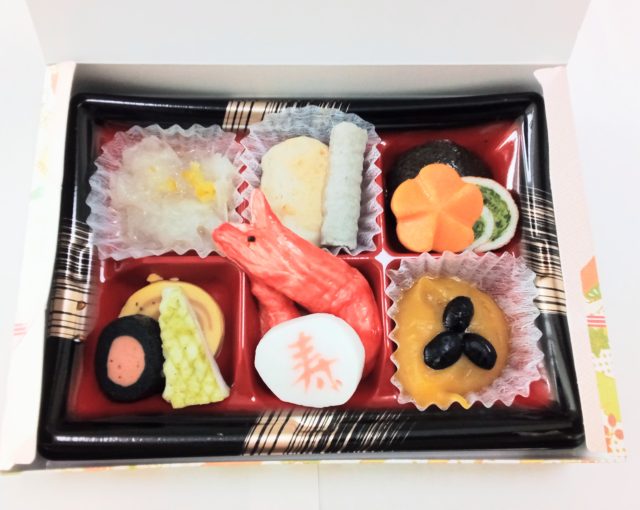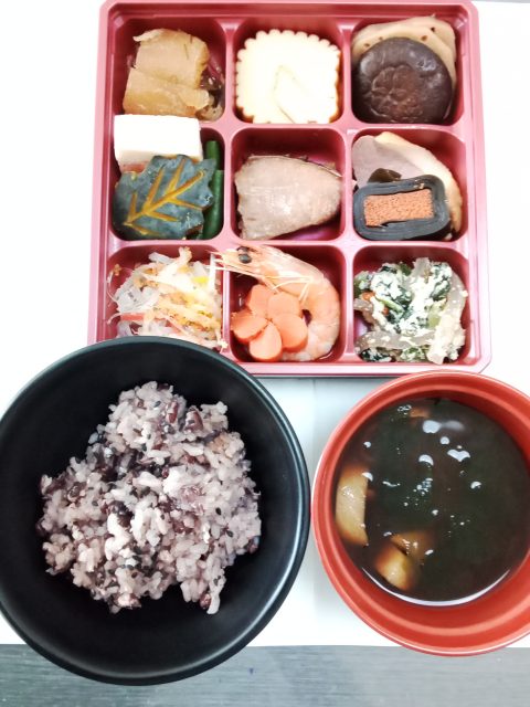 赤飯やおせち料理(右端は、硬い物が食べにくい方用の柔らかおせちです)、