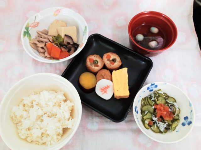 お粥に伊達巻きなどのおせち料理とお雑煮(すまし汁や白みそ)でした。