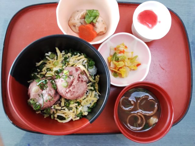 ネギトロ丼、がんもの炊き合わせ、白菜のゆず和え、レアチーズケーキと、
