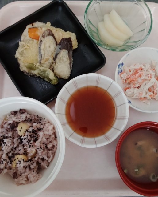 栗と小豆ご飯、精進揚げ、ささみのごまマヨ和え、アサリの味噌汁、梨
