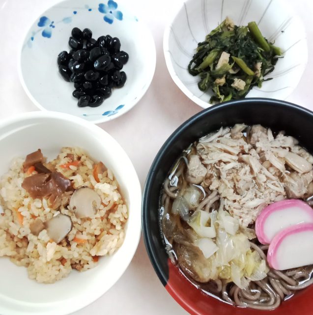松茸ご飯、鶏そば、黒豆、菊菜とあげの生姜和え