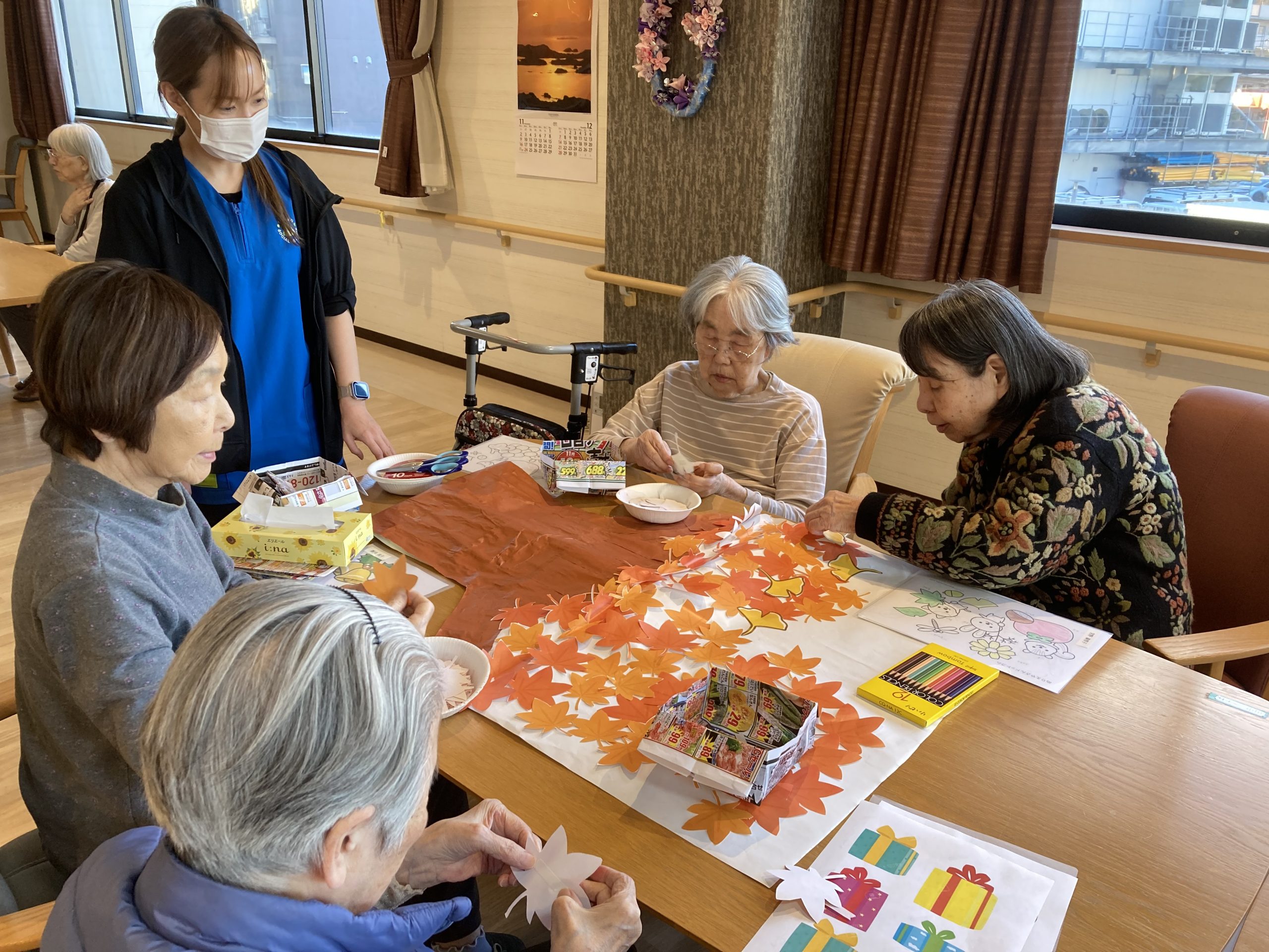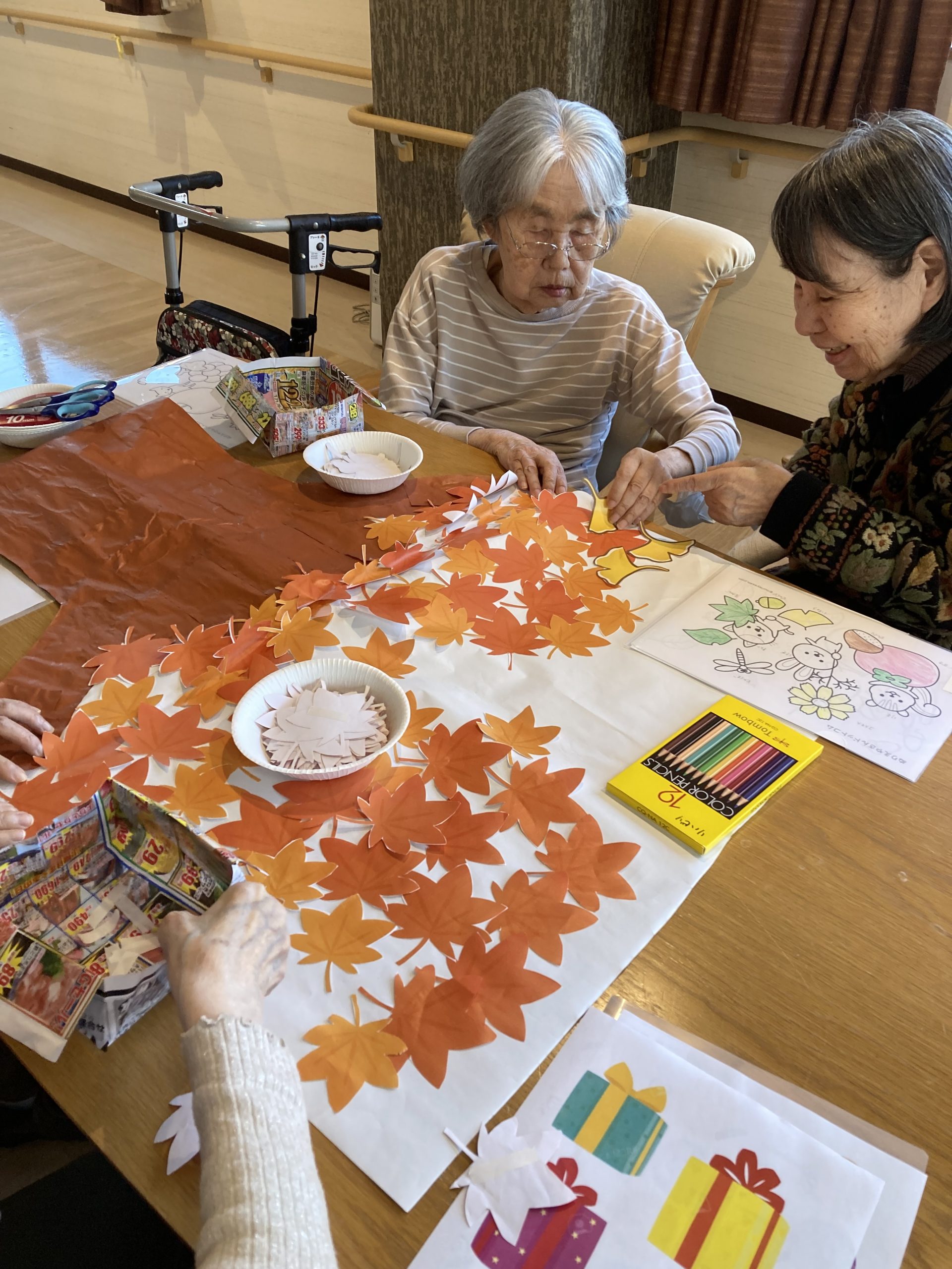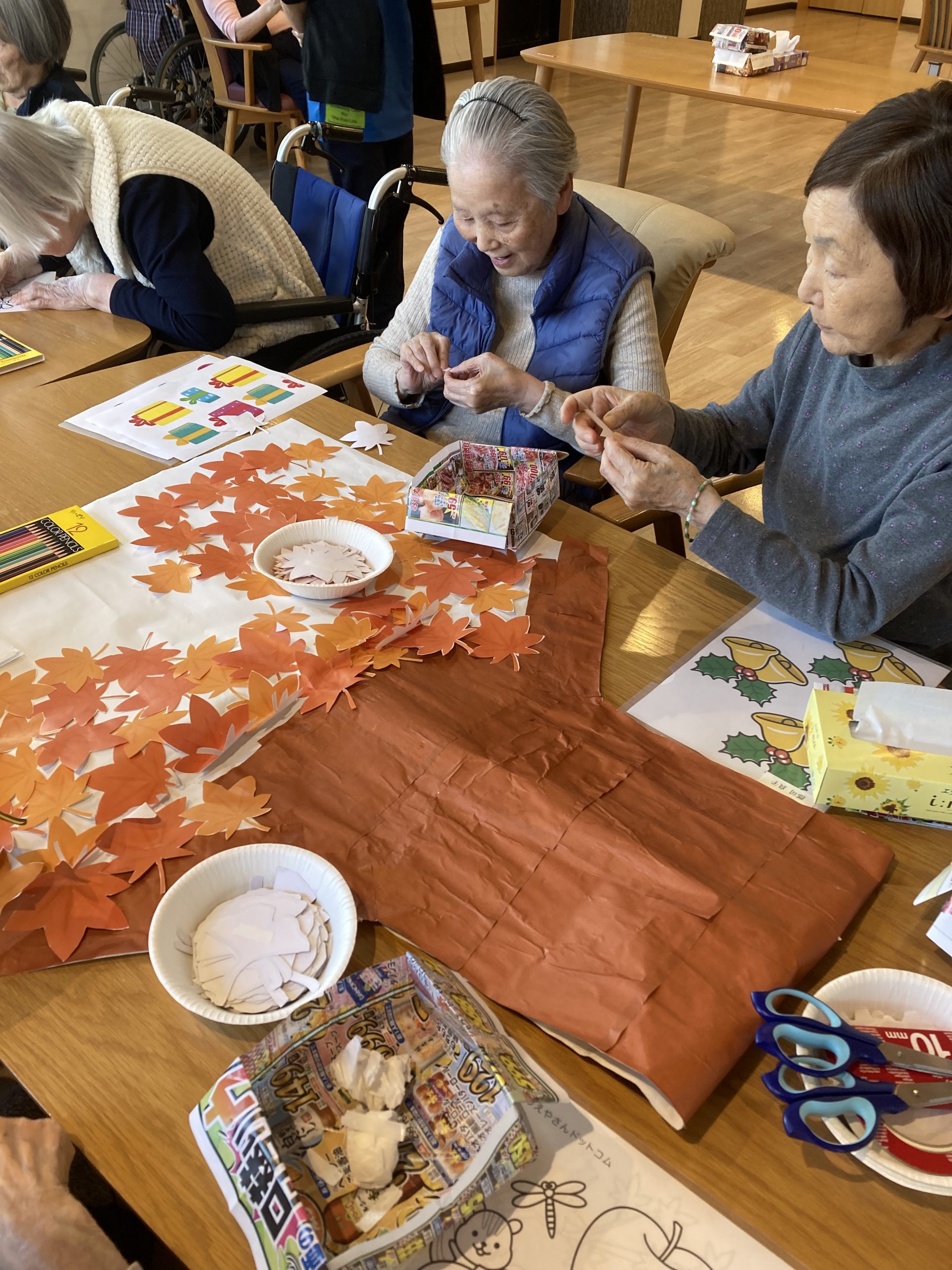 「きれいな色ね。」との会話が生まれ、秋の季節感を楽しみながら手先を動かすことで、会話や笑顔が自然に広がる温かい時間でした。