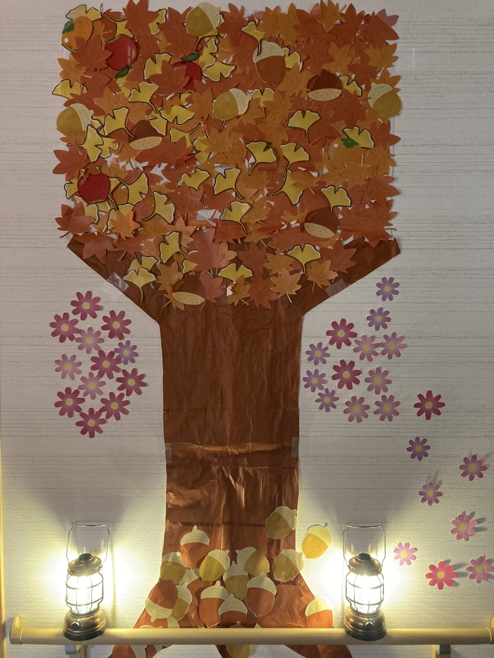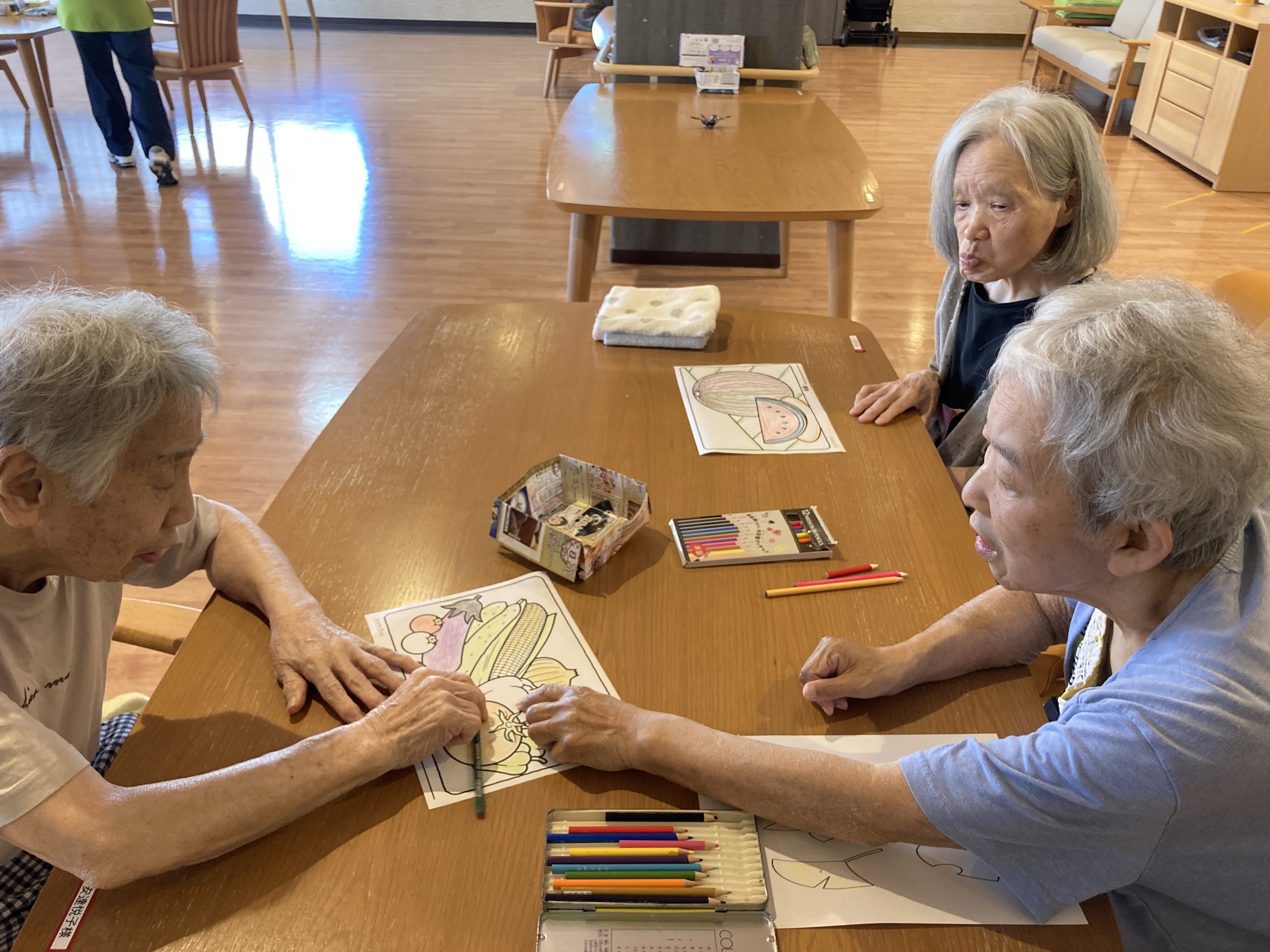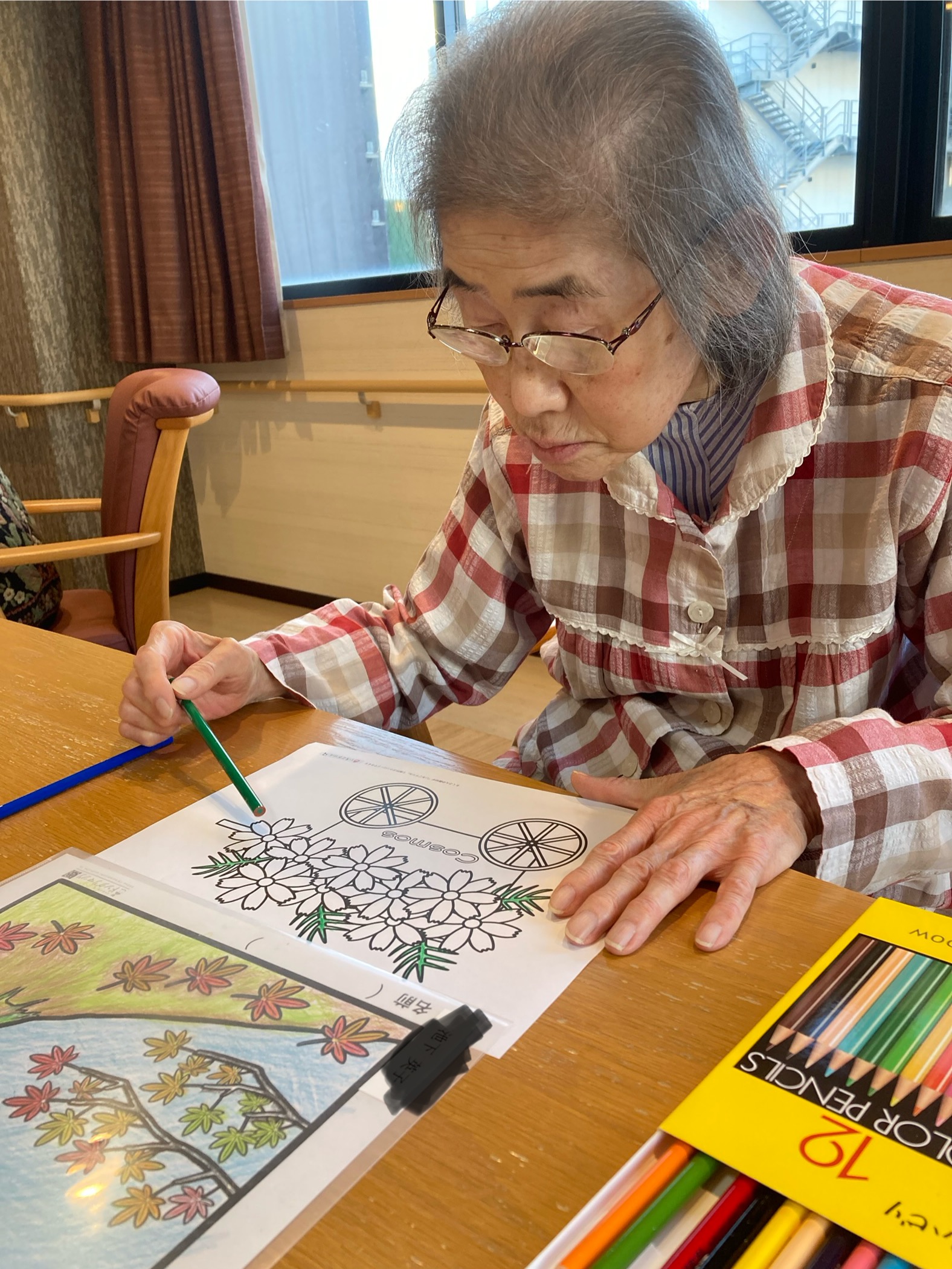 「きれいな色ね。」との会話が生まれ、秋の季節感を楽しみながら手先を動かすことで、会話や笑顔が自然に広がる温かい時間でした。