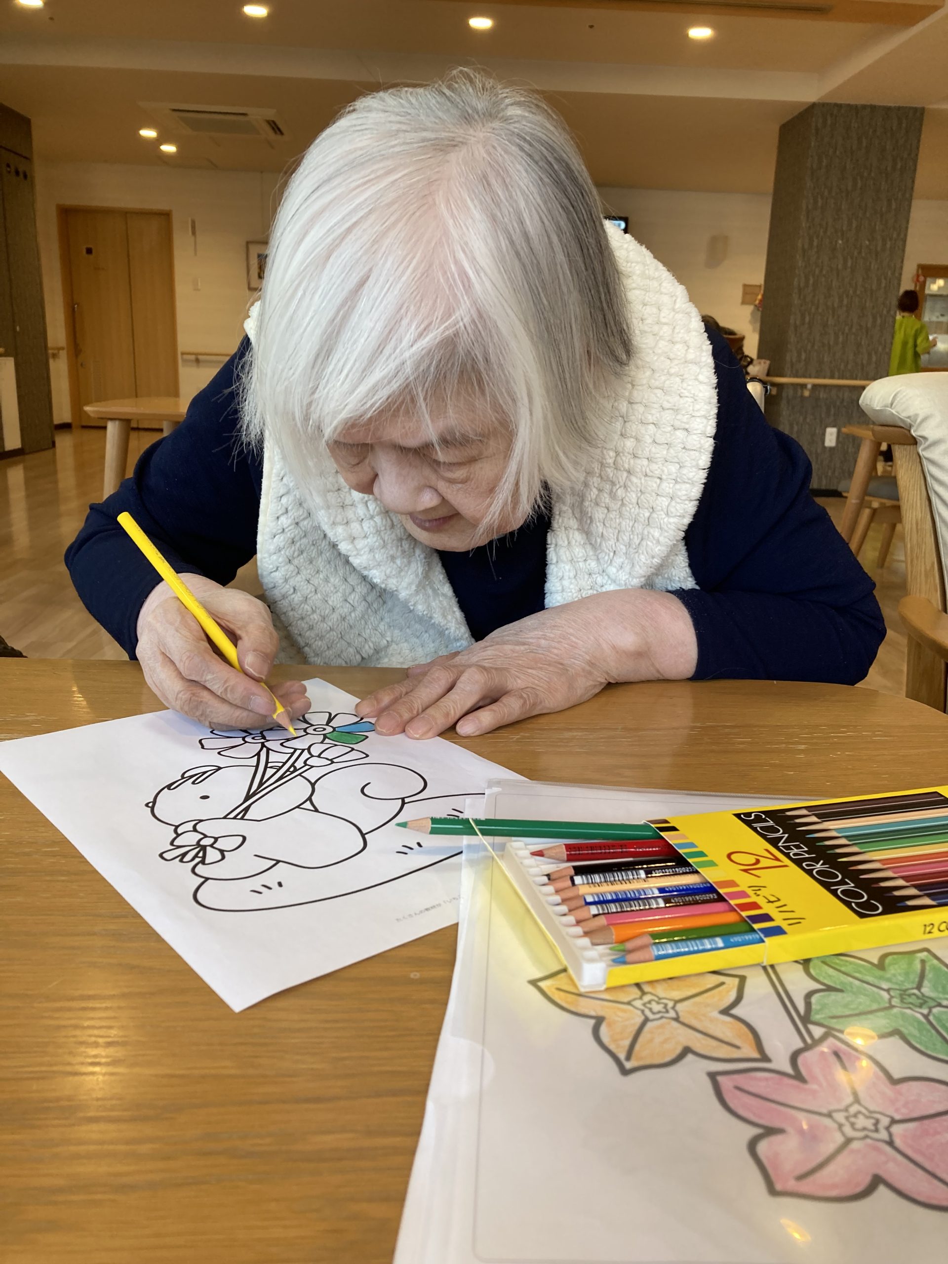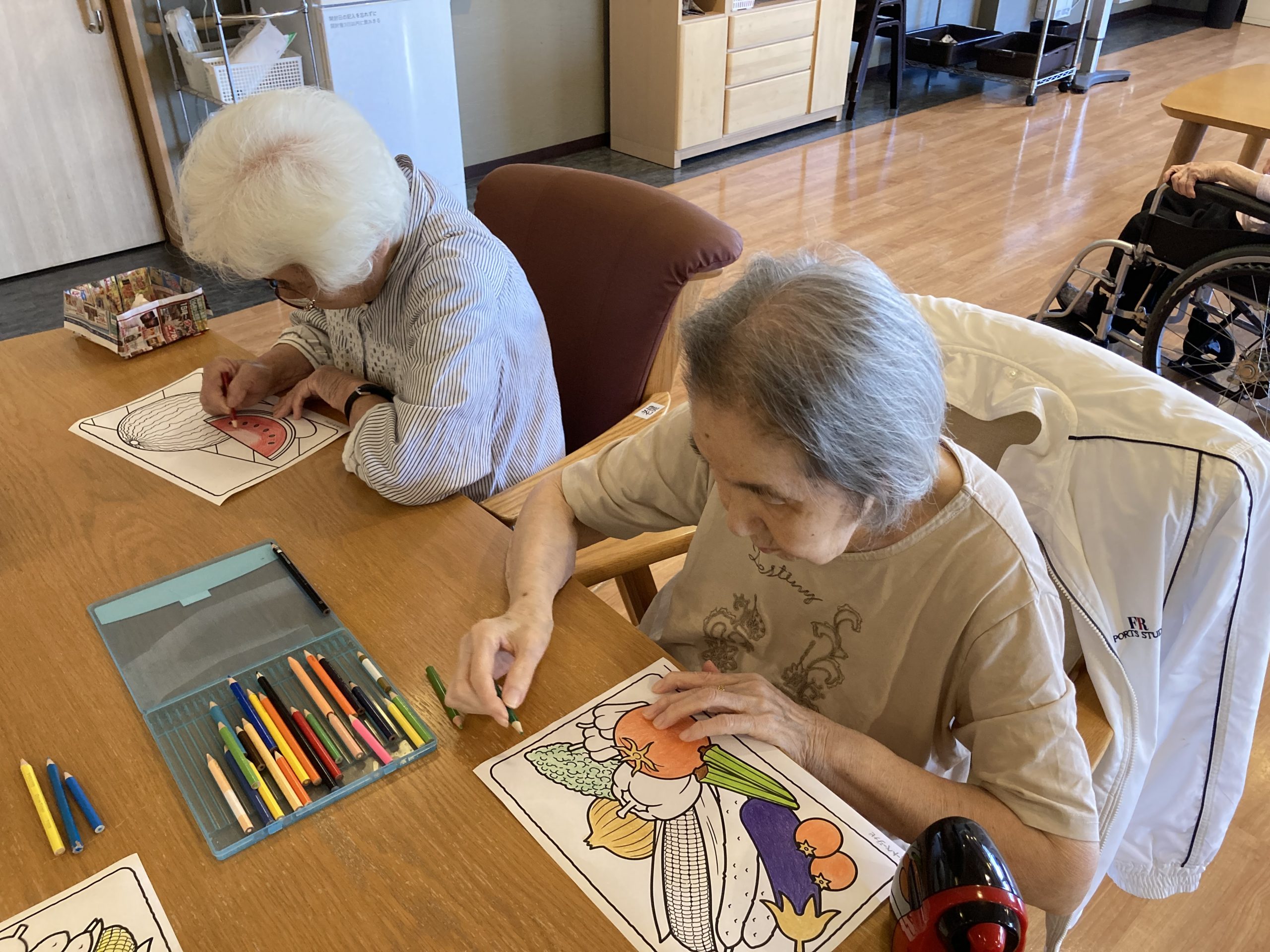 好きな色鉛筆を手に取り、花や野菜、風景の絵柄に思い思いの色を重ねていく姿は、とても真剣でした。