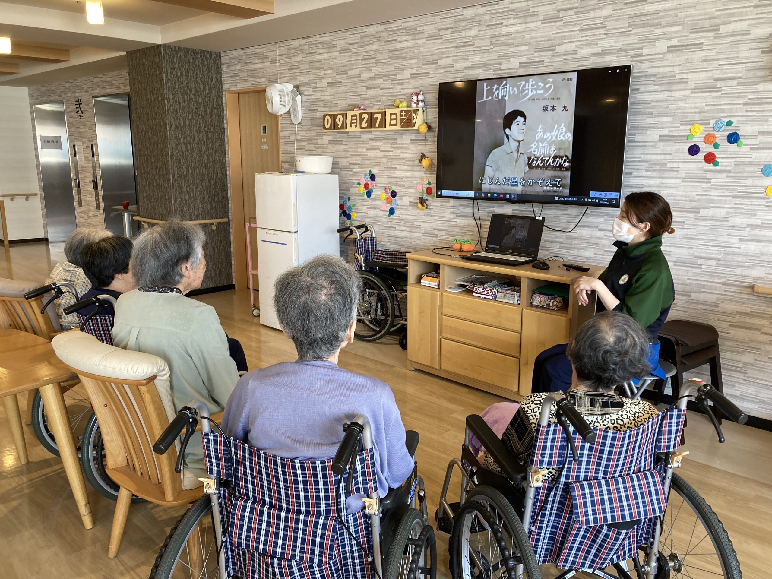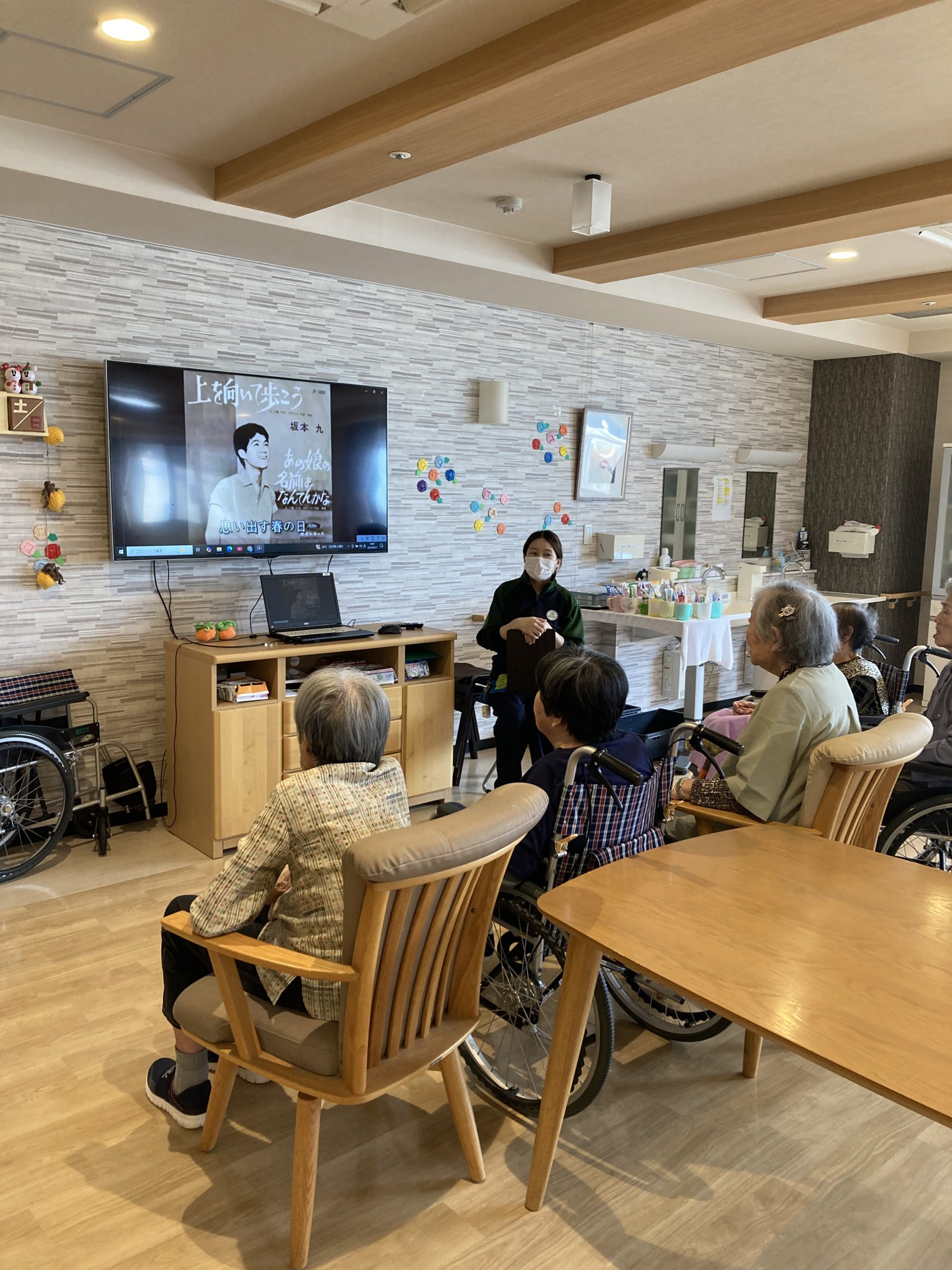 「上を向いて歩こう~♪」イントロが流れると懐かしい歌詞に合わせて、自然に口ずさむ声が広がり笑顔も生まれていました。