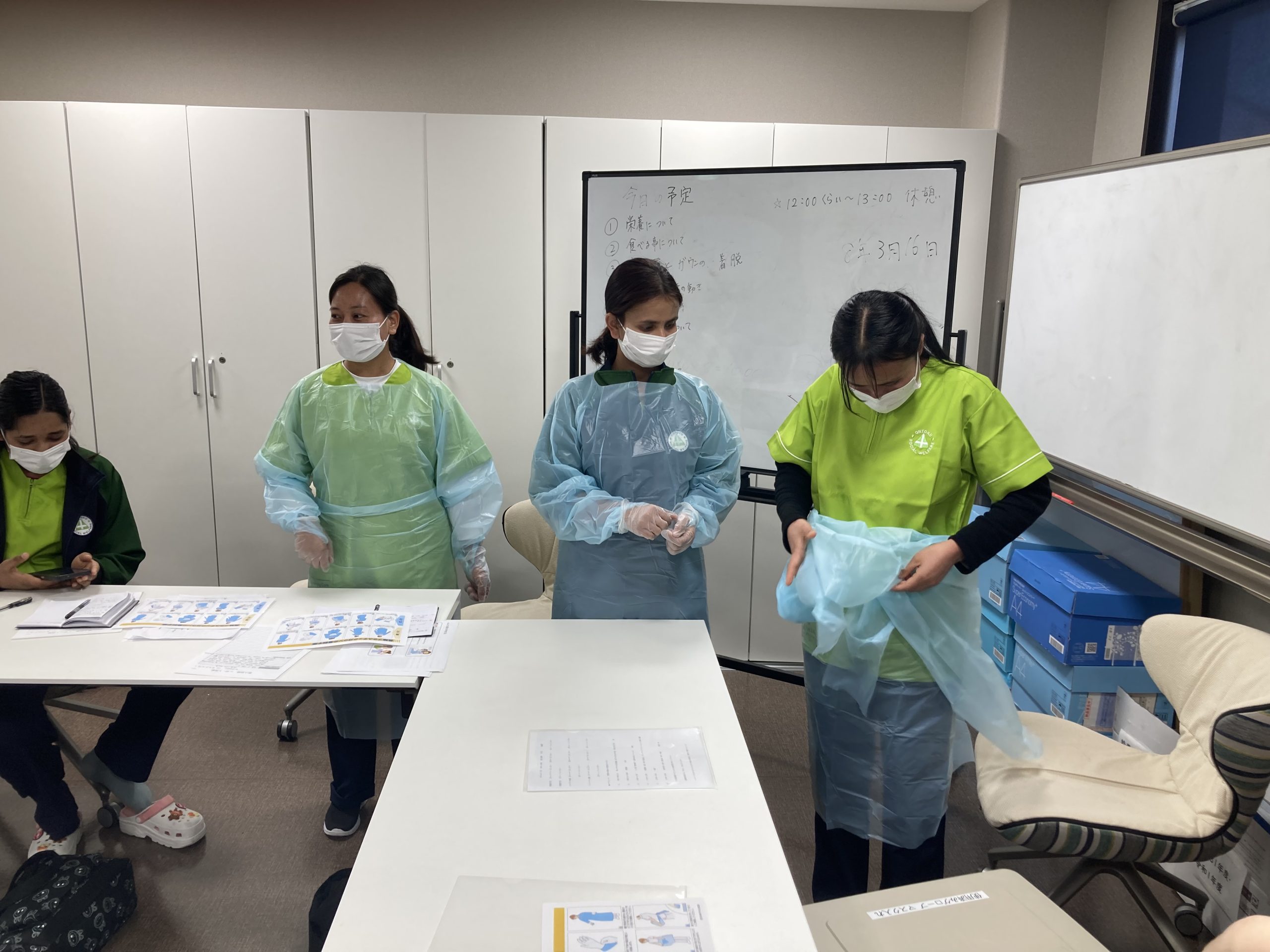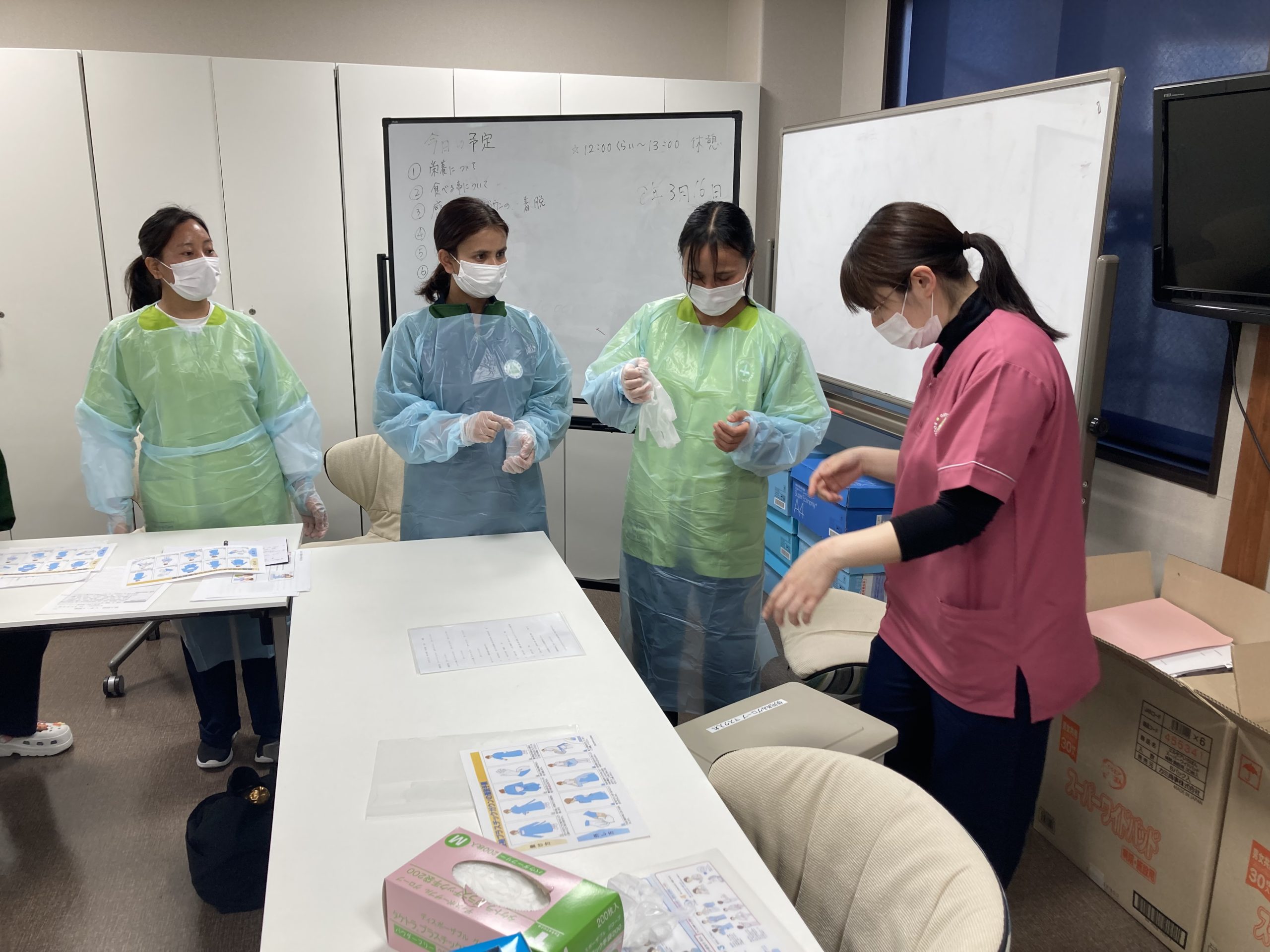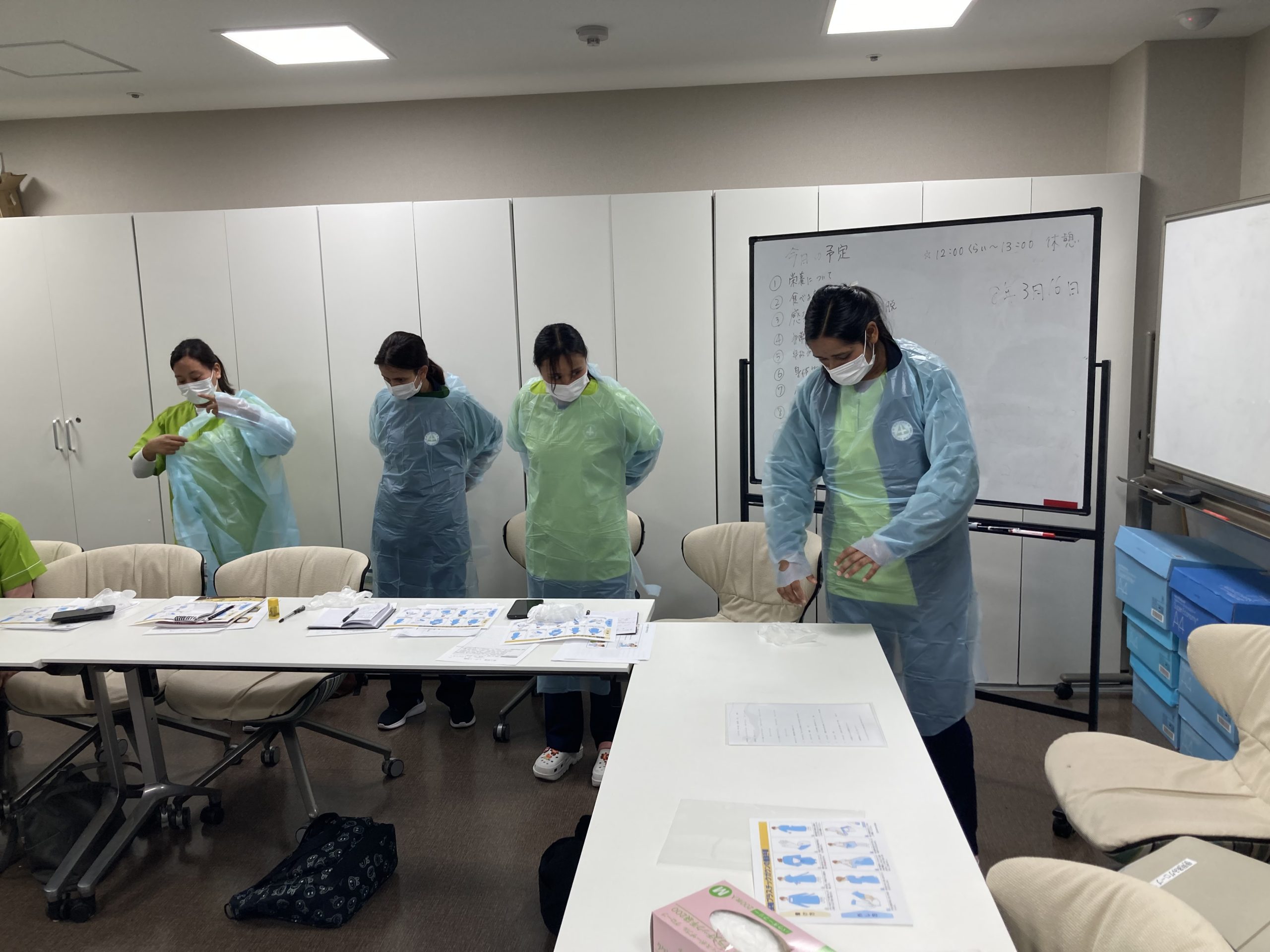 手袋・ガウン・マスクの着脱、汚染区域と清潔区域の考え方、実際に防護具を身につけ、お互いに確認し合いながら取り組まれました。