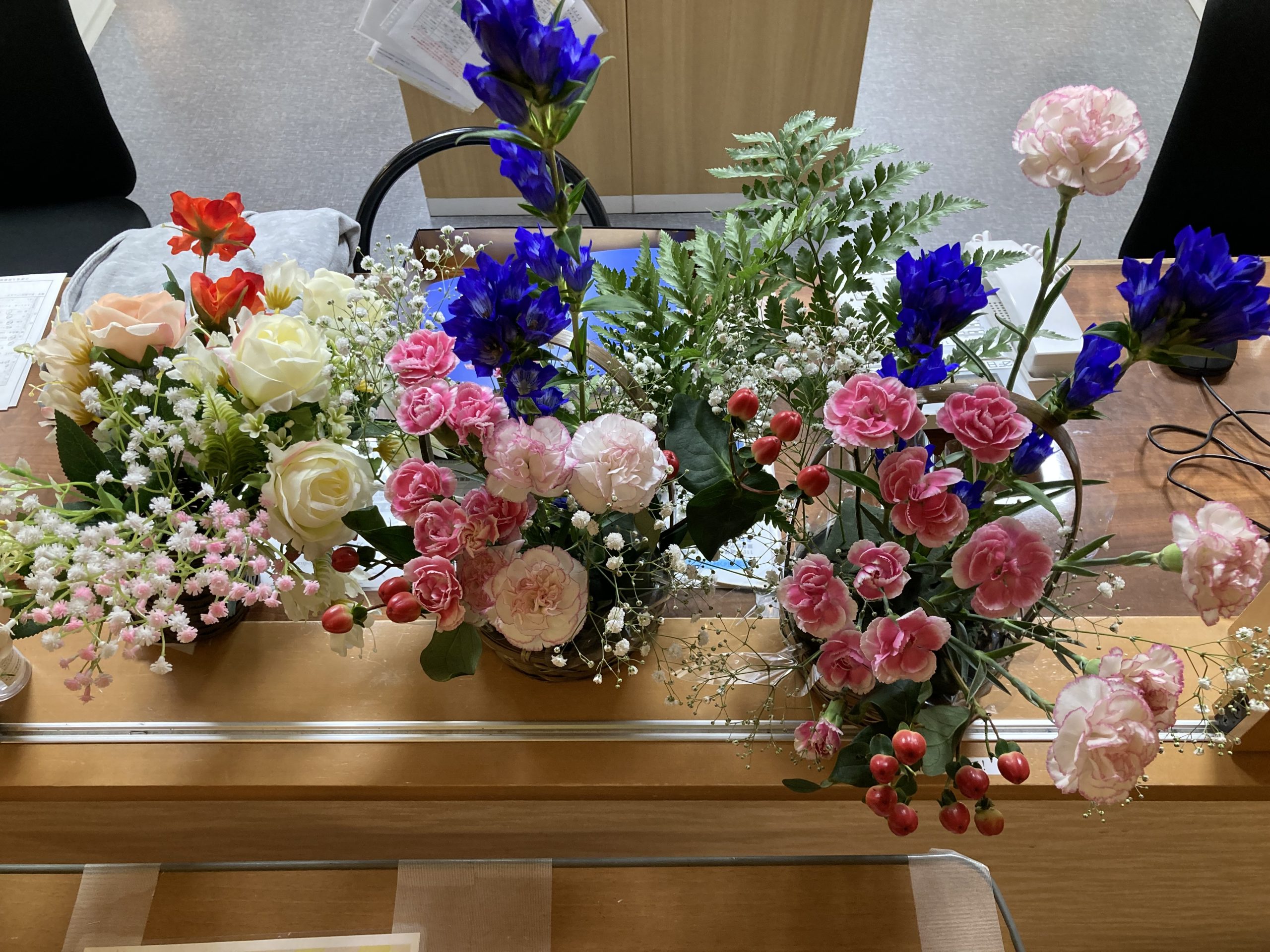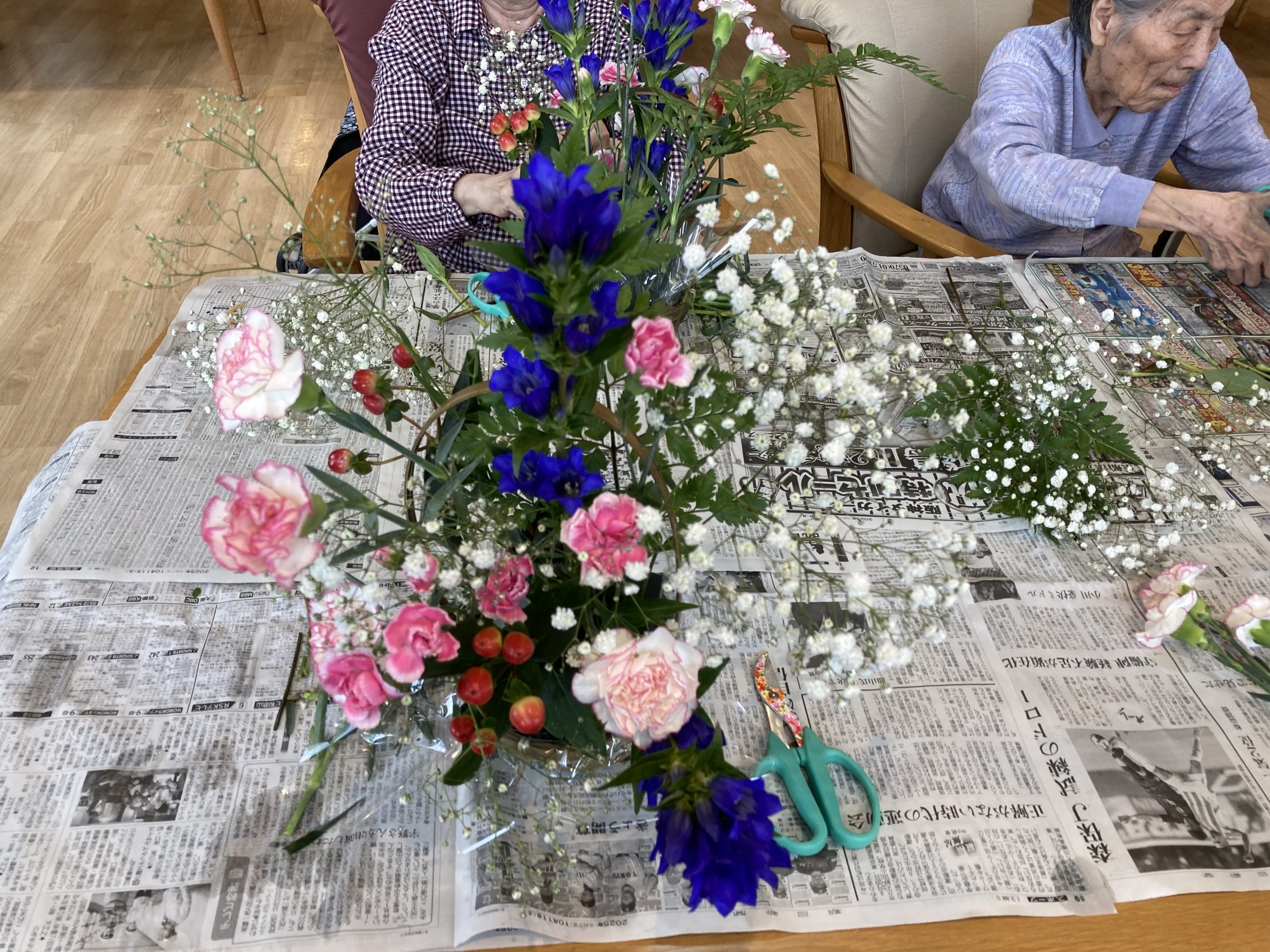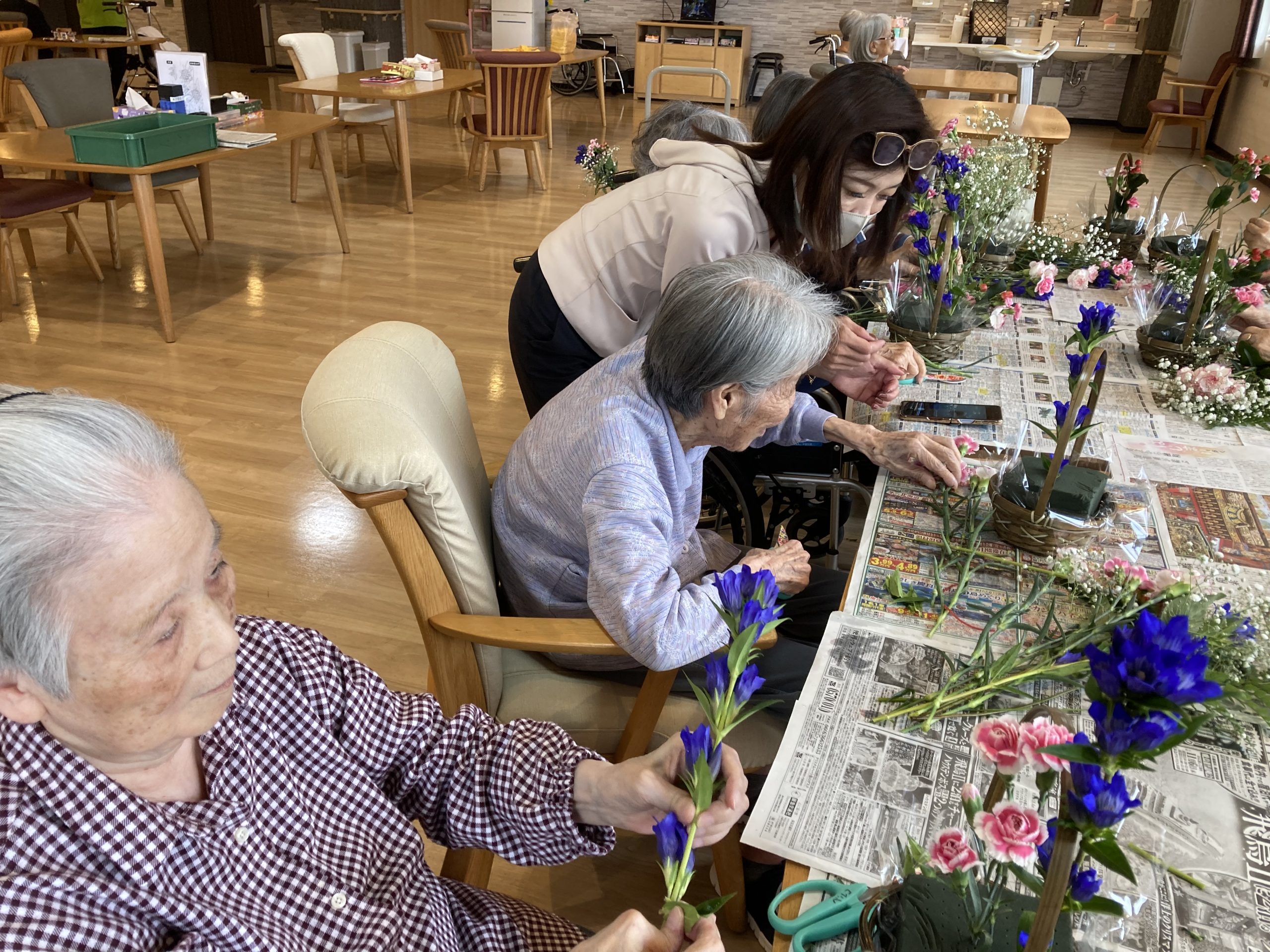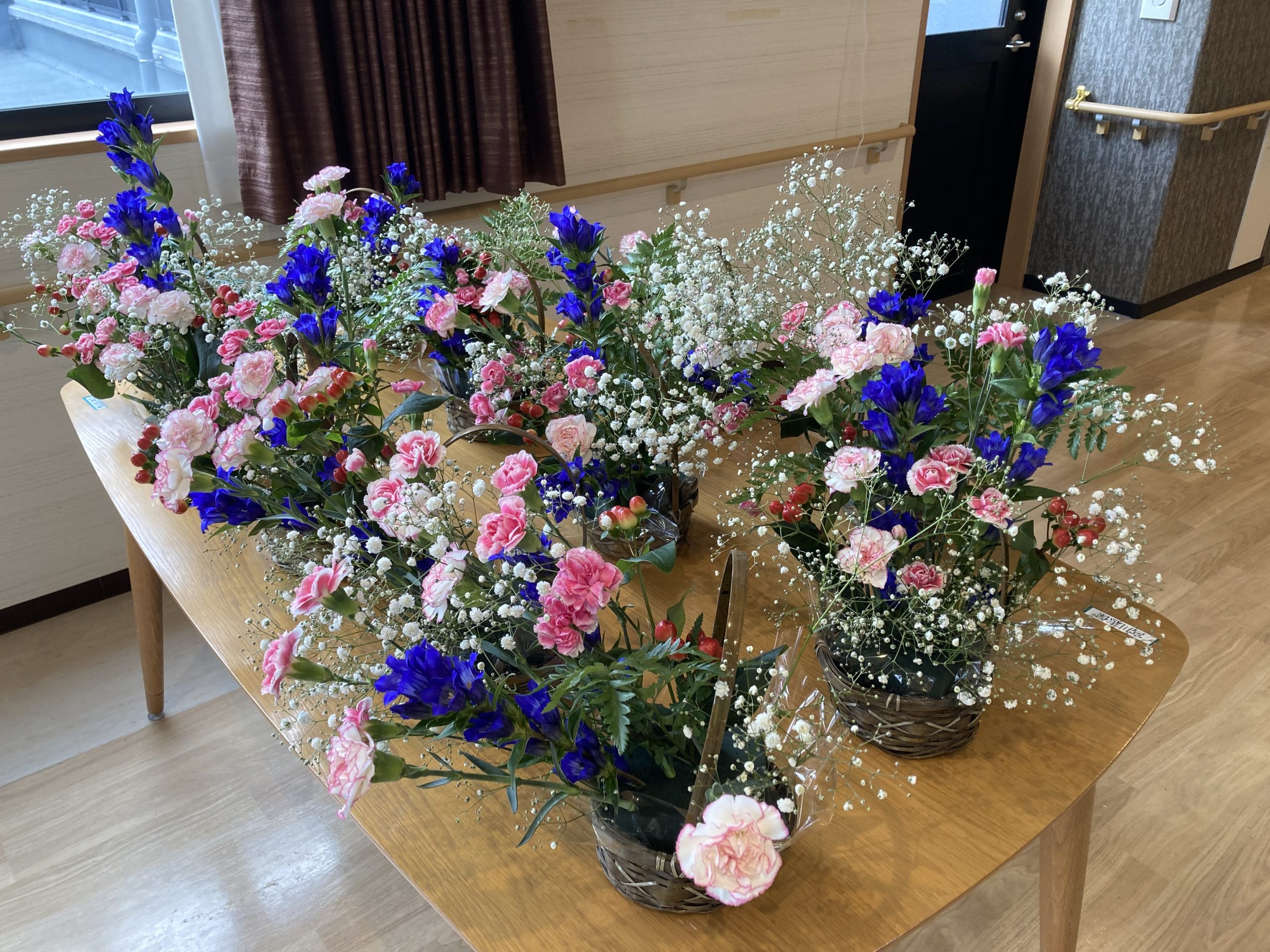 テーブルの上には、色とりどりの季節の花々(カーネーション、カスミソウ、リンドウ、ヒペリカム)。利用者の皆様は、花の香りや手触りを楽しみながら、思い思いのアレンジメントに取り組まれました。