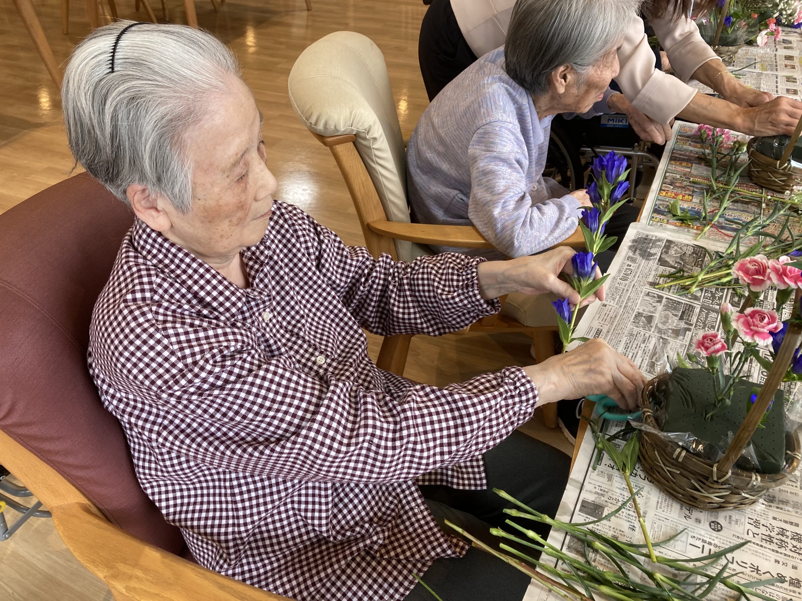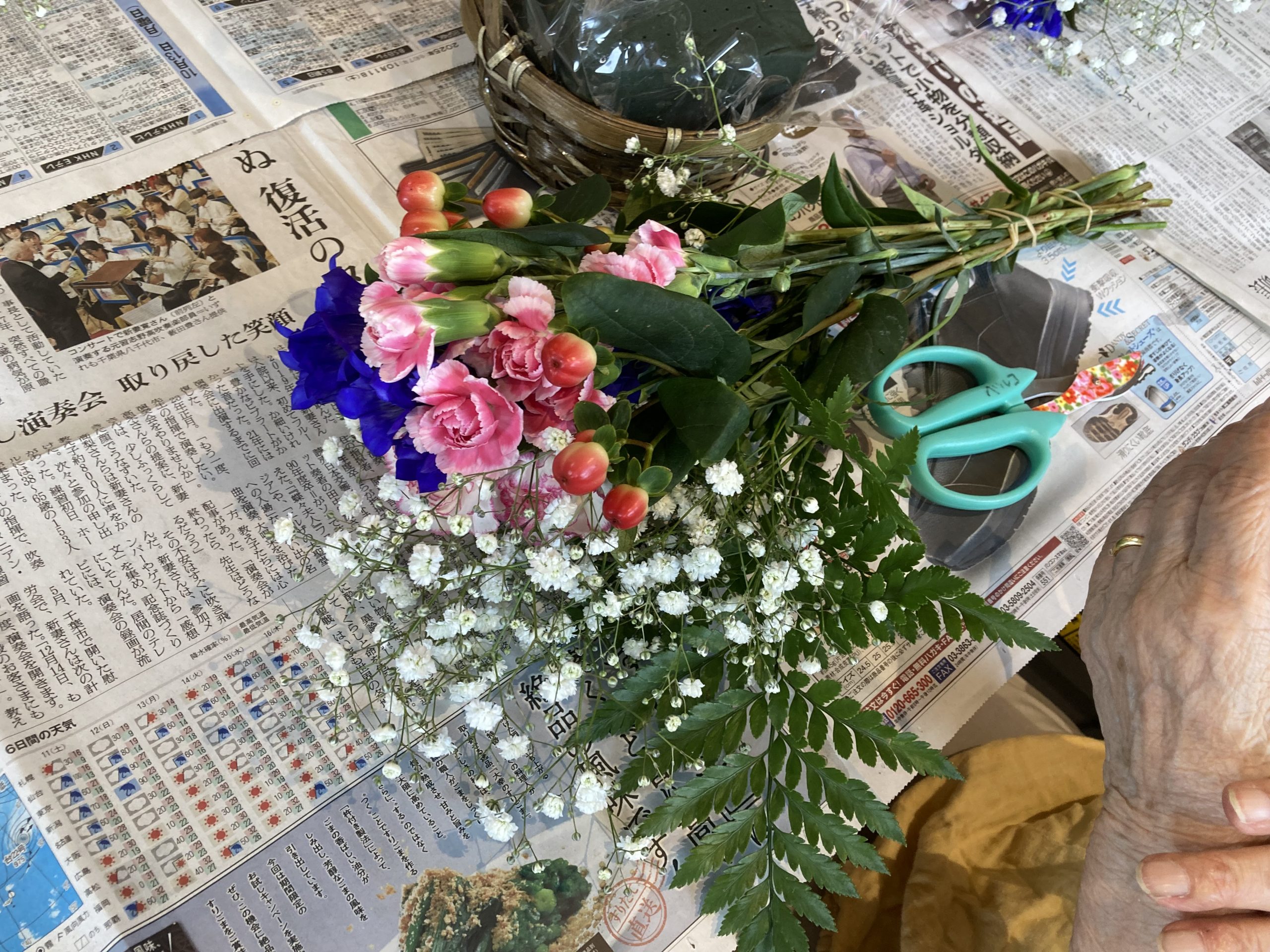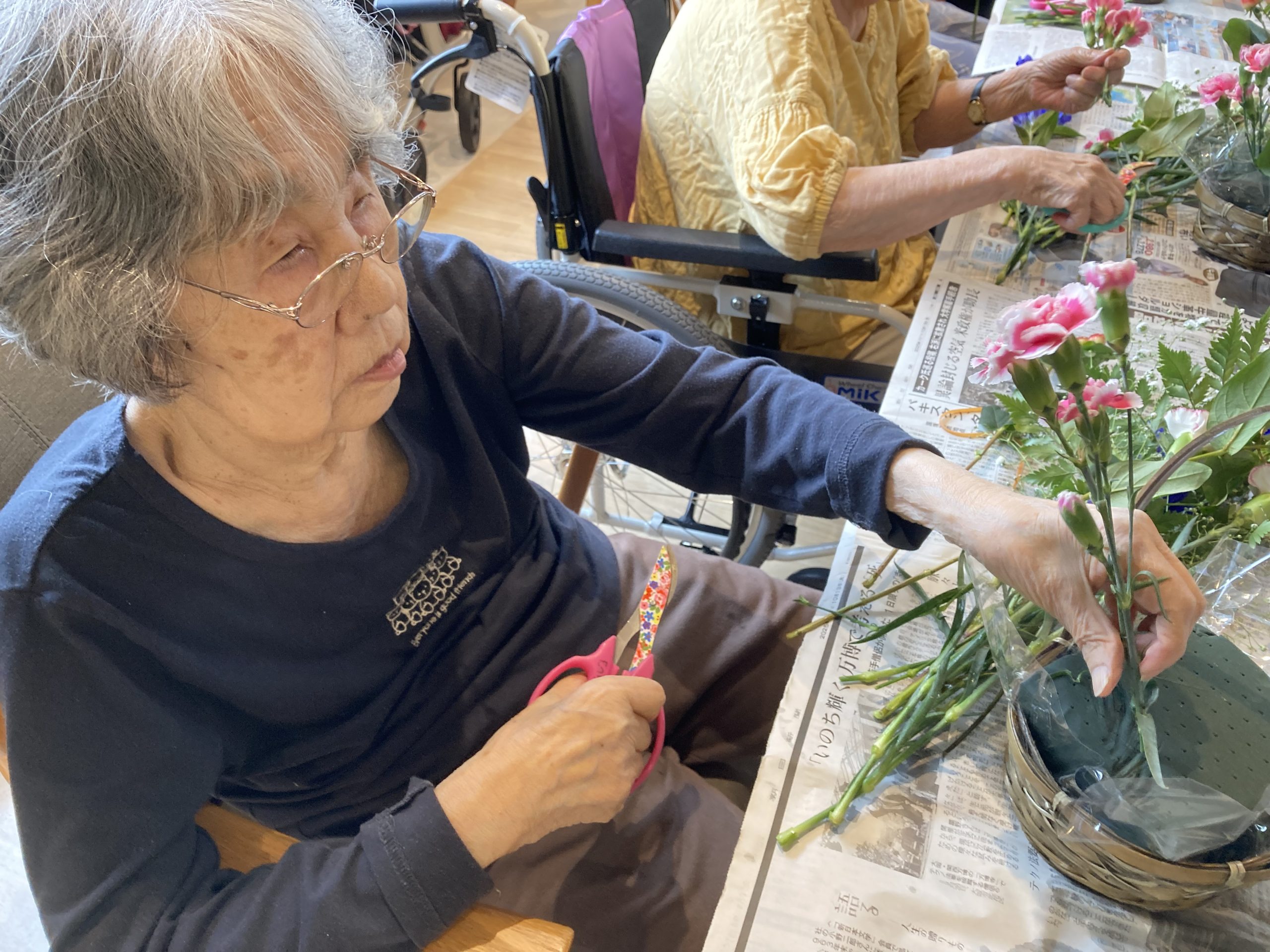 テーブルの上には、色とりどりの季節の花々(カーネーション、カスミソウ、リンドウ、ヒペリカム)。利用者の皆様は、花の香りや手触りを楽しみながら、思い思いのアレンジメントに取り組まれました。