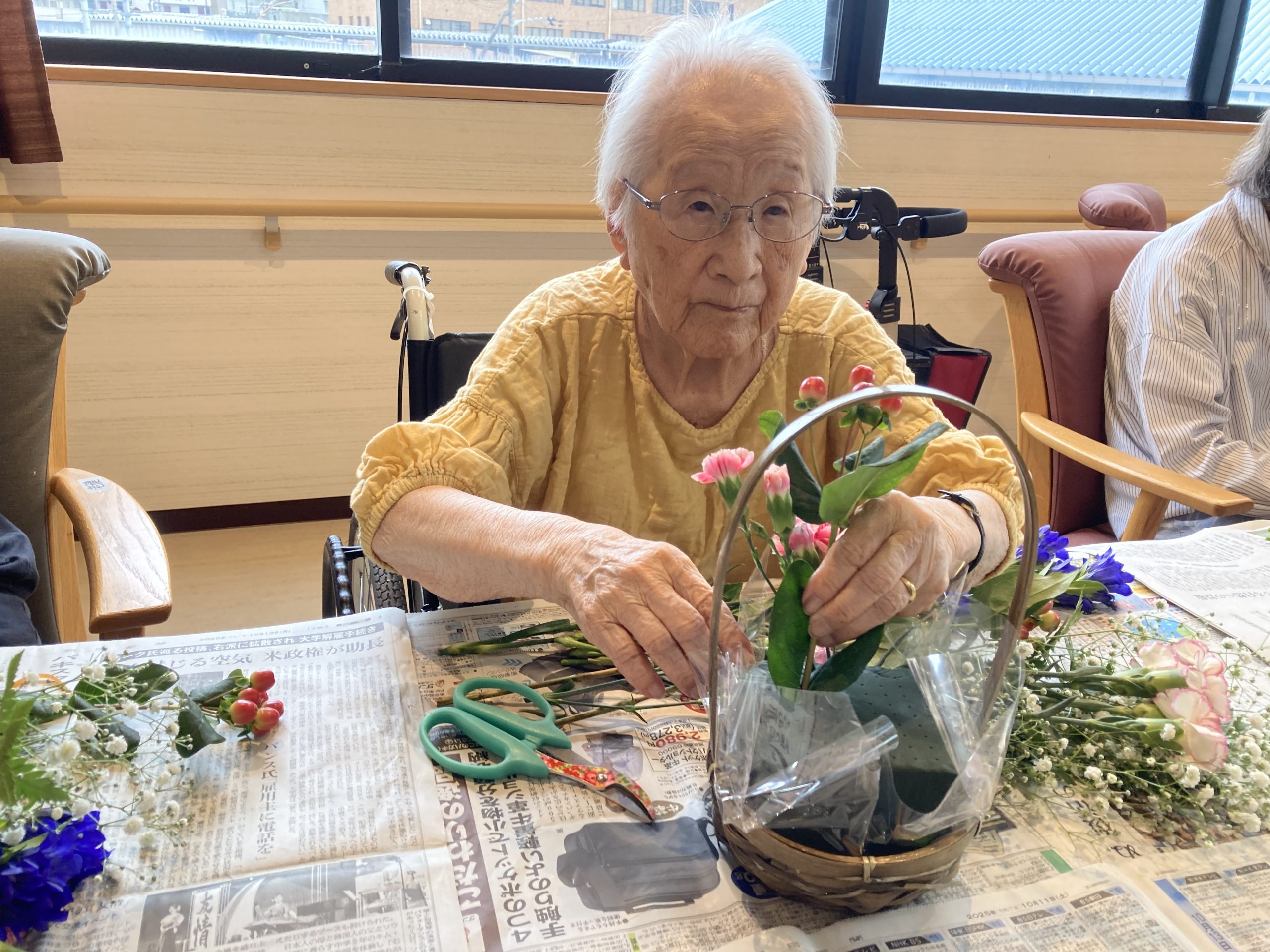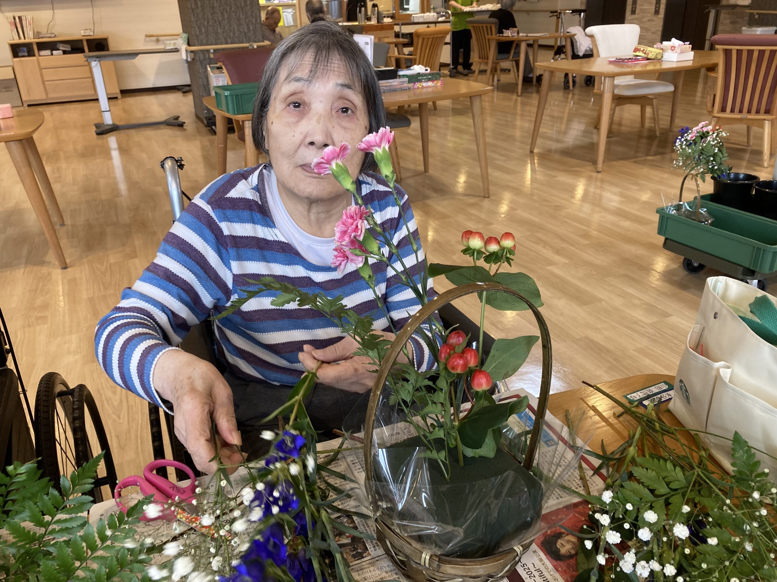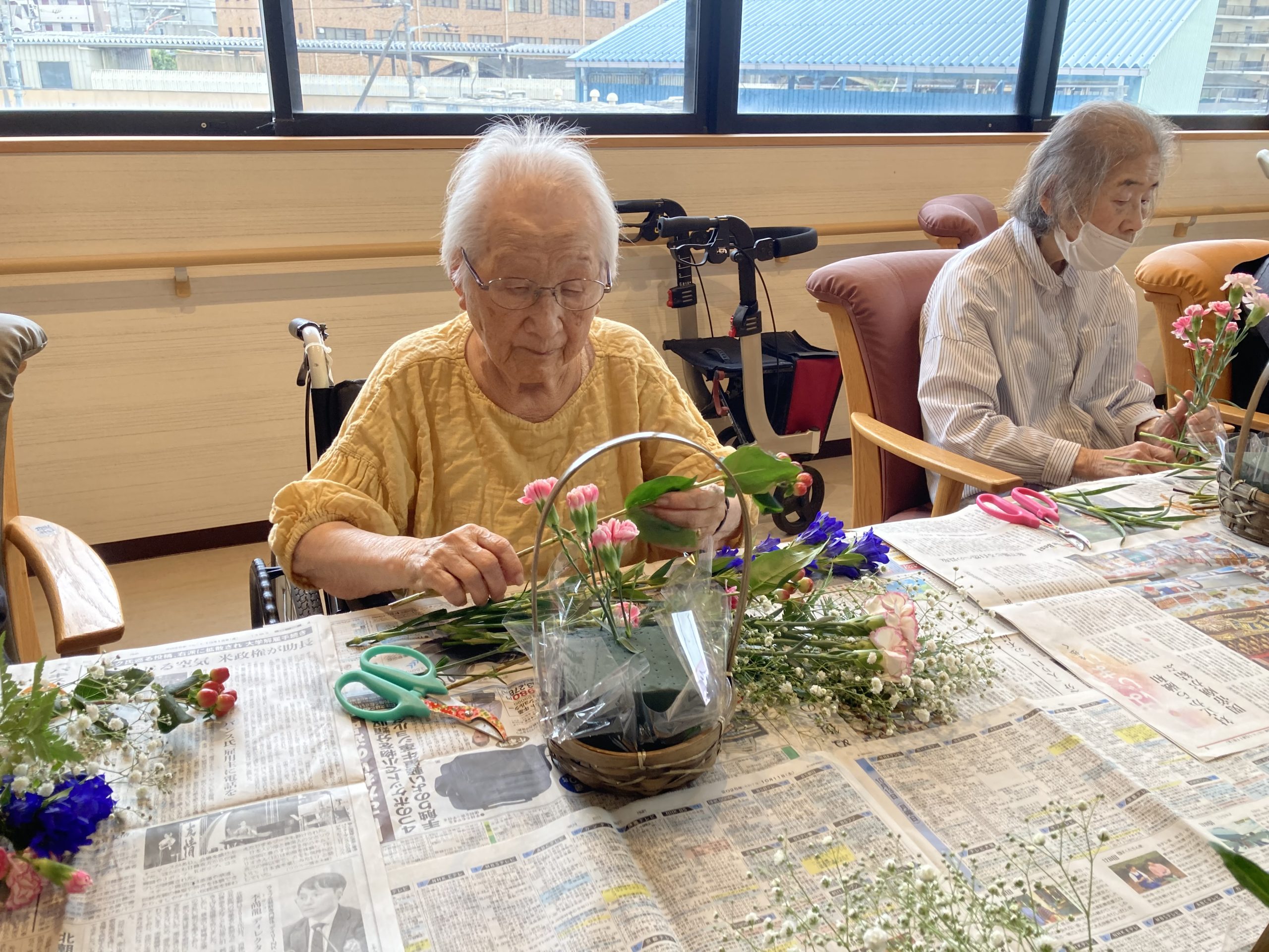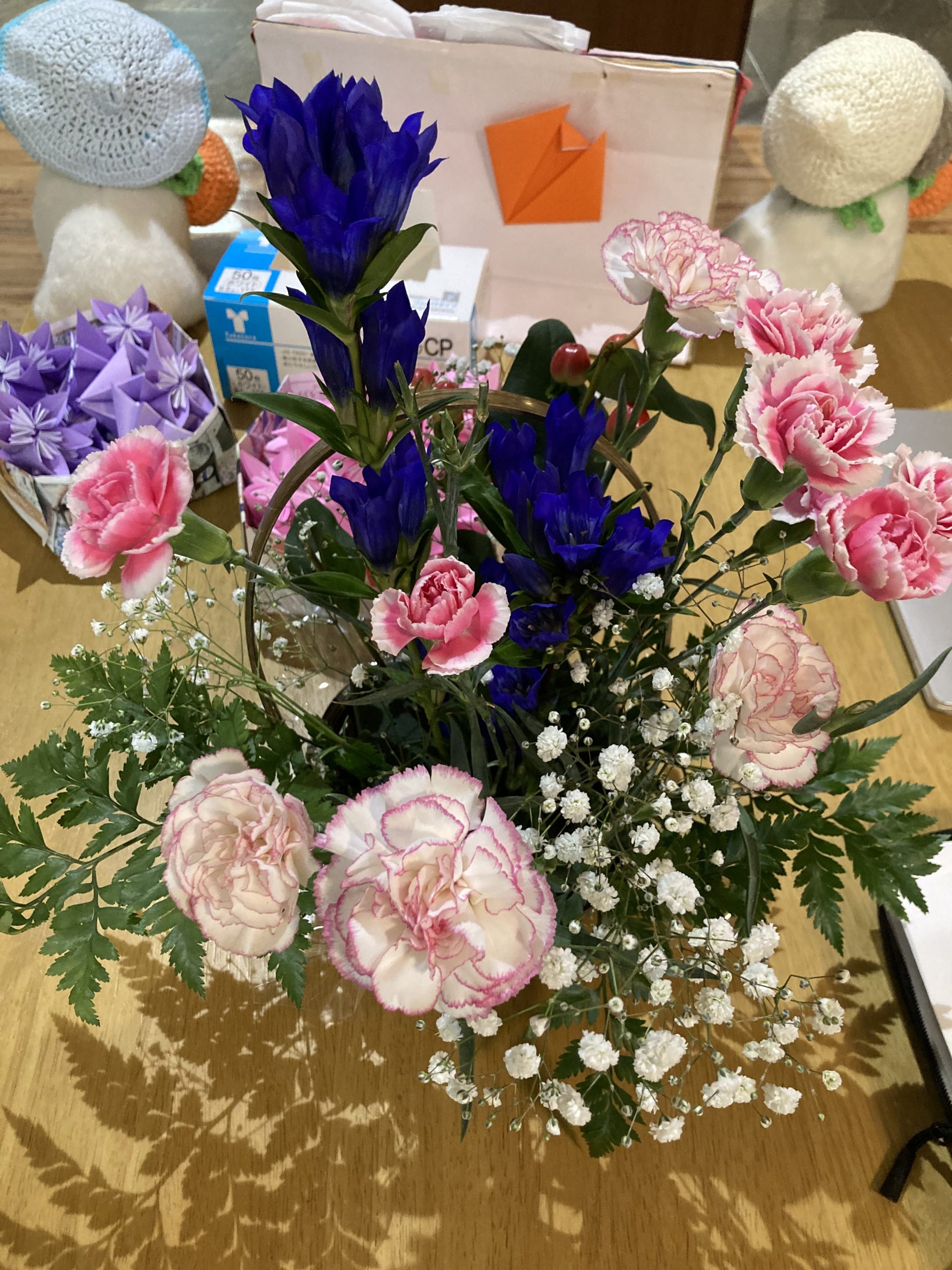 テーブルの上には、色とりどりの季節の花々(カーネーション、カスミソウ、リンドウ、ヒペリカム)。利用者の皆様は、花の香りや手触りを楽しみながら、思い思いのアレンジメントに取り組まれました。