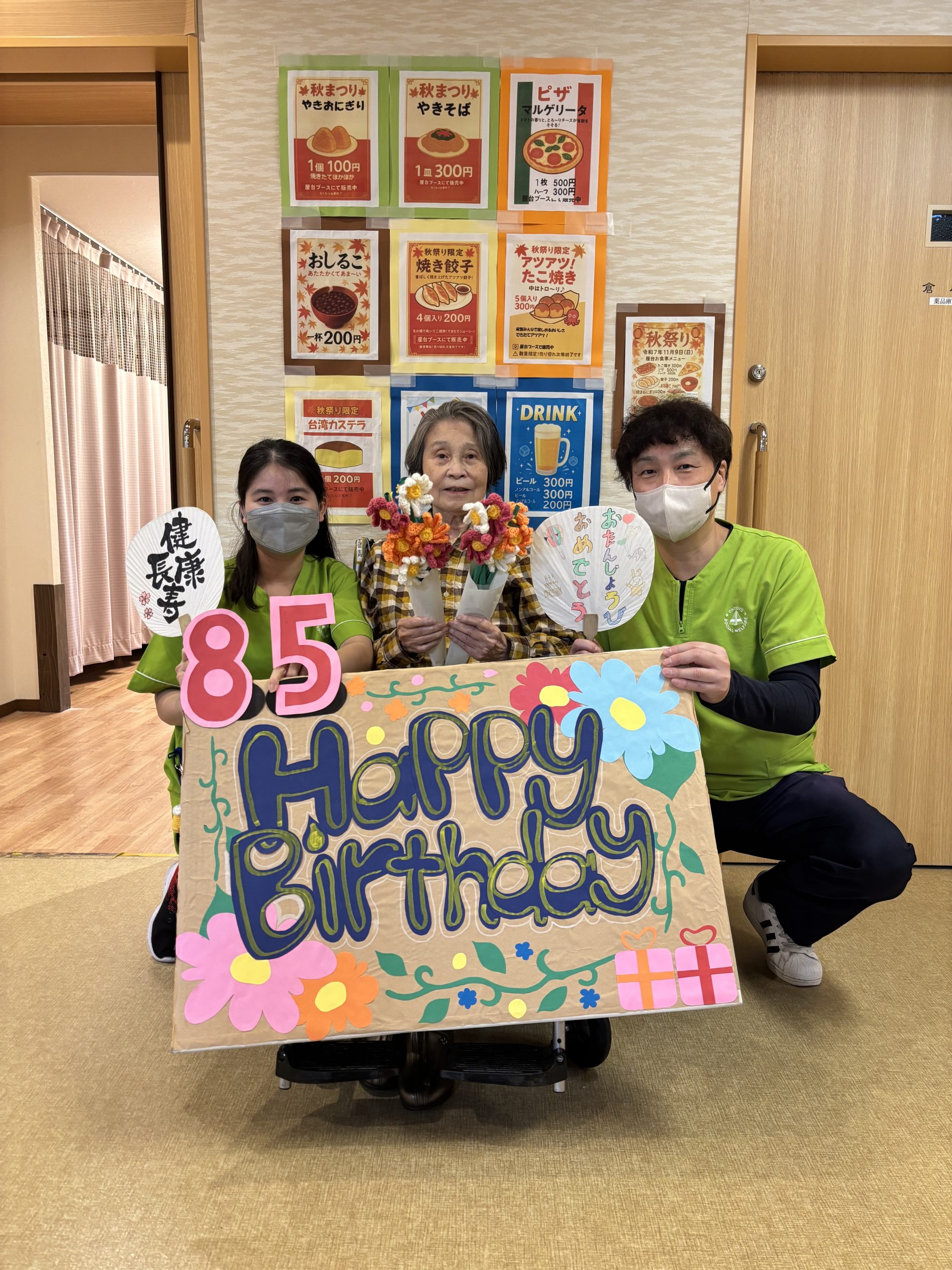 今月は、秋祭りが開催されましたので、「今年の秋祭りのポスター」を背景に「毛糸の花束💐」と記念写真を撮る事ができました。