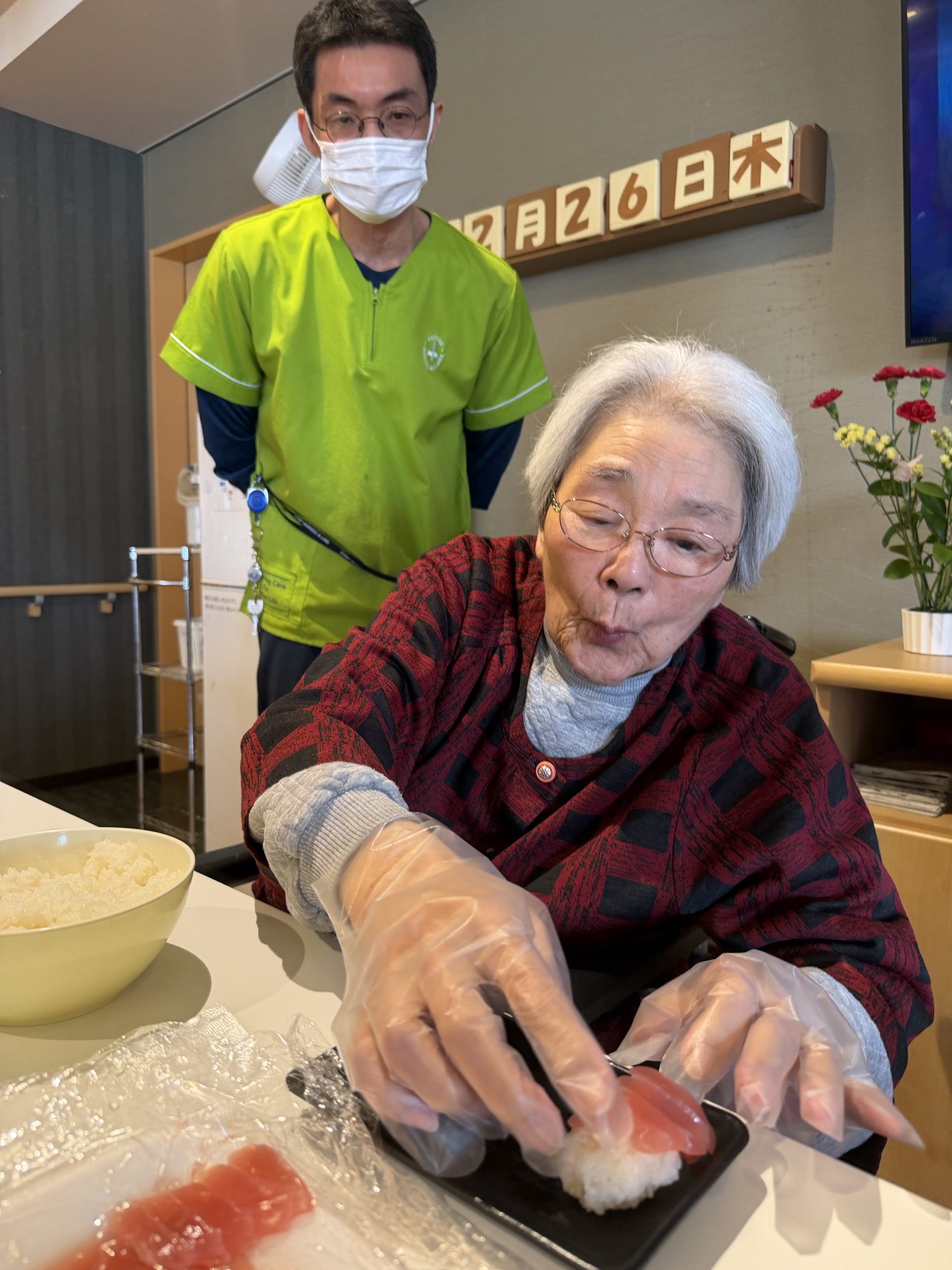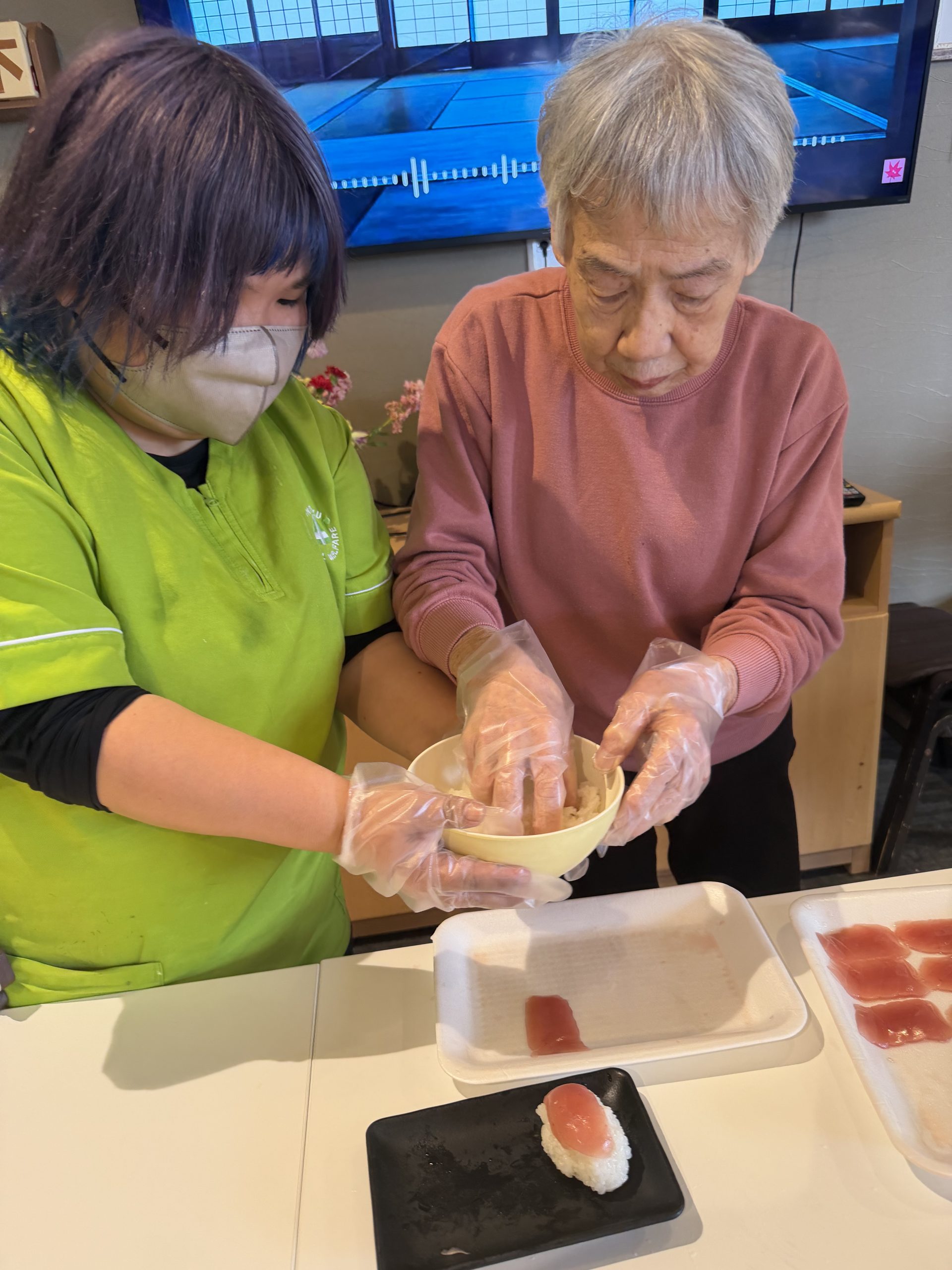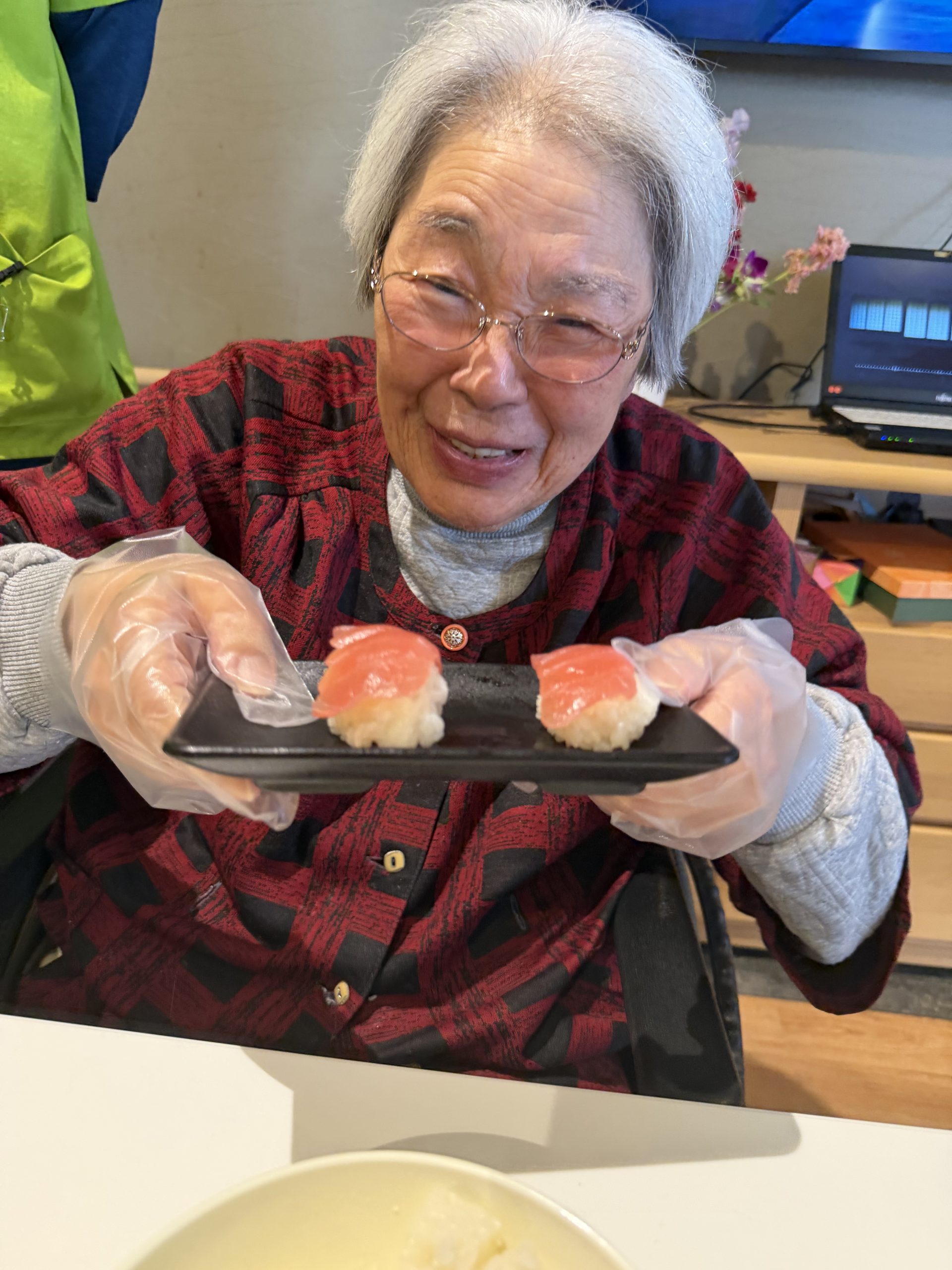職員と一緒にシャリを握り、ネタをのせて「シャリが大きすぎたな~」「上手にできた~」と笑顔いっぱいの時間になりました。