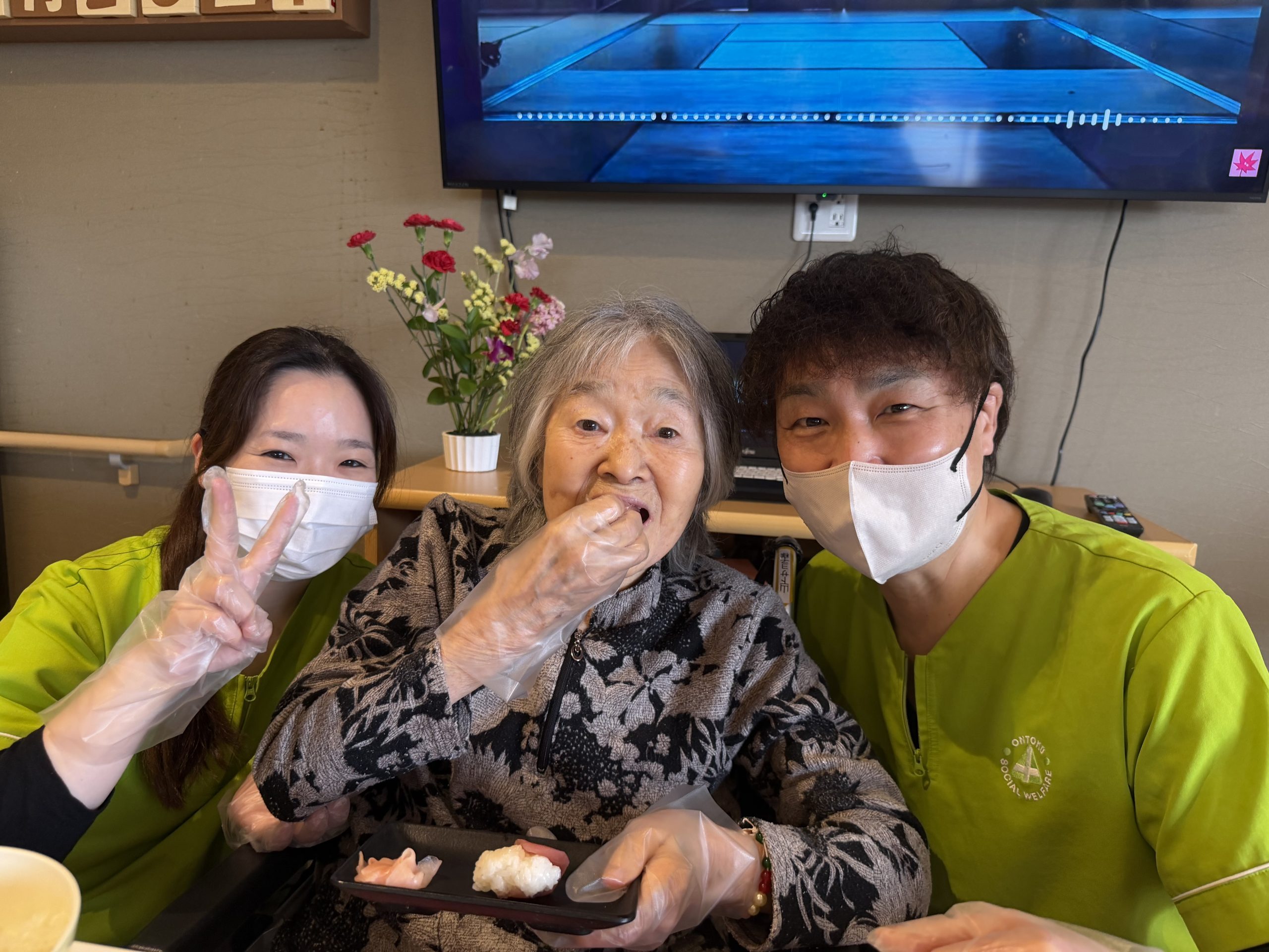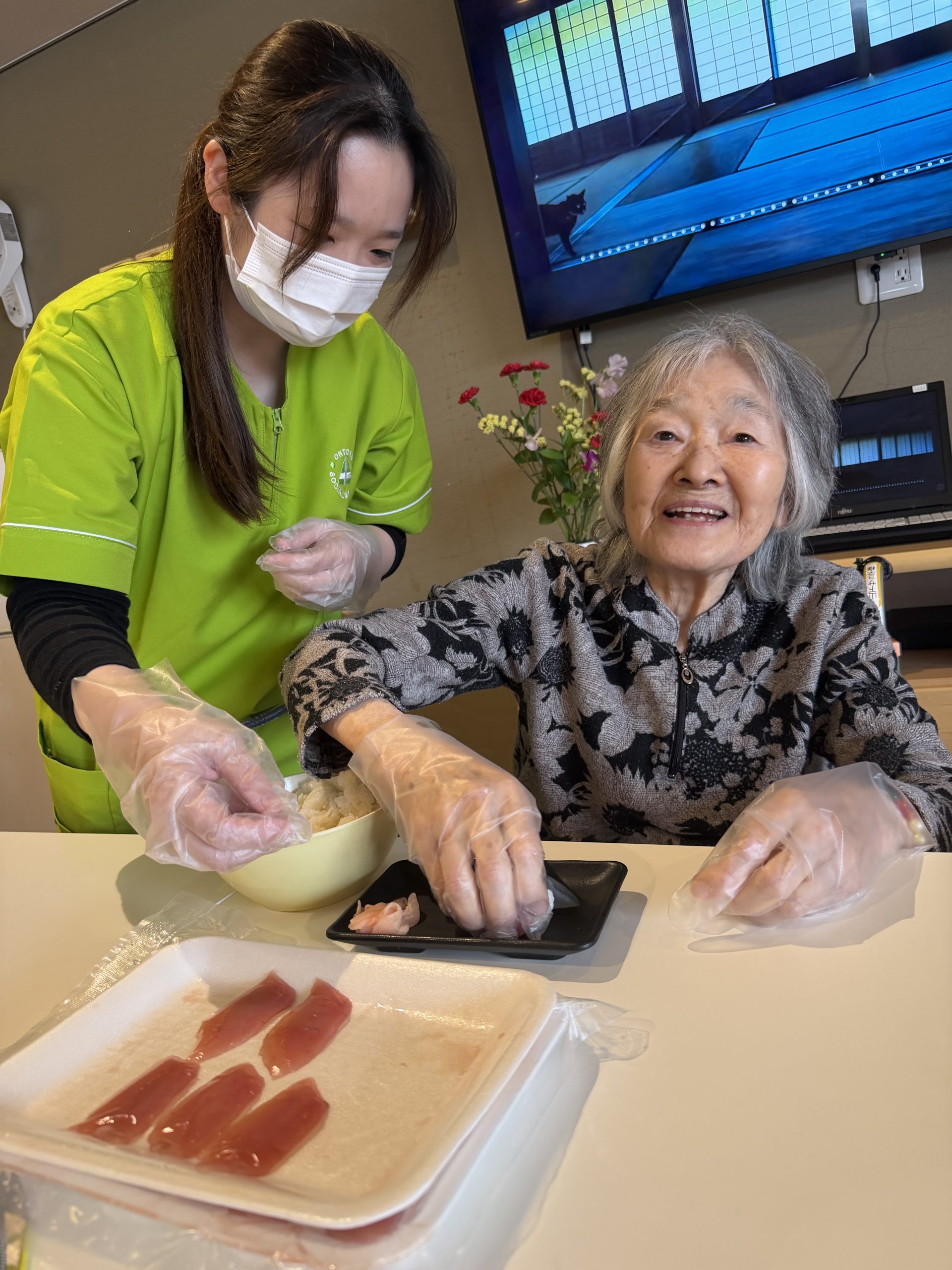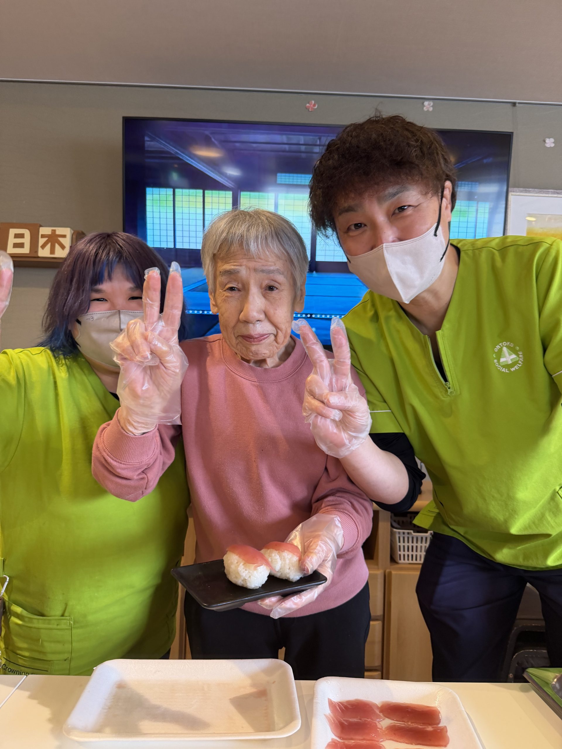 職員と一緒にシャリを握り、ネタをのせて「シャリが大きすぎたな~」「上手にできた~」と笑顔いっぱいの時間になりました。