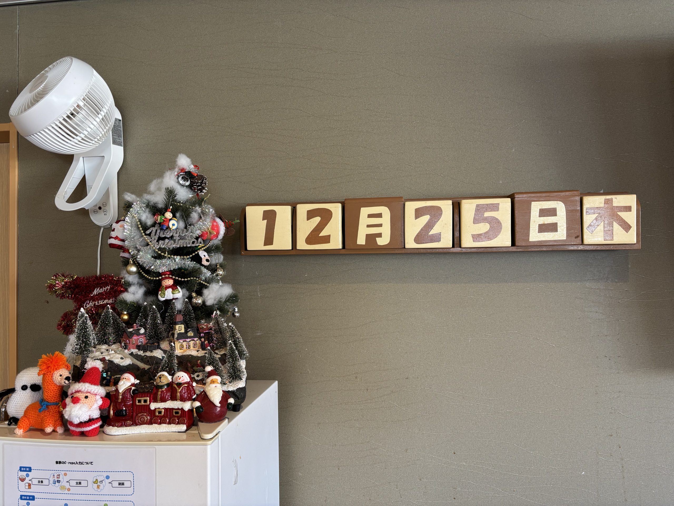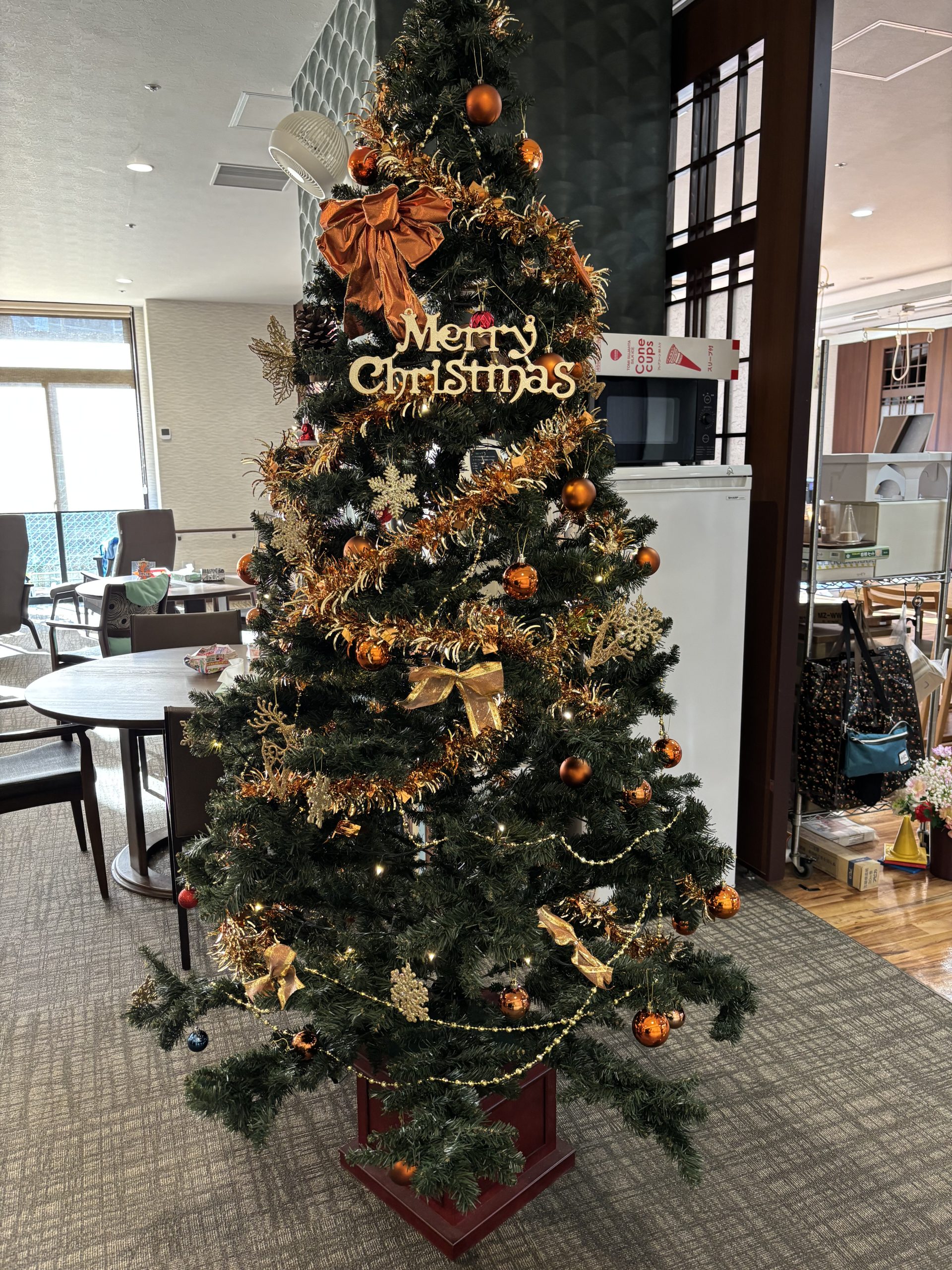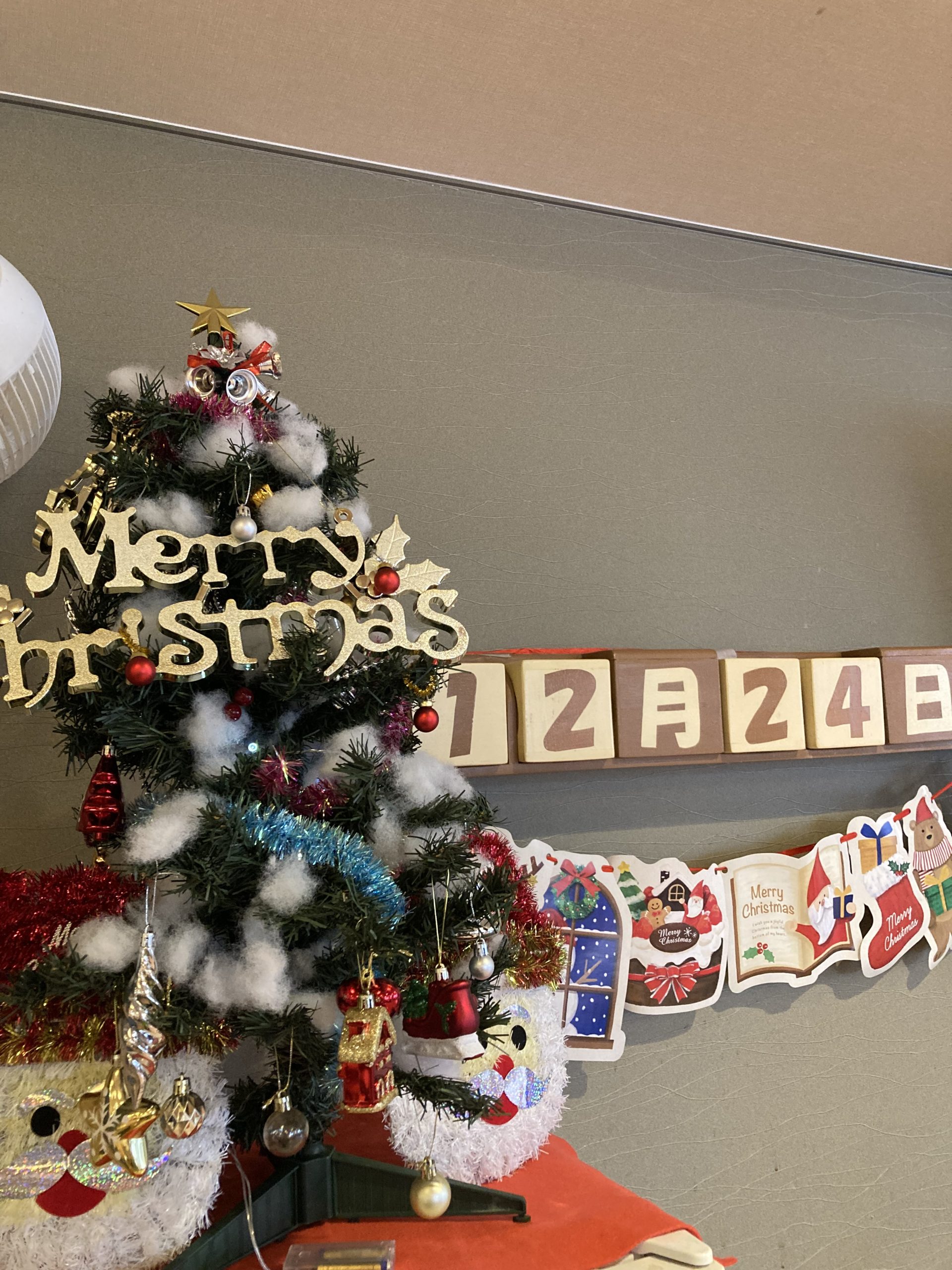 1Fの通所スペース入口には大きなクリスマスツリー🎄が飾られ、きらめく💡オーナメント🔔とイルミネーション🌟が皆さんをお迎えしていました。