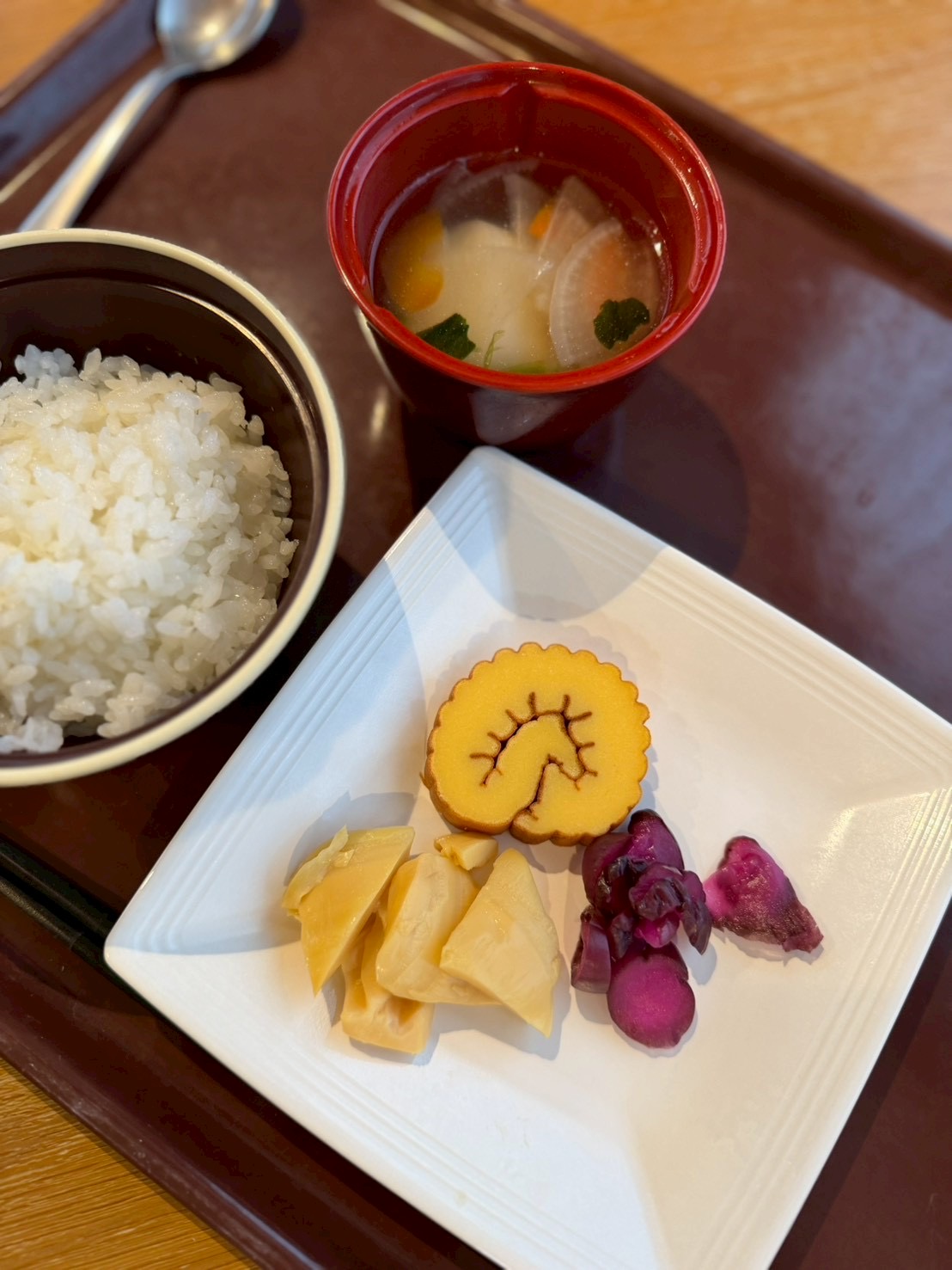 「温かい雑煮に、やさしい味わいのたけのこの煮物、漬物、ふんわり甘い伊達巻」。