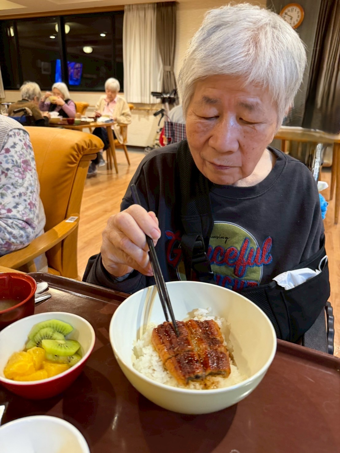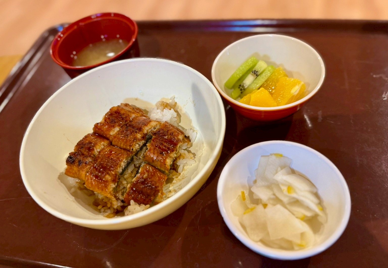 「うな丼に、ほどよい酸味の千枚漬け、フルーツ盛り合わせになめこ汁」。