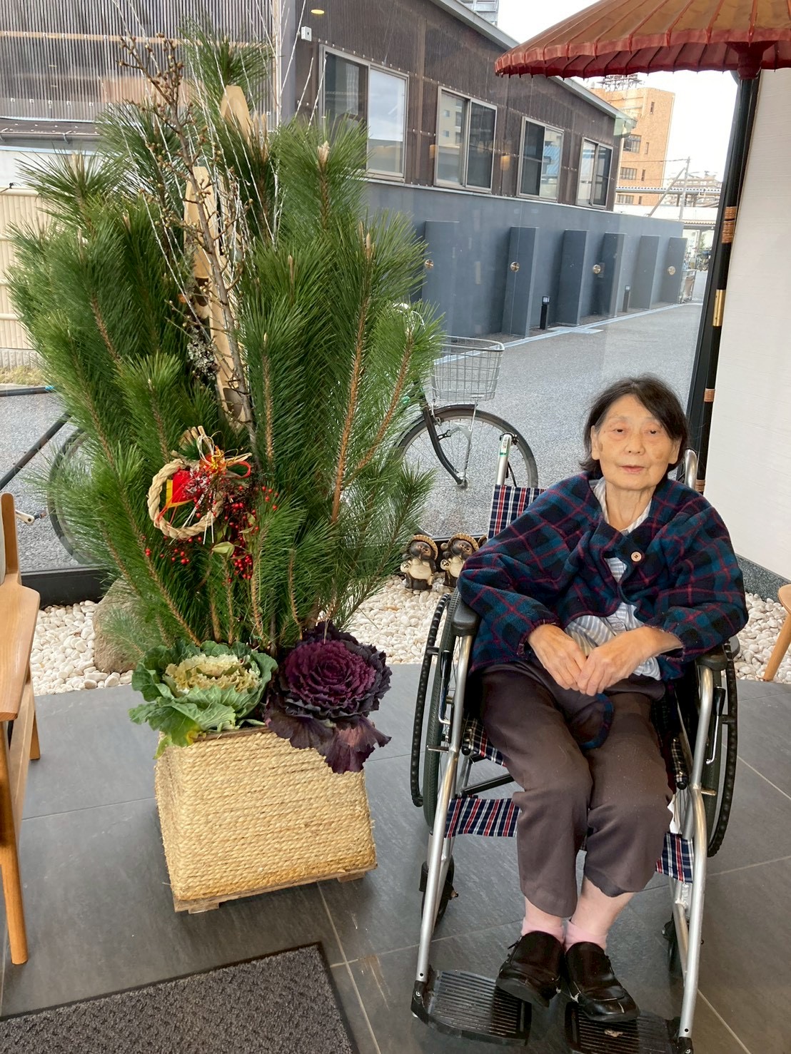 利用者様は立派な門松🎍と共に記念撮影を楽しまれ、晴れやかな笑顔が玄関いっぱいに広がりました。