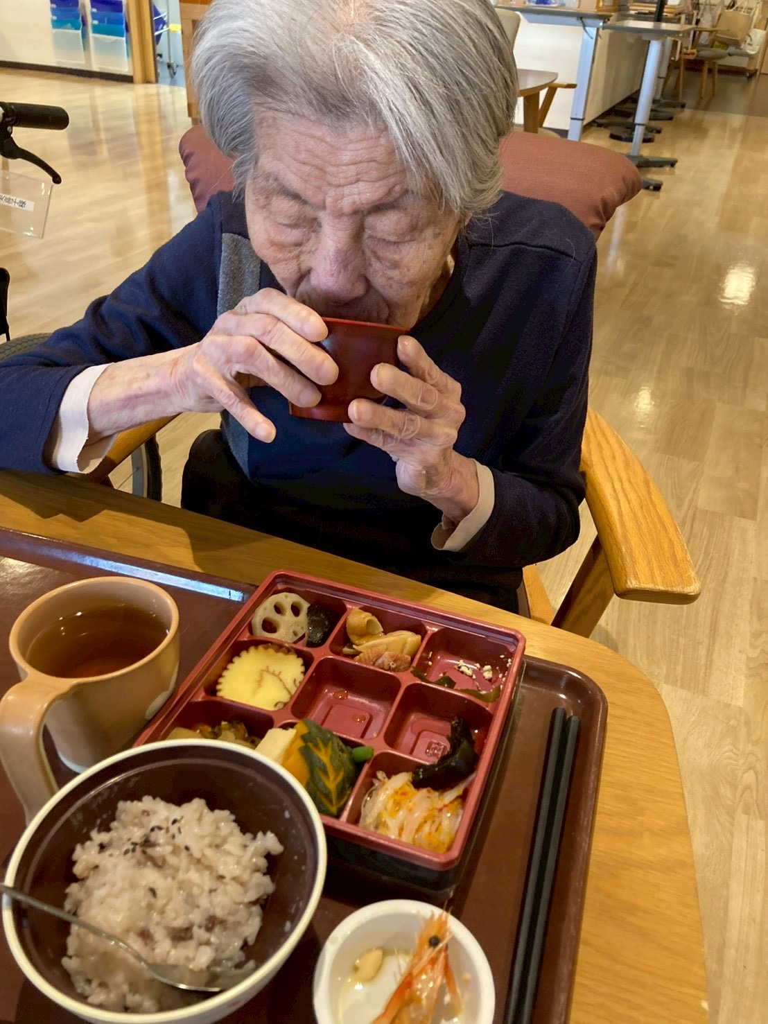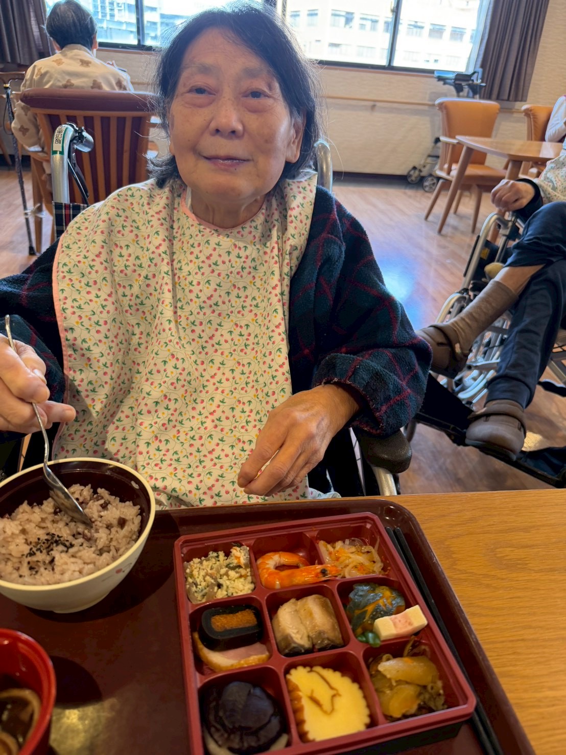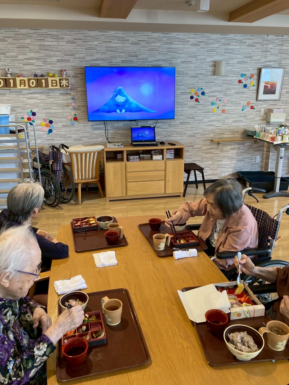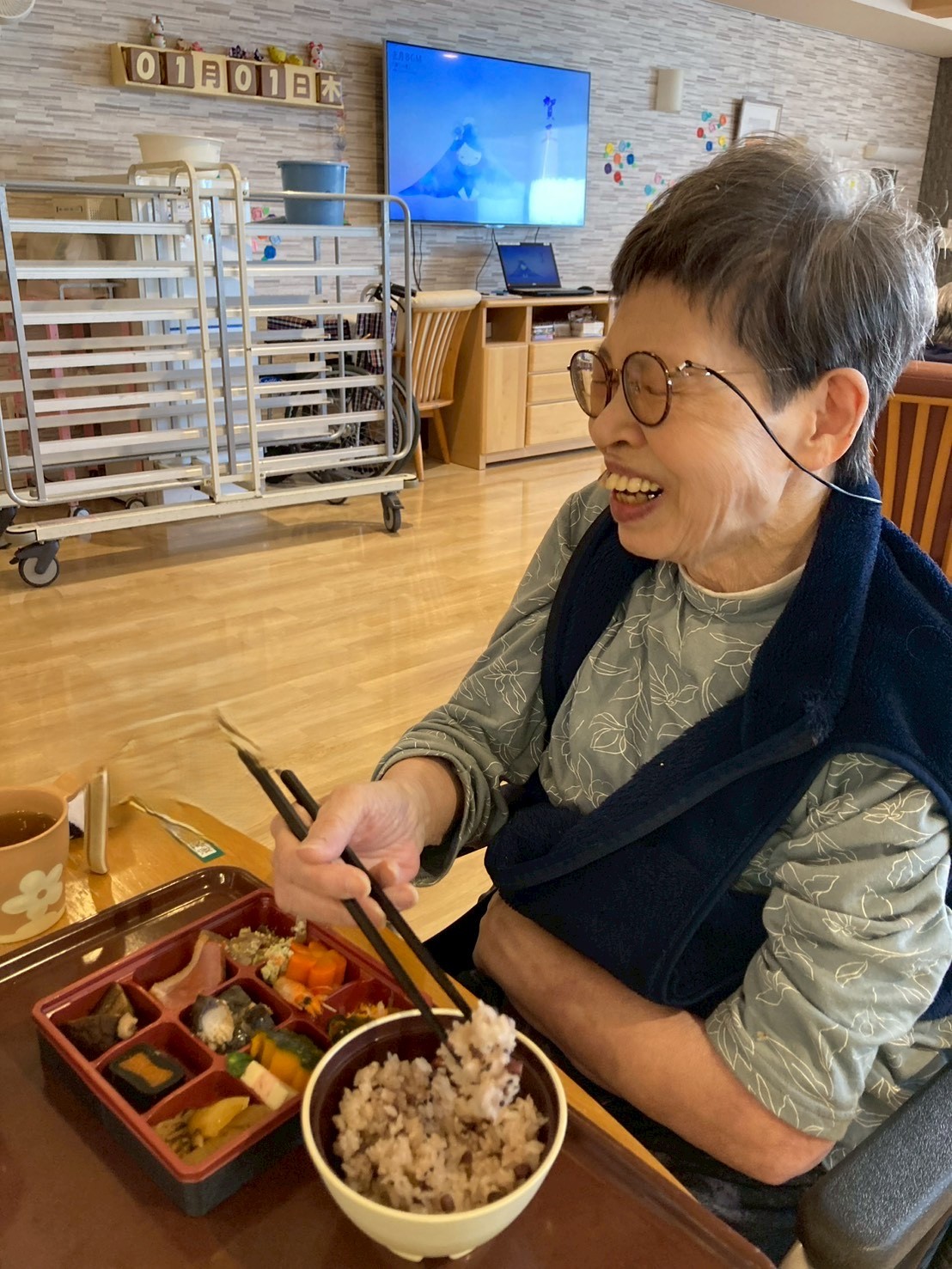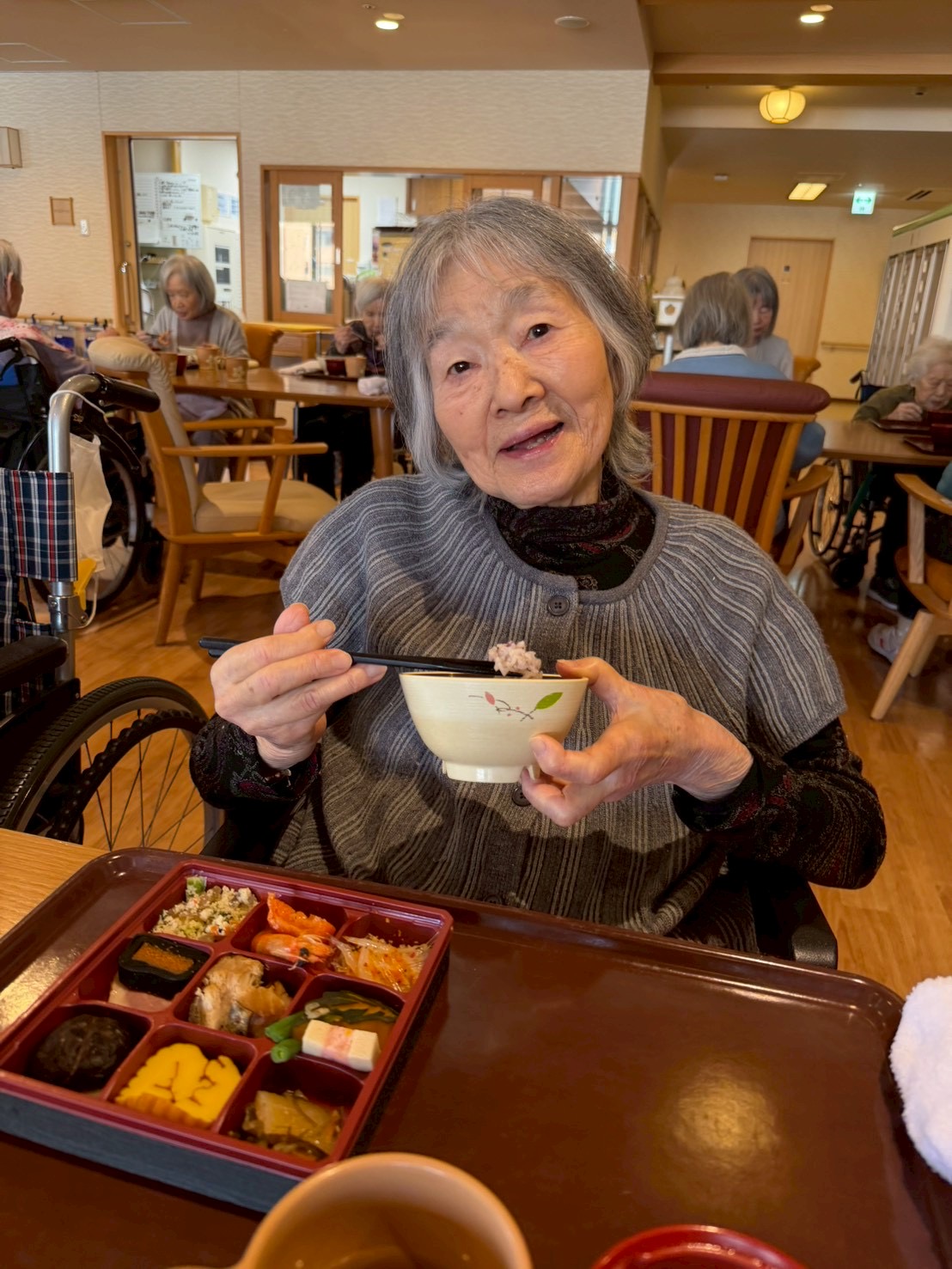 食堂では、「わぁ、きれい。」「お正月らしくてうれしい。」といった声が聞かれ、利用者様はゆっくりと丁寧に召し上がっておられました。