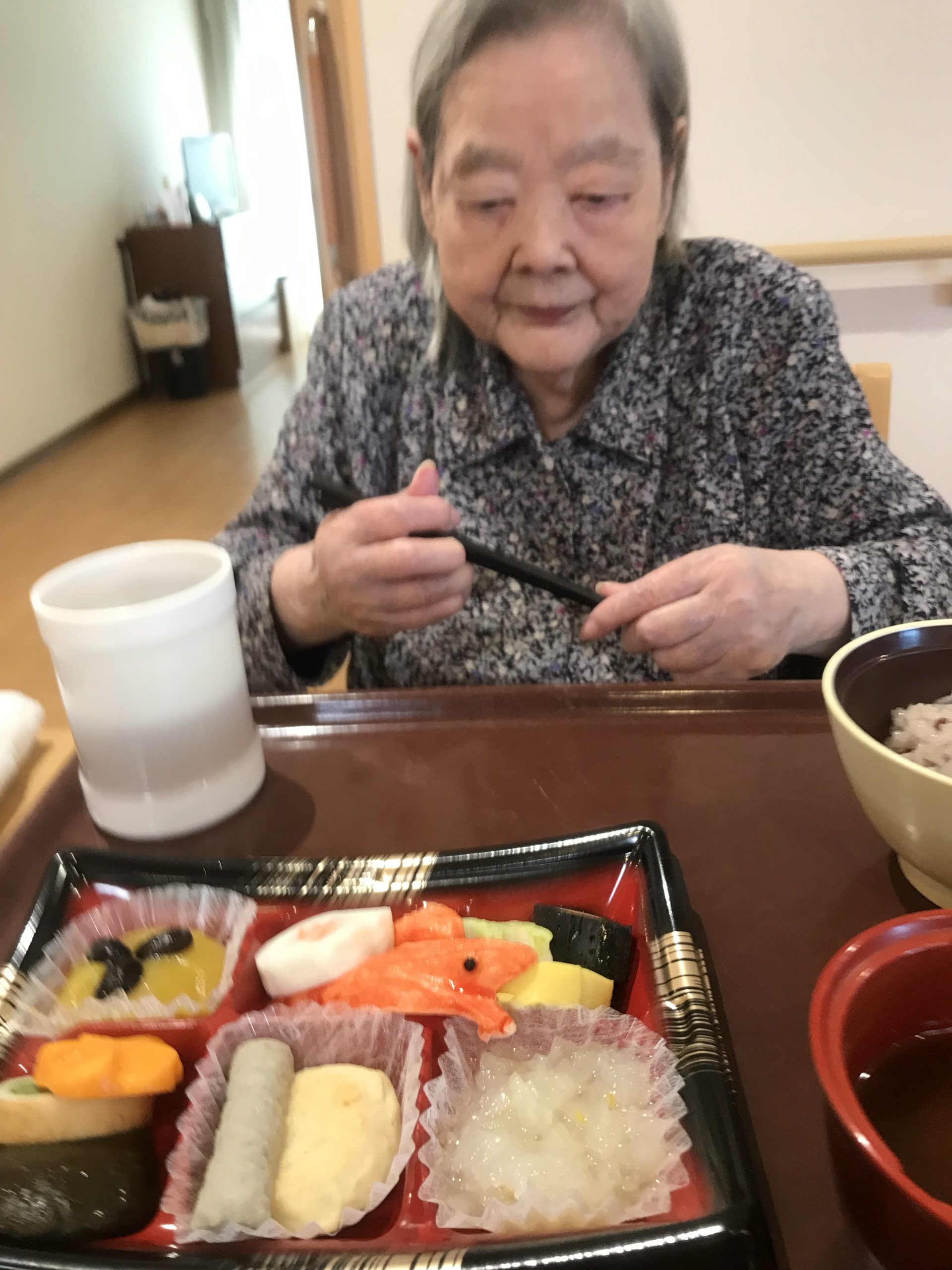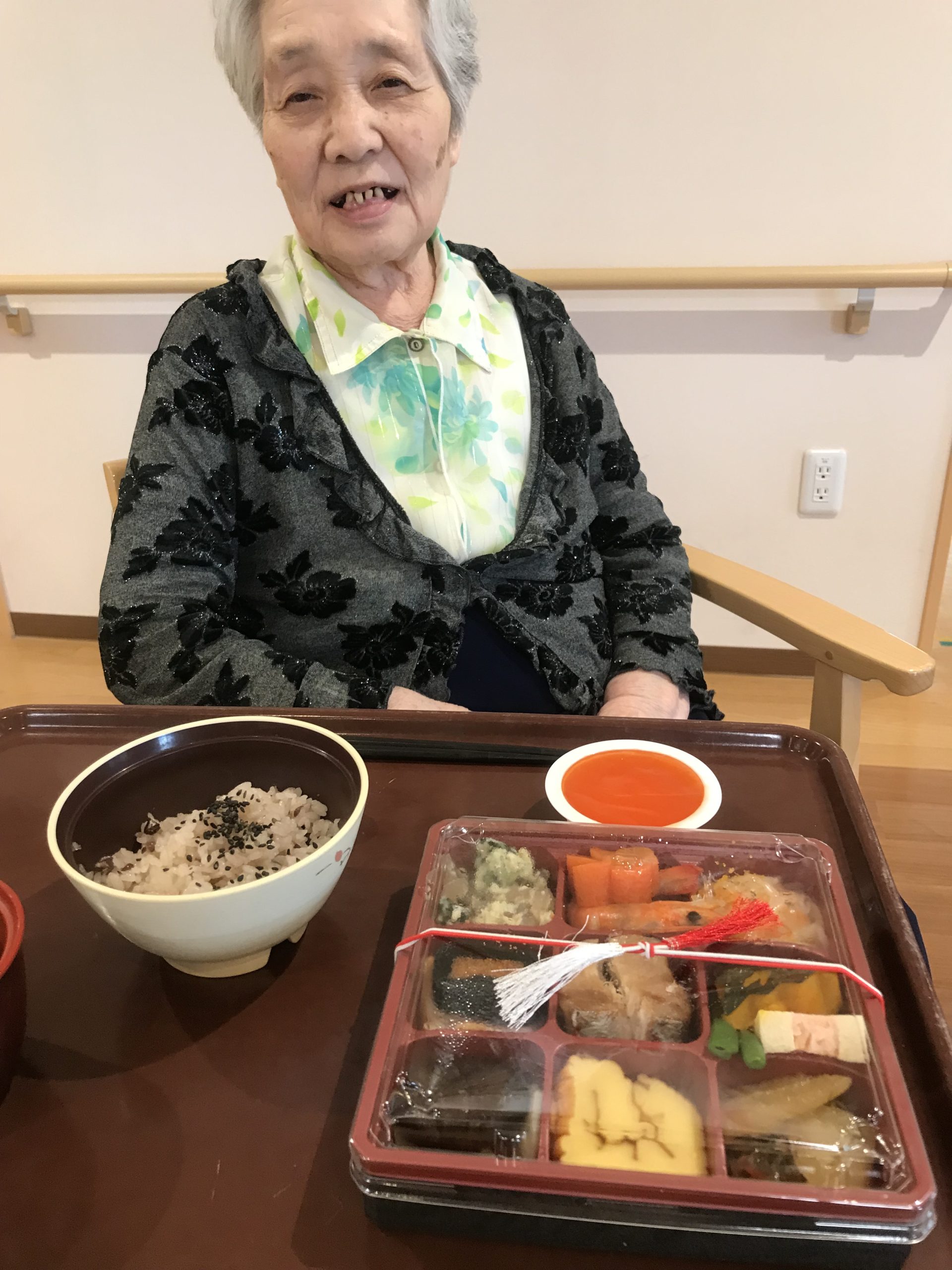 昼食は、お赤飯、おせち、赤だしという豪華な献立でした。
