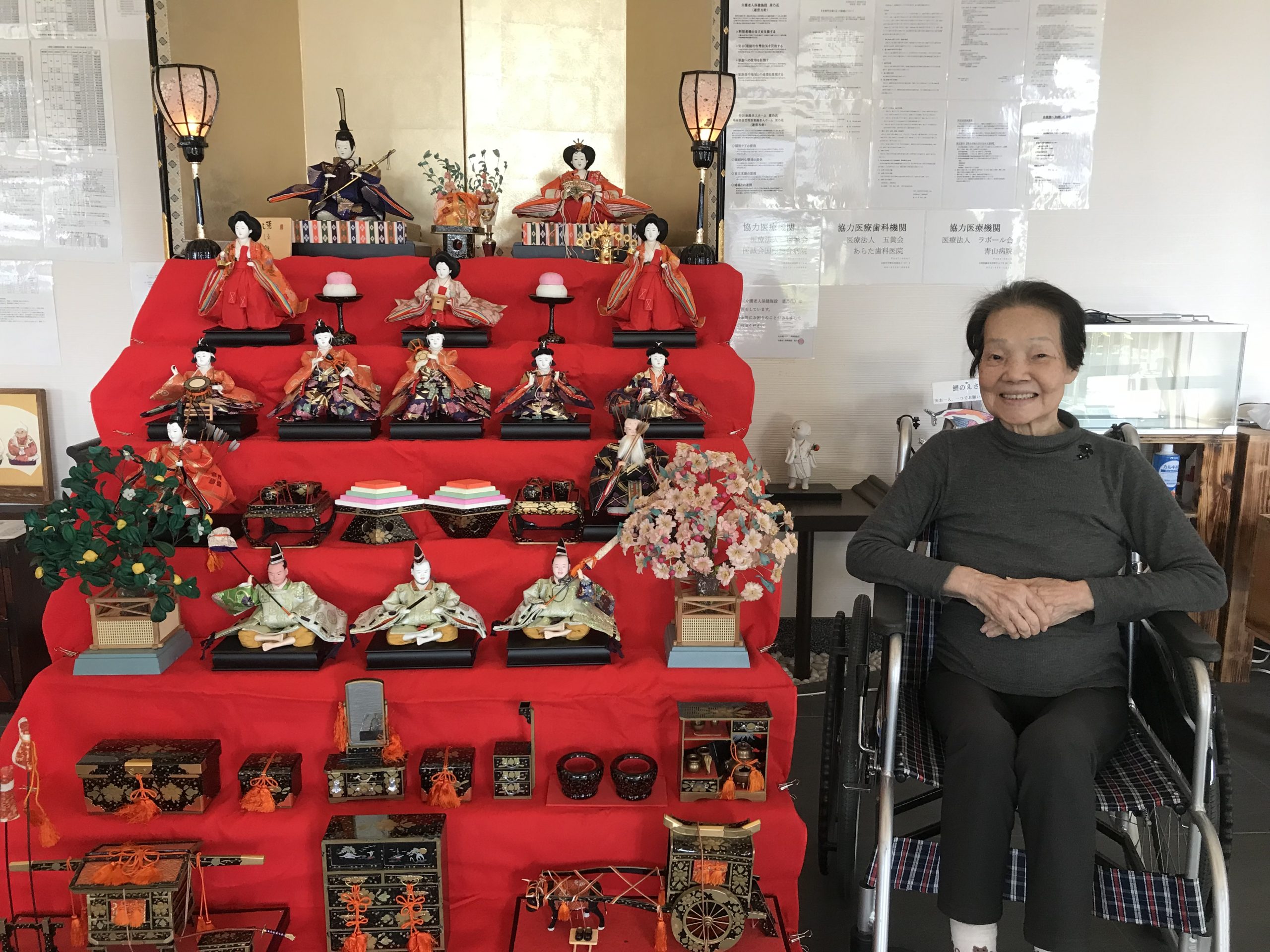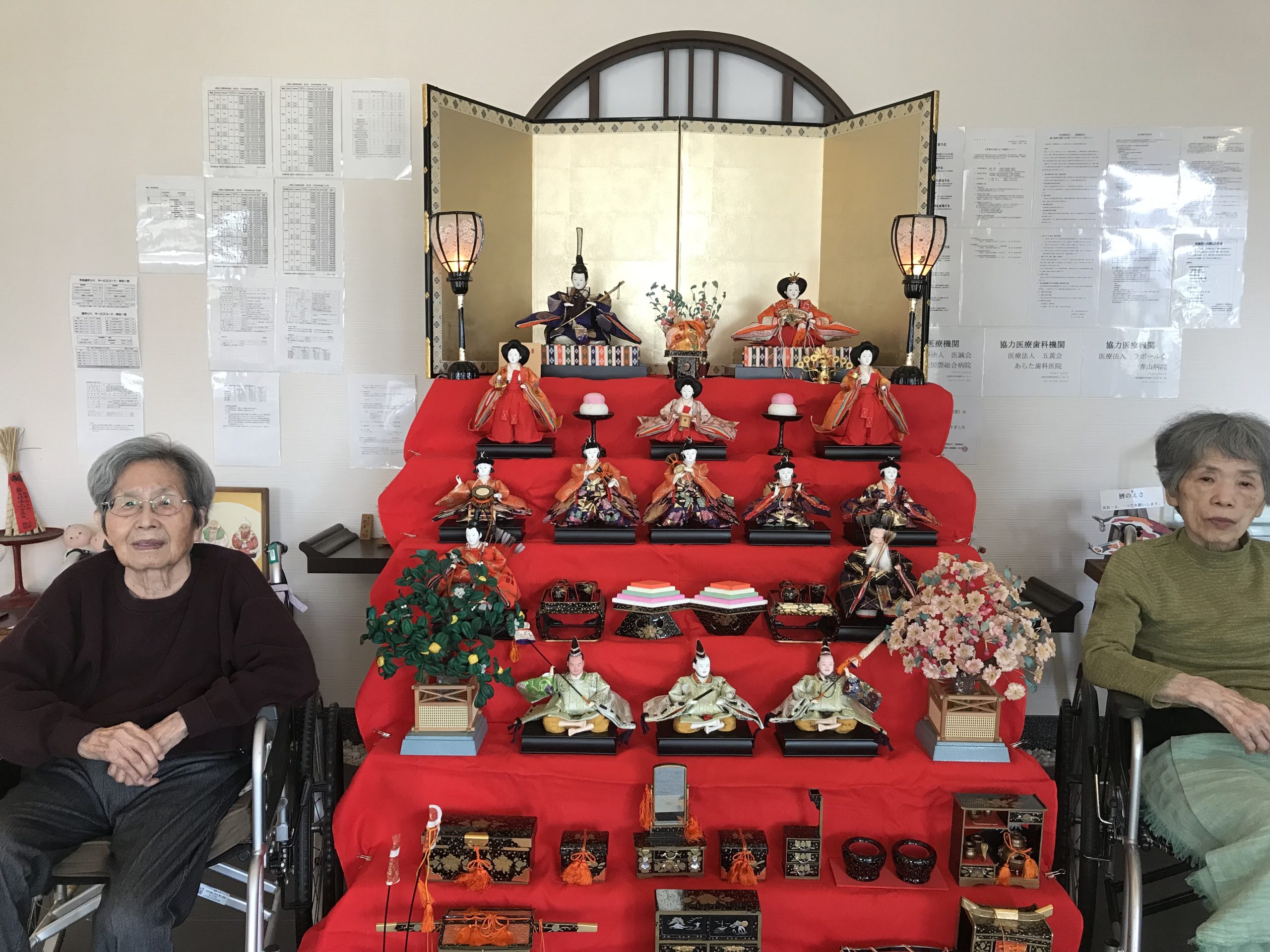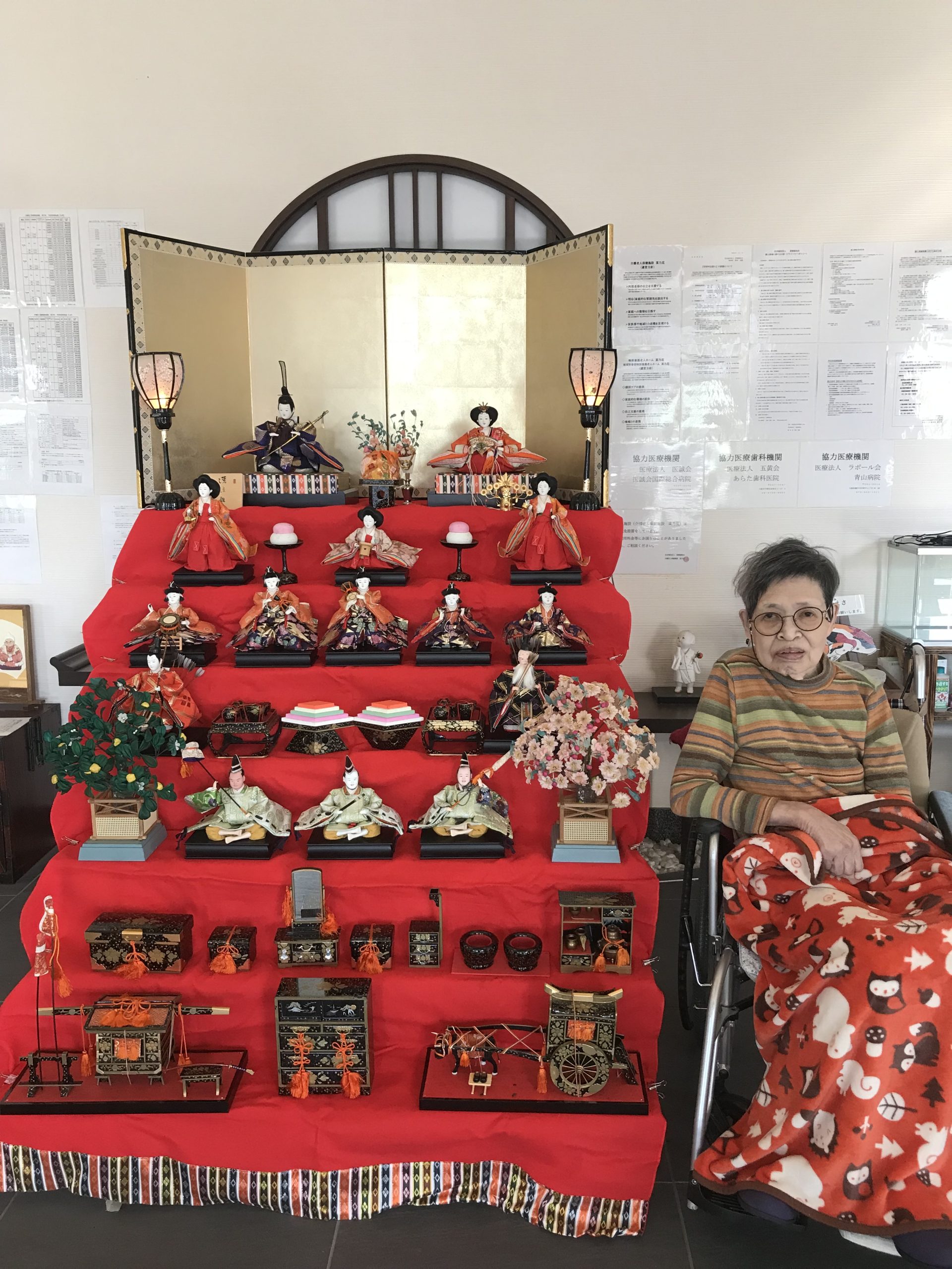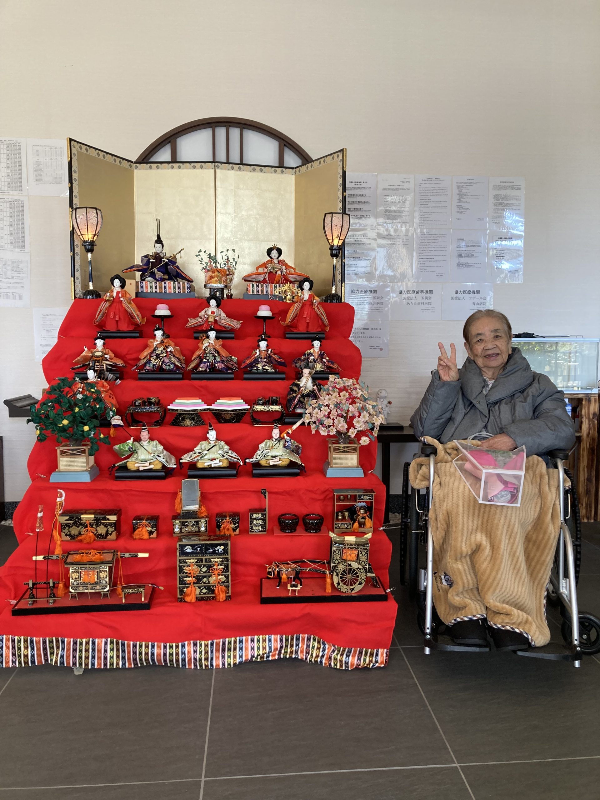 3月に入り、菜乃花の玄関では七段飾りのひな人形🎎が皆さまをお迎えしていました。