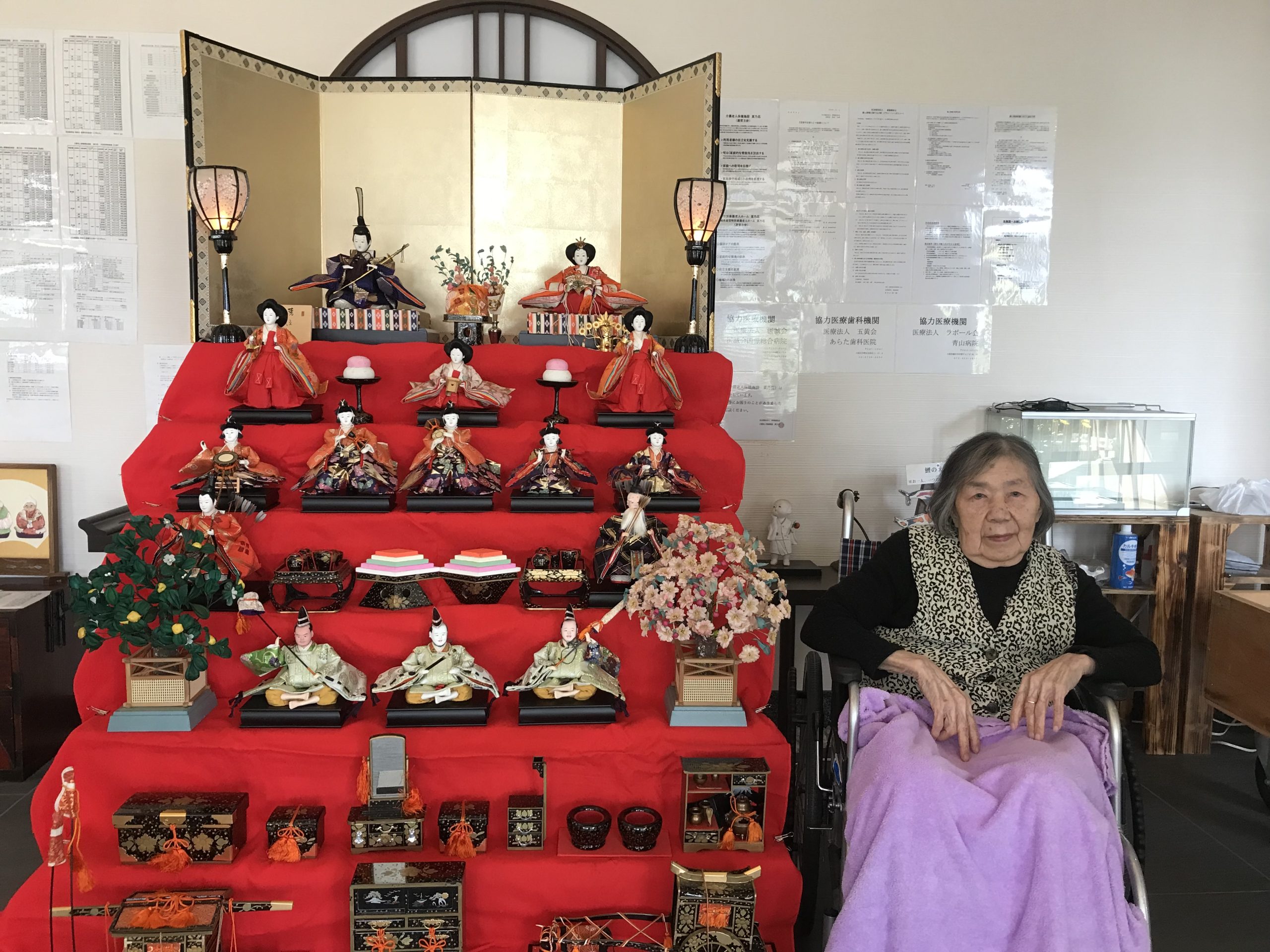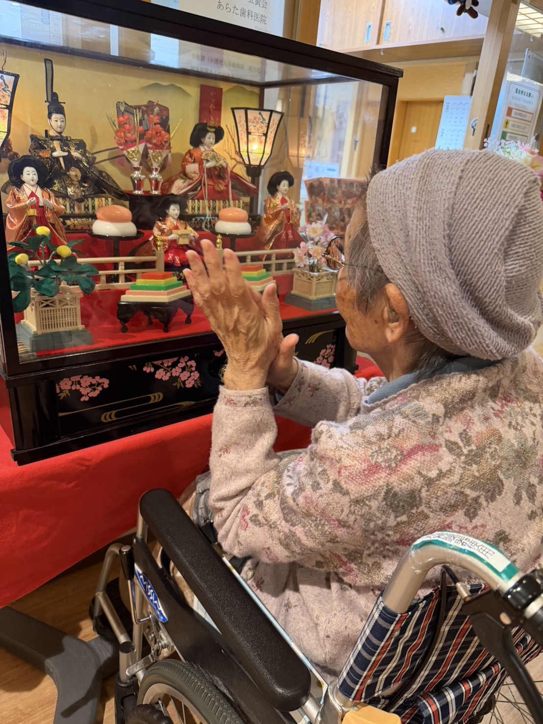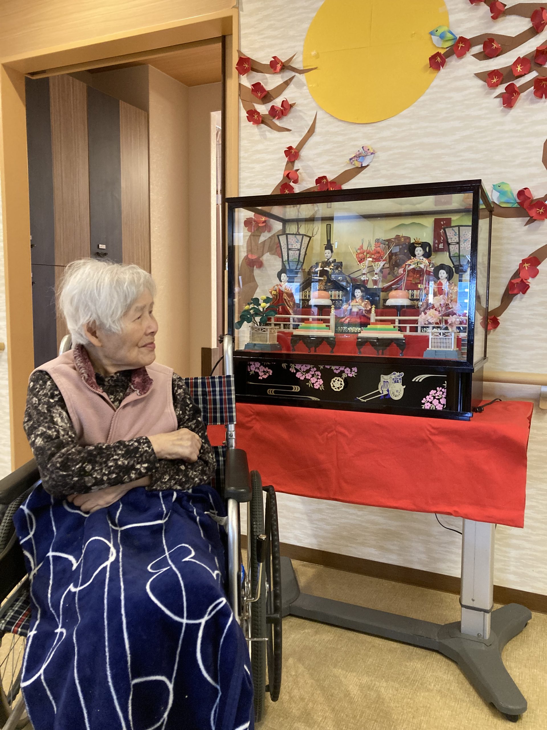 3月に入り、菜乃花の玄関では七段飾りのひな人形🎎が皆さまをお迎えしていました。