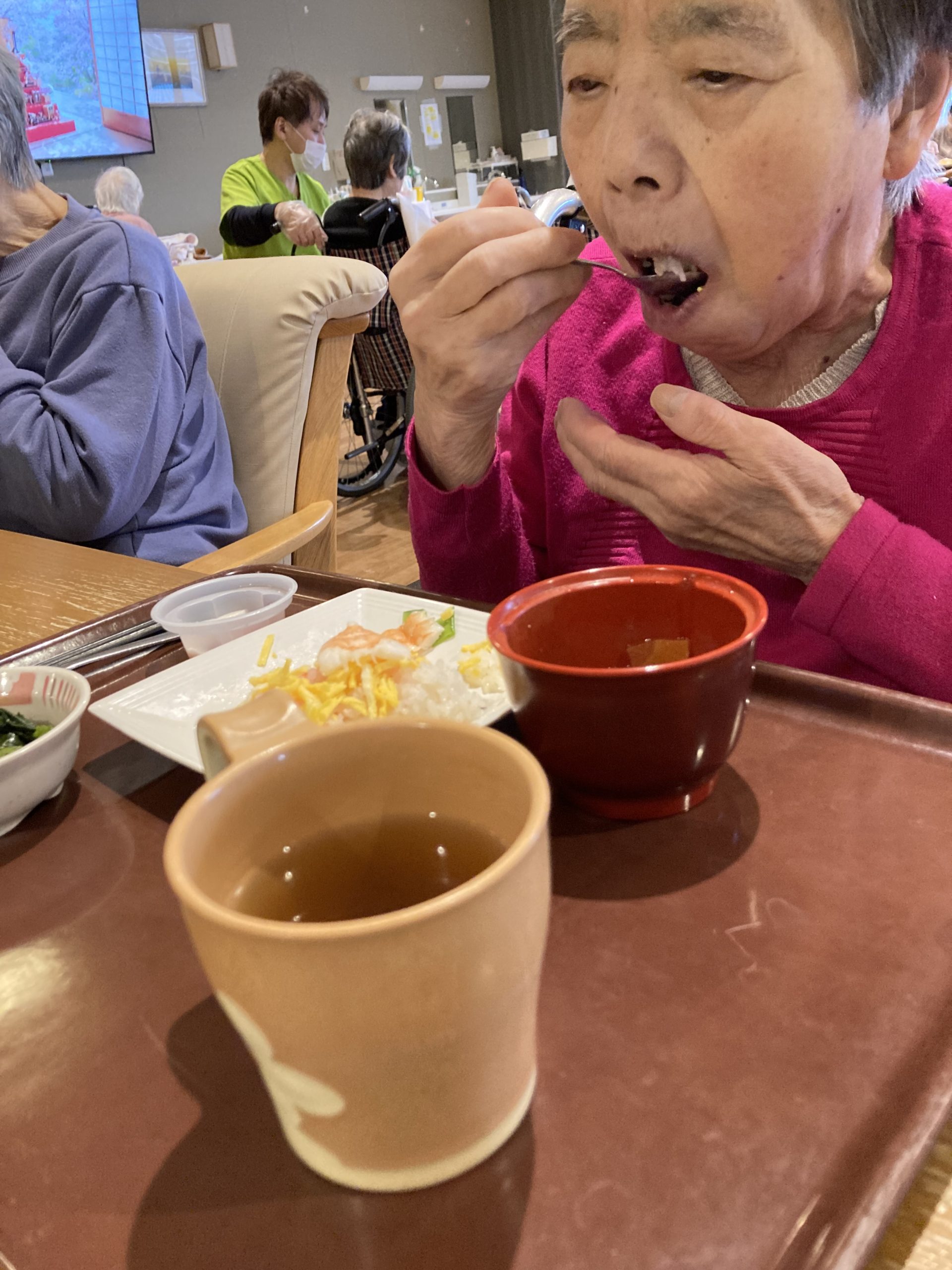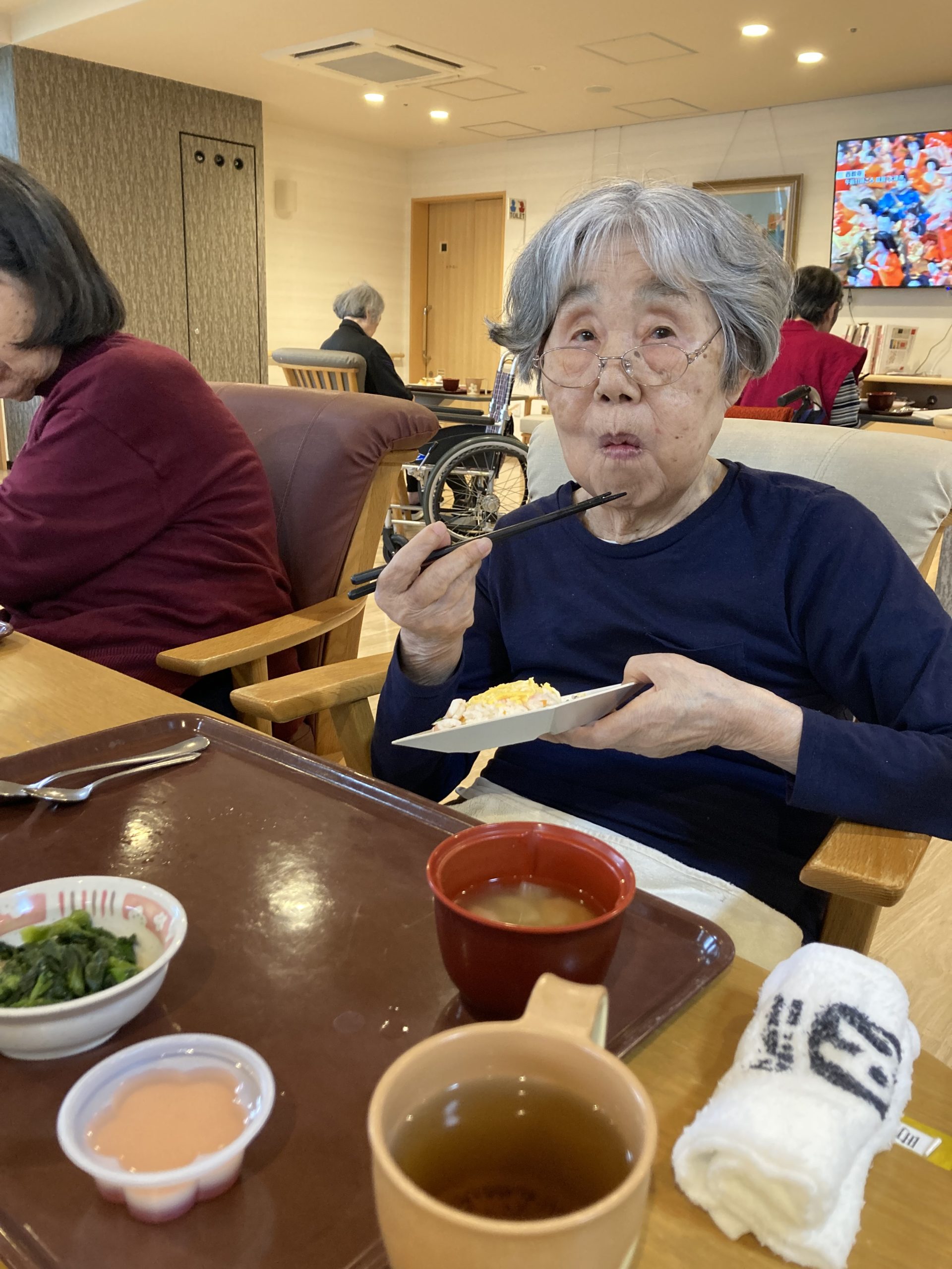 えび、錦糸卵、豆がのった「ちらし寿司」は、「ひな祭り」らしい華やかさが一皿に詰まっており、皆様はゆっくり味わっておられました。