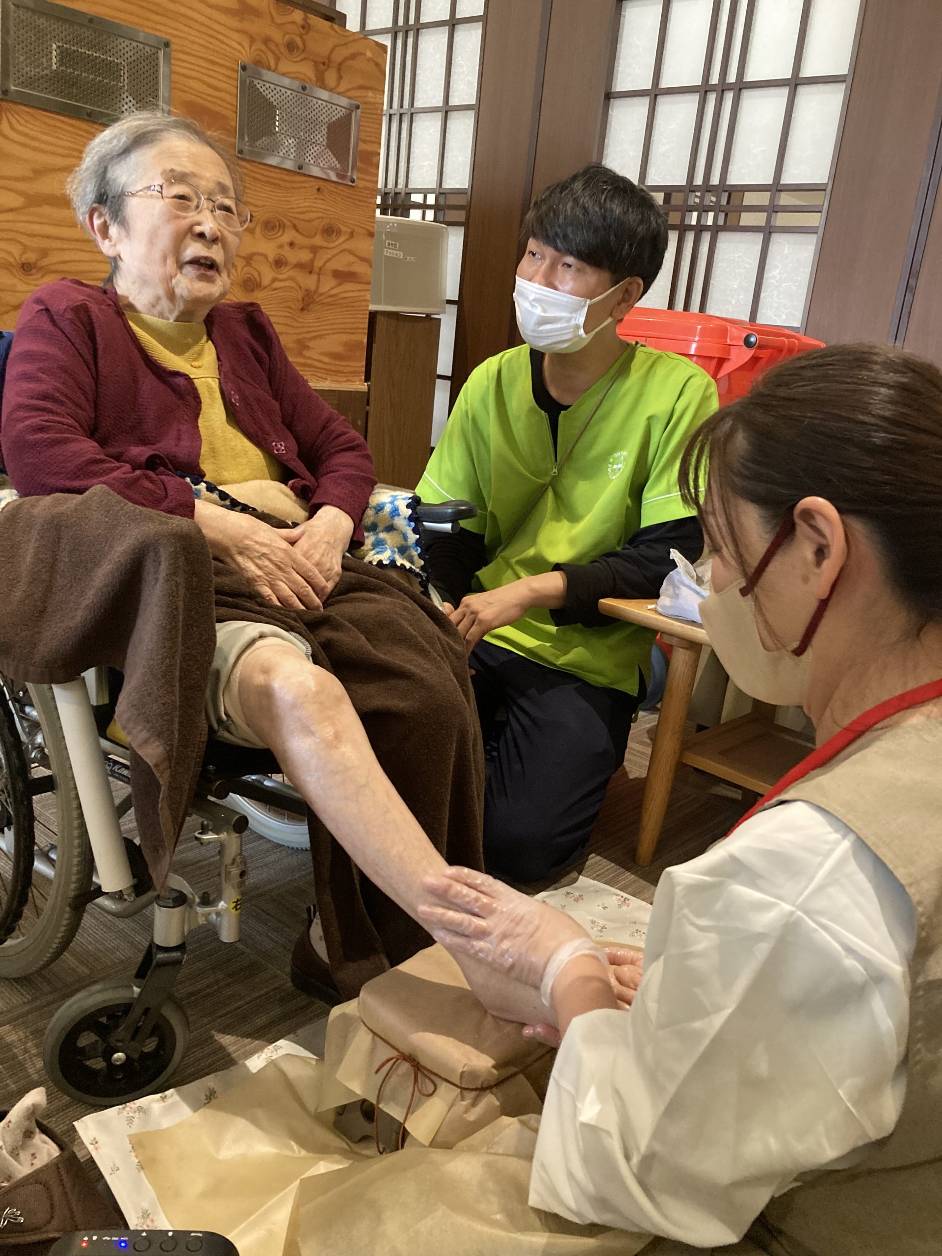 また、ハンドマッサージを受けた利用者様からは、「手がポカポカして気持ちええわ。」と話され、触れられる安心感から、自然と表情が柔らかくなっていました。
