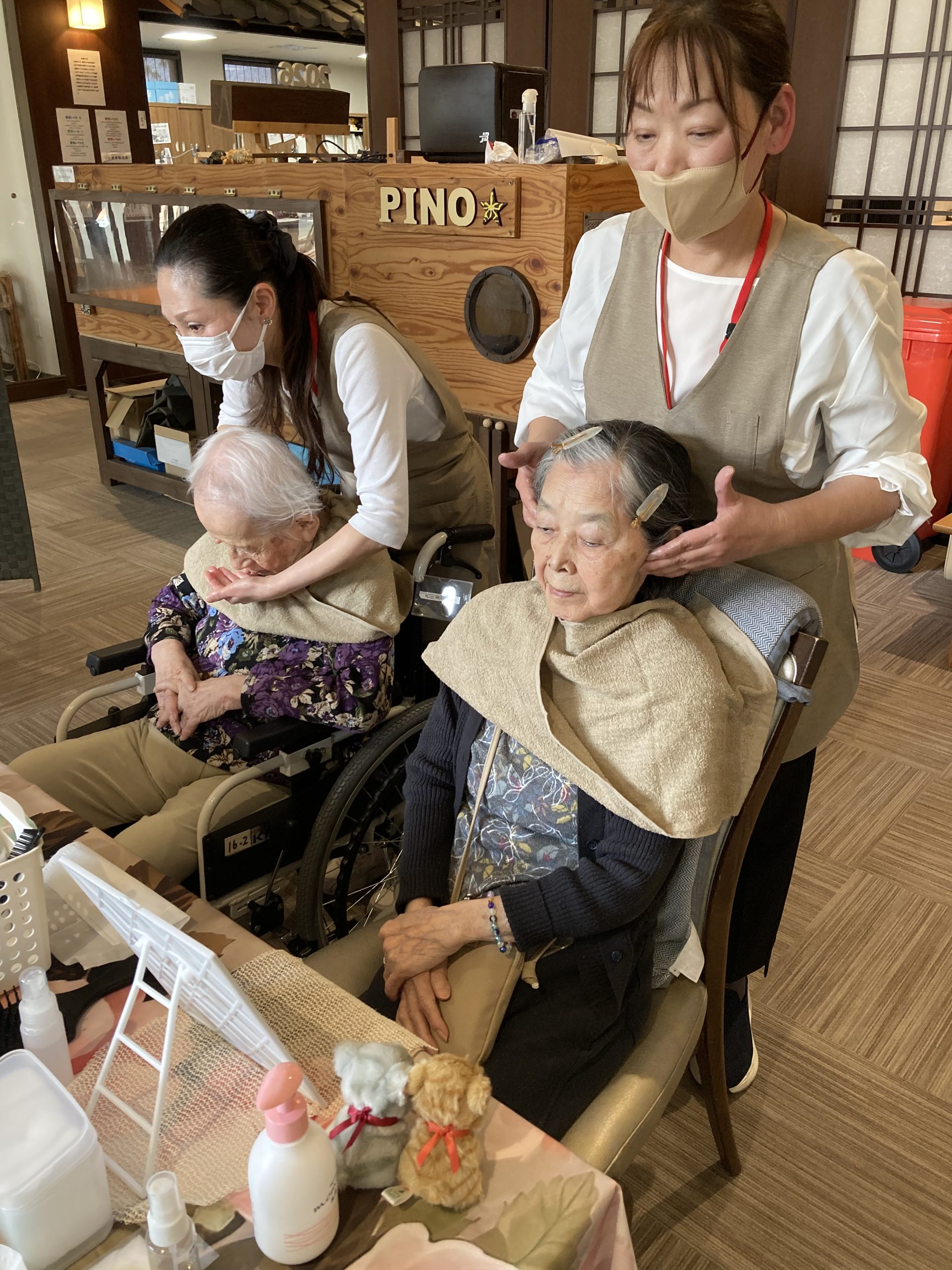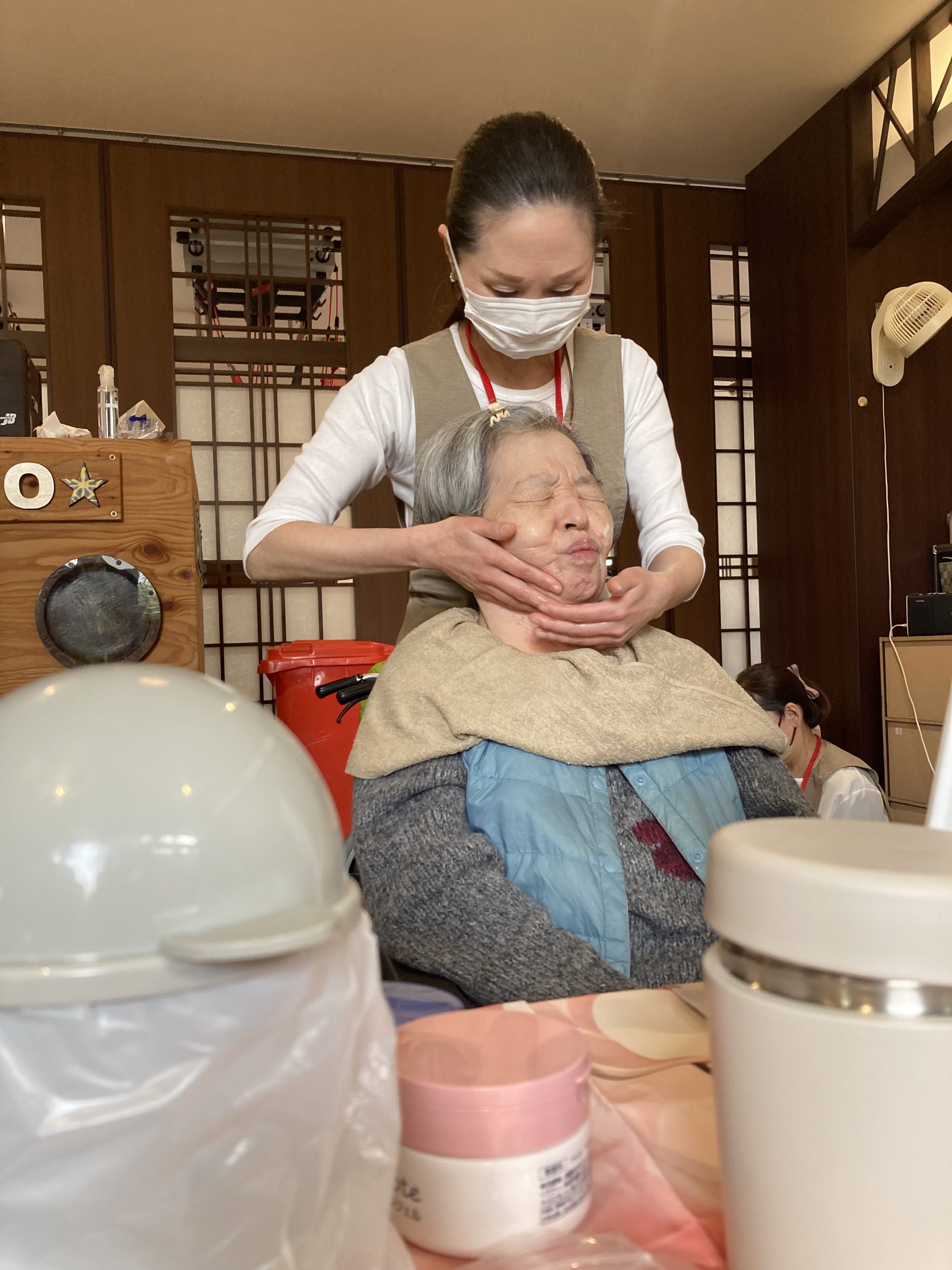 「気持ちええな。寝落ちしそうや…。」「こんなに綺麗にしてもらって嬉しいわ。」とフェイシャルケアを受けられた利用者様からあちこち喜びの声が聞かれました。