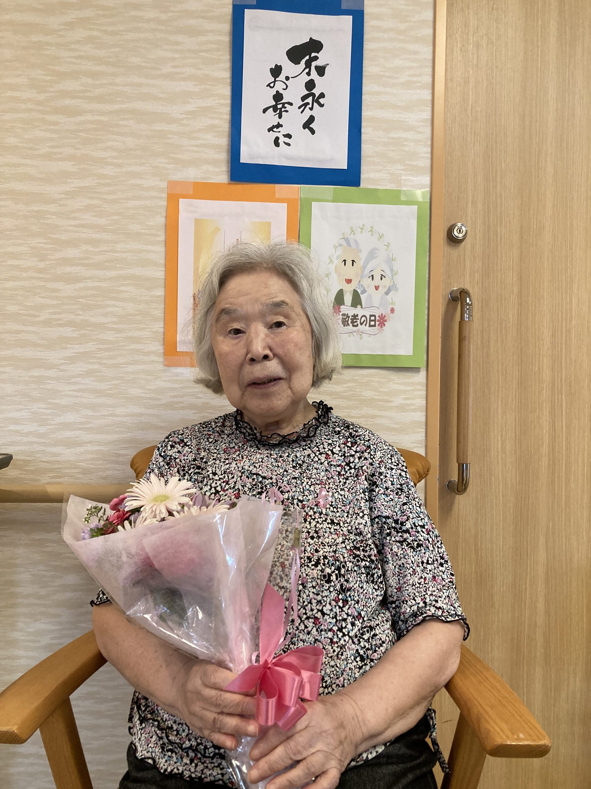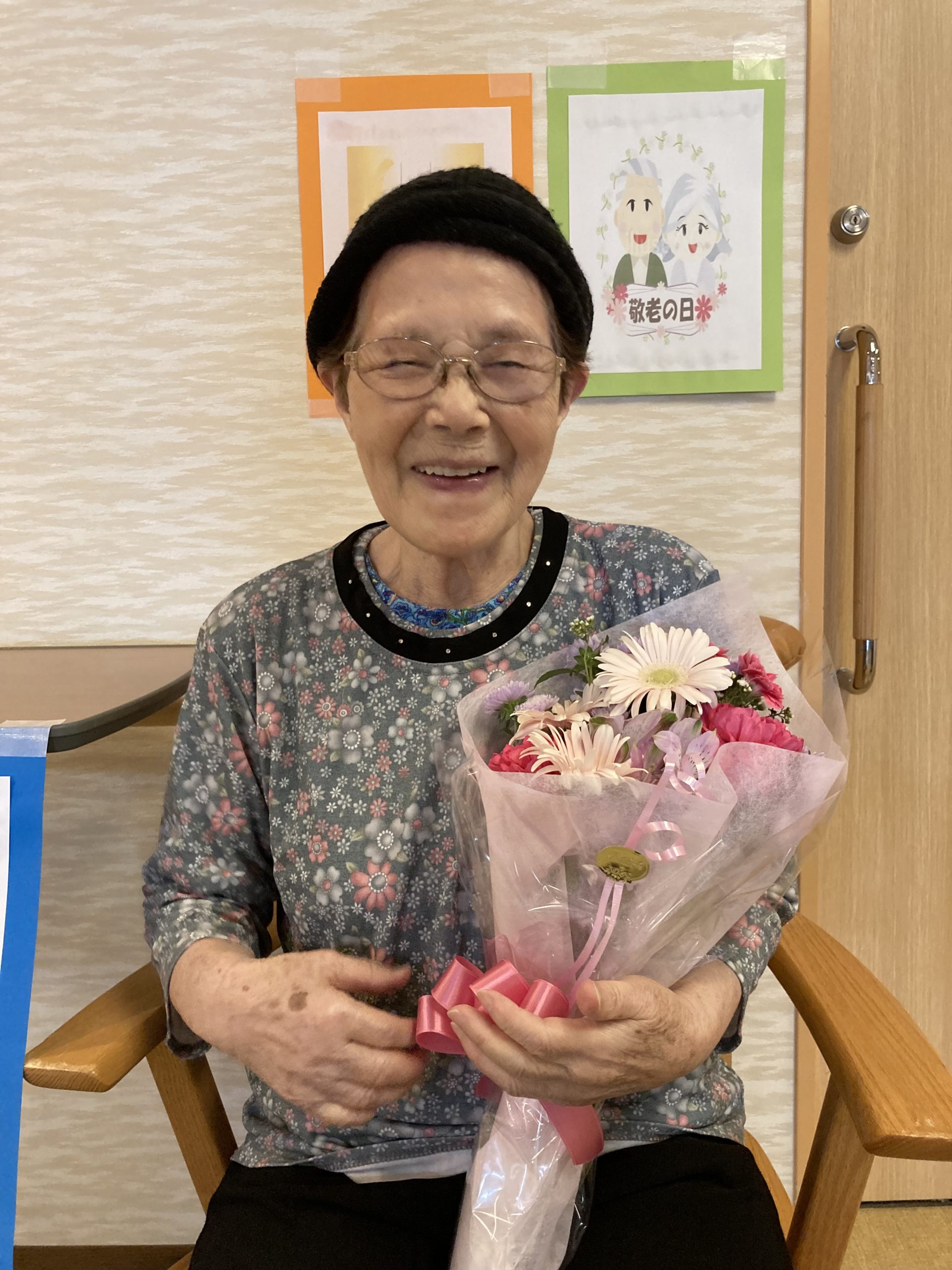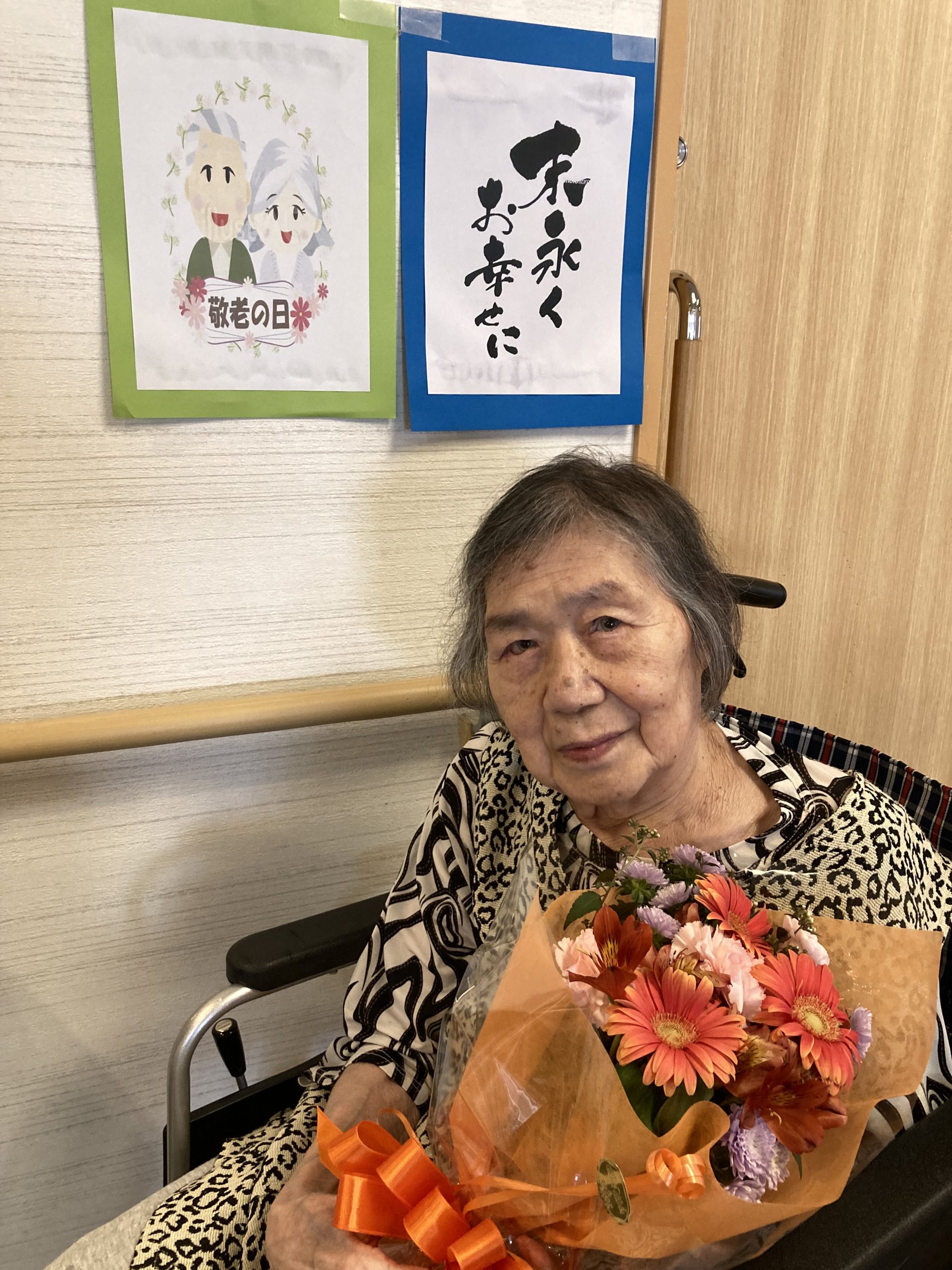 今年の敬老の日は、利用者の皆さんに日頃の「感謝」と「敬意」を込めて、色とりどりの花束💐をご用意しました。その花束を手にしていただき記念撮影を行いました。