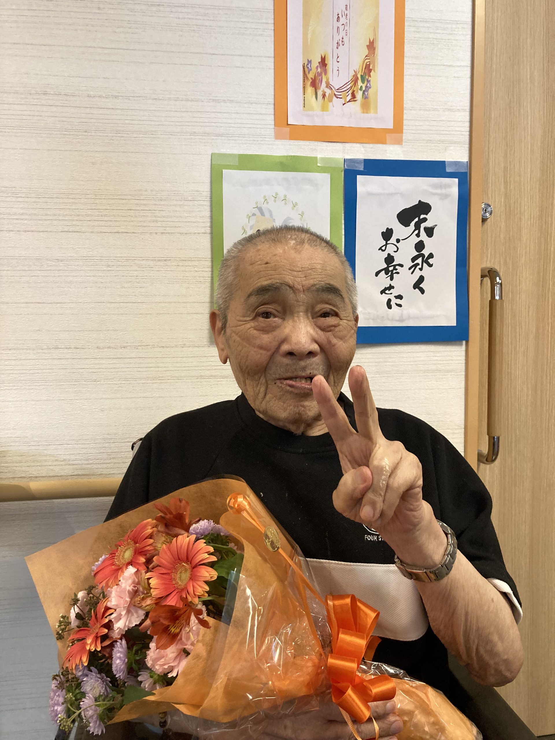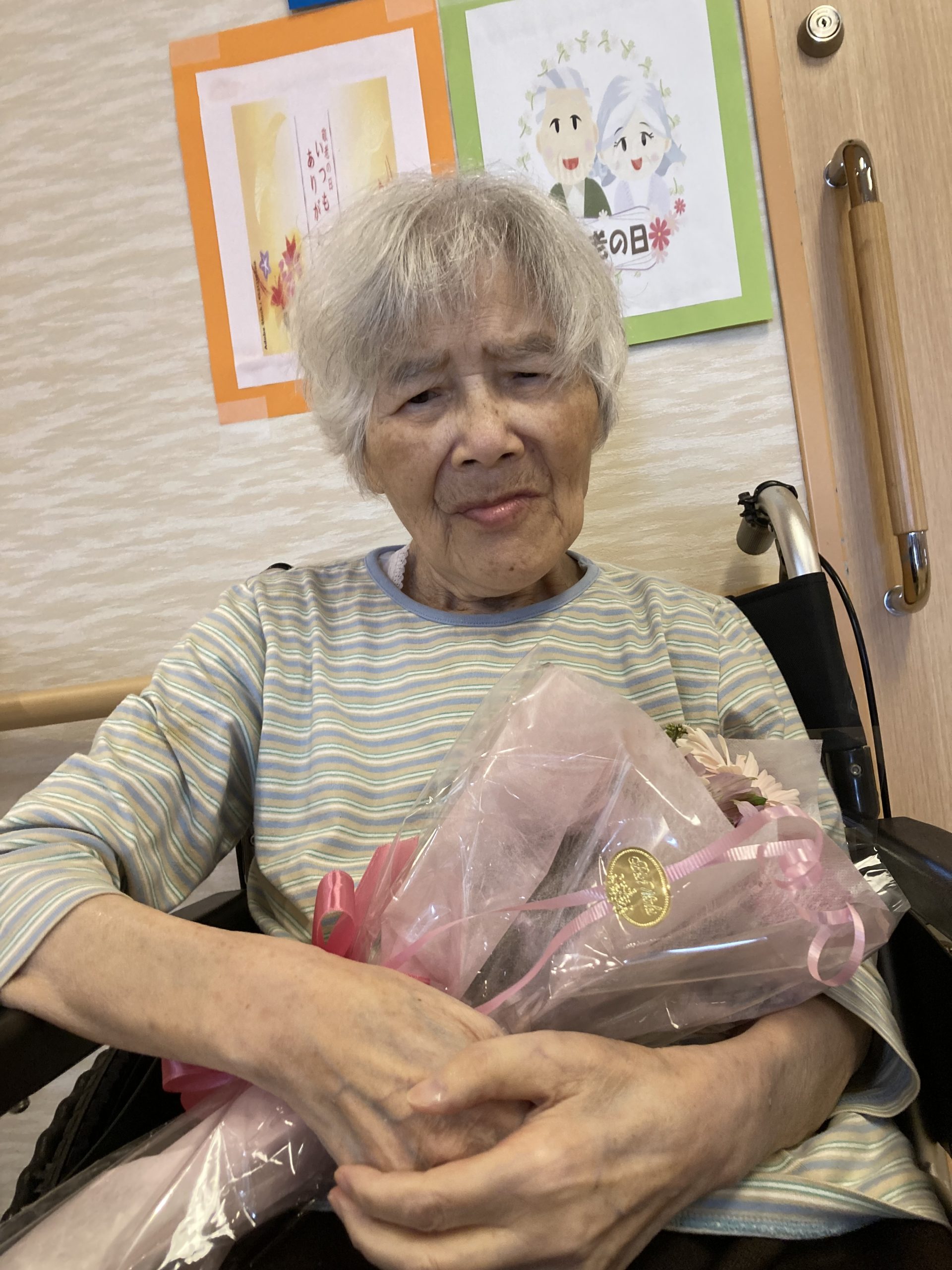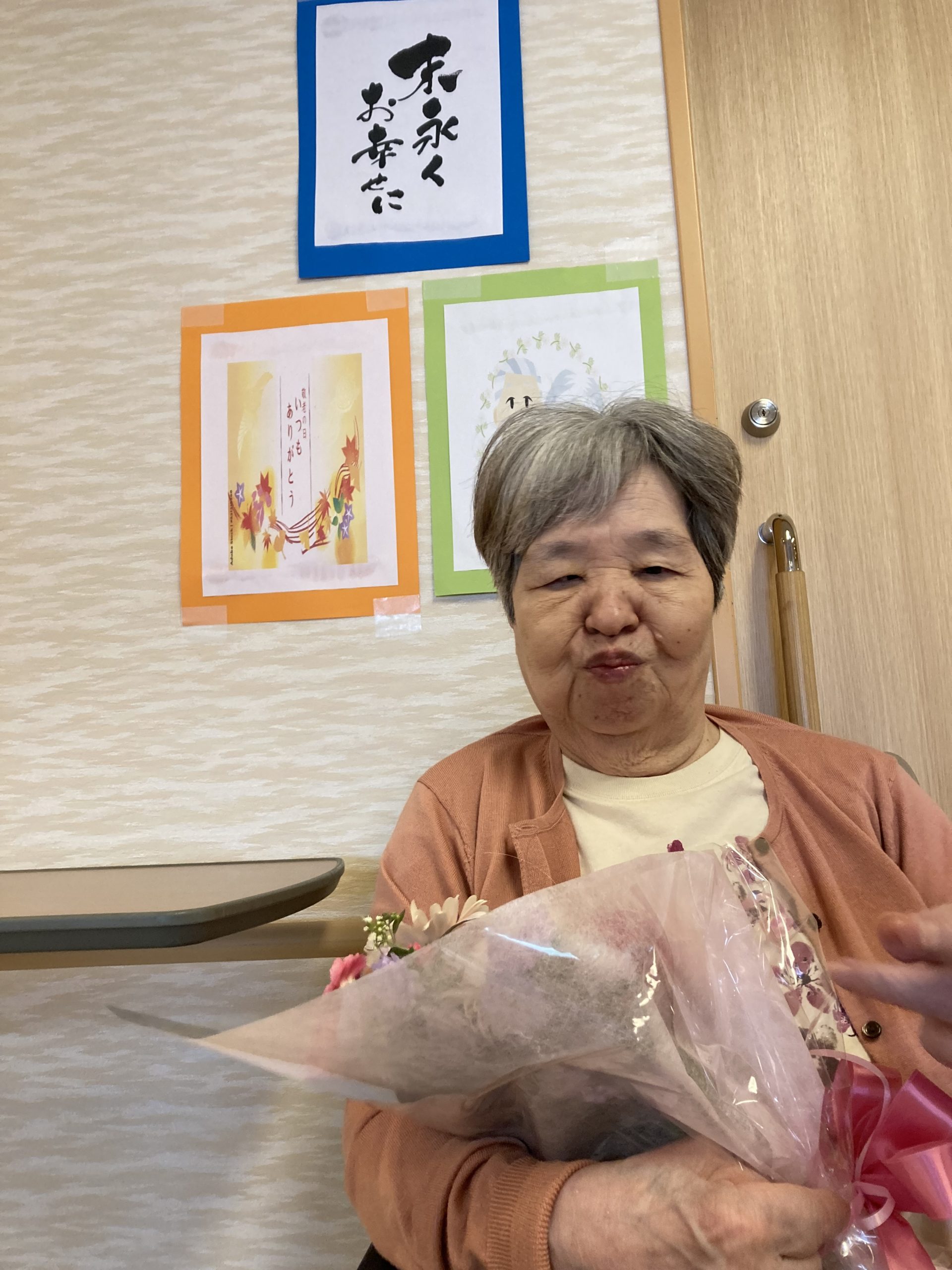 今年の敬老の日は、利用者の皆さんに日頃の「感謝」と「敬意」を込めて、色とりどりの花束💐をご用意しました。その花束を手にしていただき記念撮影を行いました。