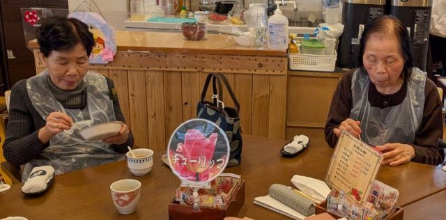 今年は久しぶりにチョコレートフォンデュをしました。材料を揃えてチョコレートを溶かして準備もできて後はチョコレートフォンデュのマシンにチョコレートを入れるだけだったのですが… 溶かしたチョコレートを入れても滝のように流れてこない。チョコレートが固すぎるのかと思い温かい牛乳を入れてみたりいろいろやってみたのですが、流れる様子がなかったので諦めて上からチョコレートをかけて提供させていただきました。日頃は甘いものは食べられないご利用者様が召し上がられていたのがすごくうれしかったです。