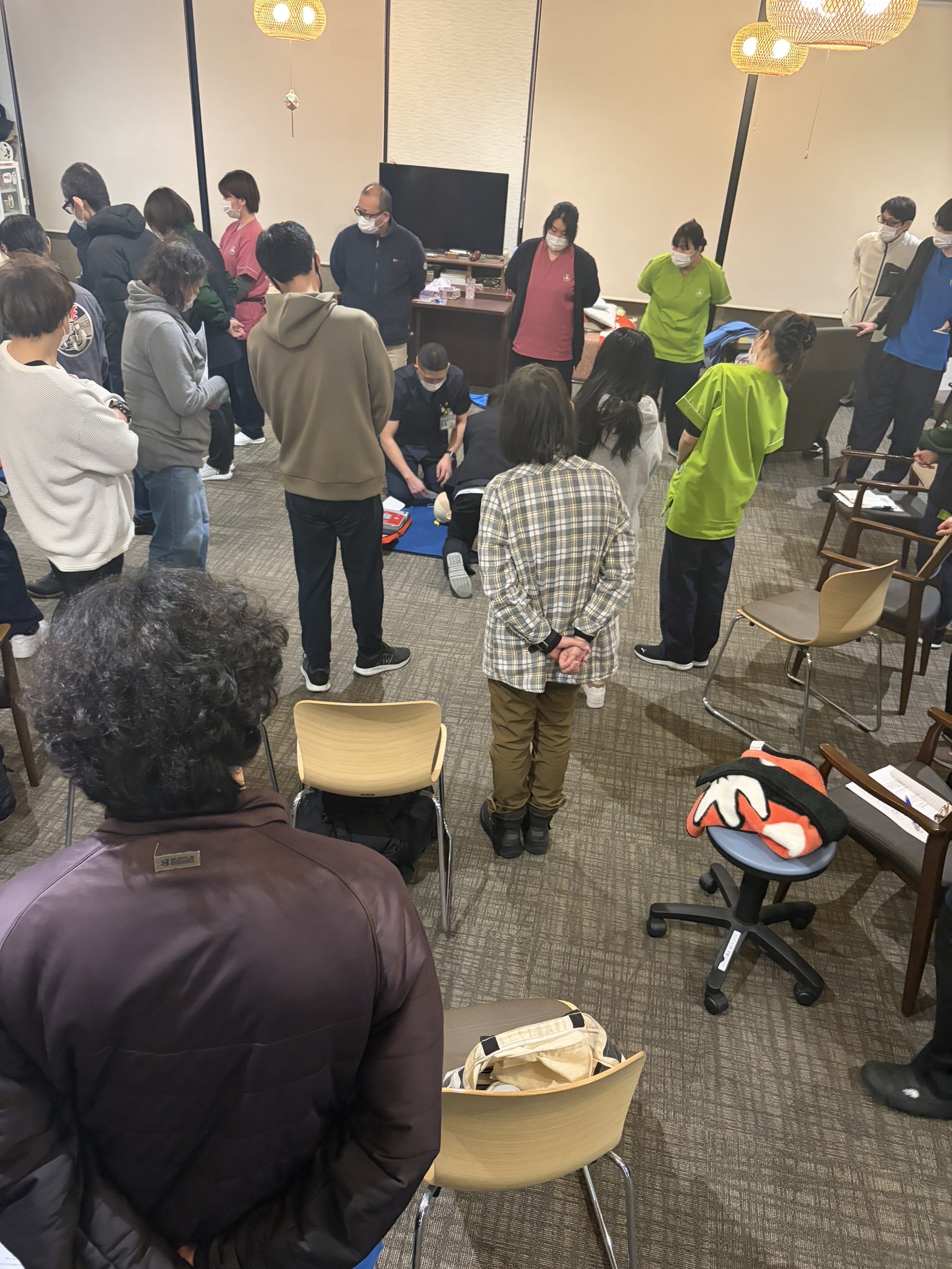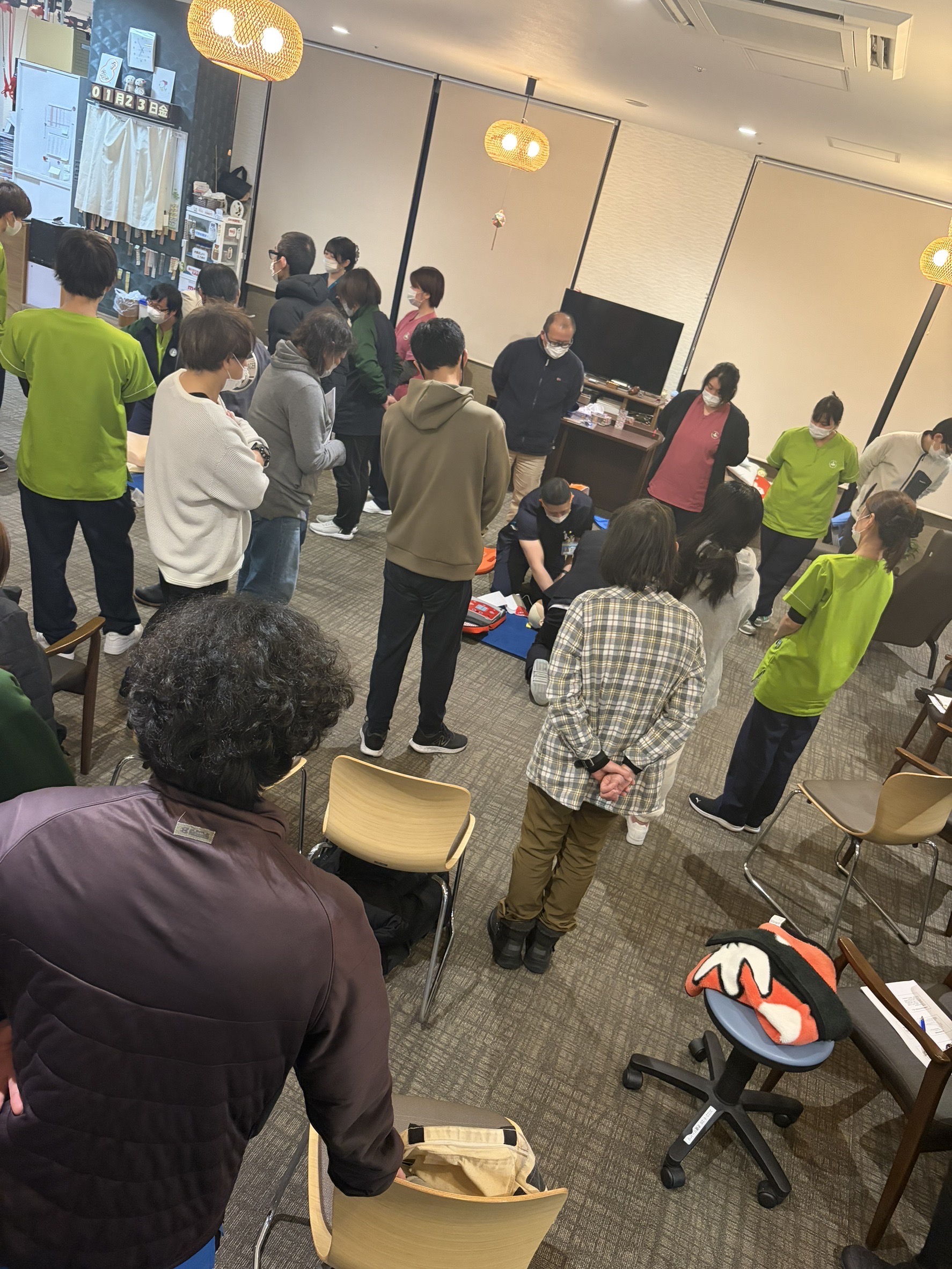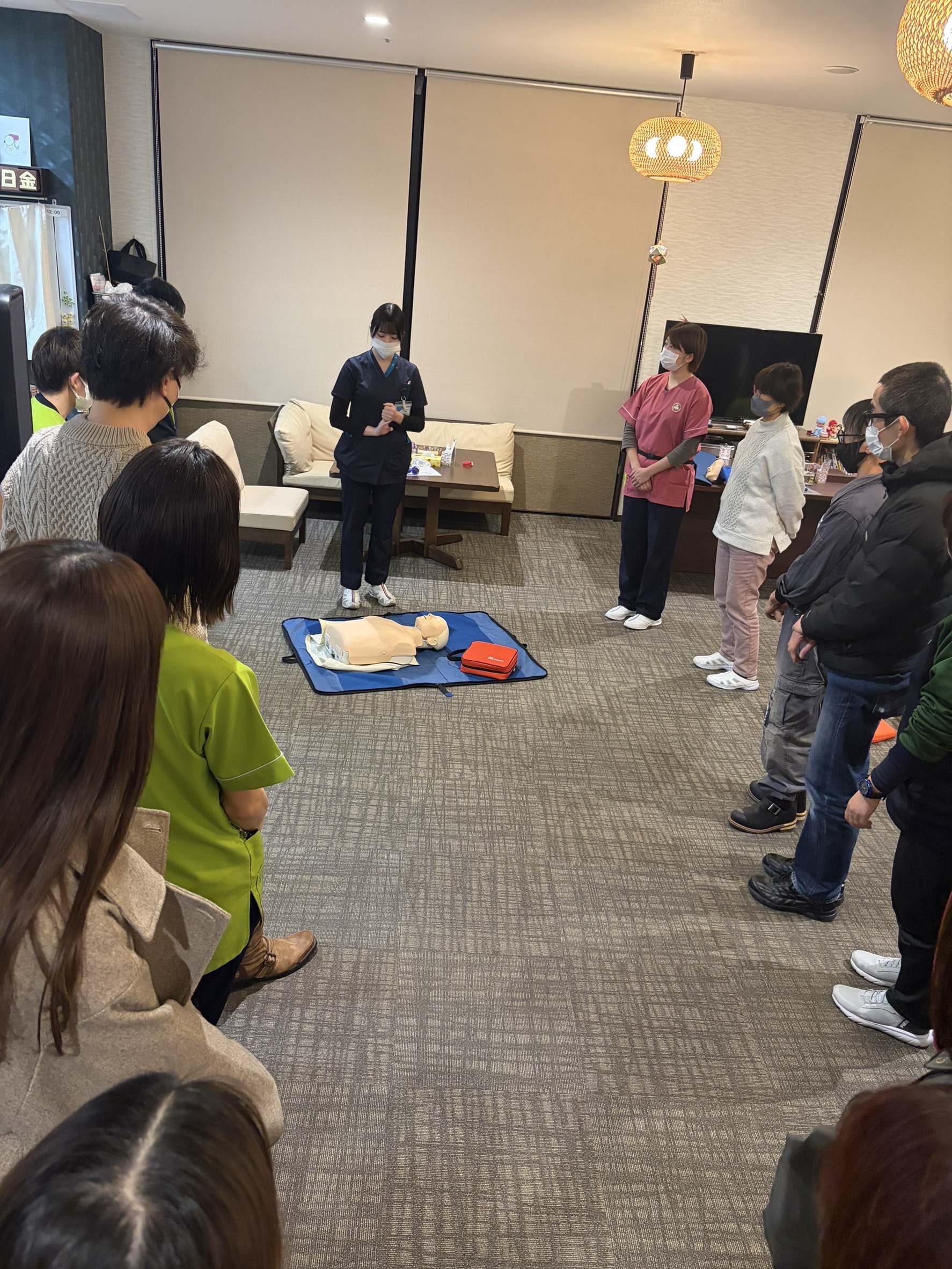 今月、菜乃花では協力提携機関である医誠会国際総合病院の救急救命士を講師にお迎えし、職員を対象とした「一次救命処置(BLS)」研修を行いました。