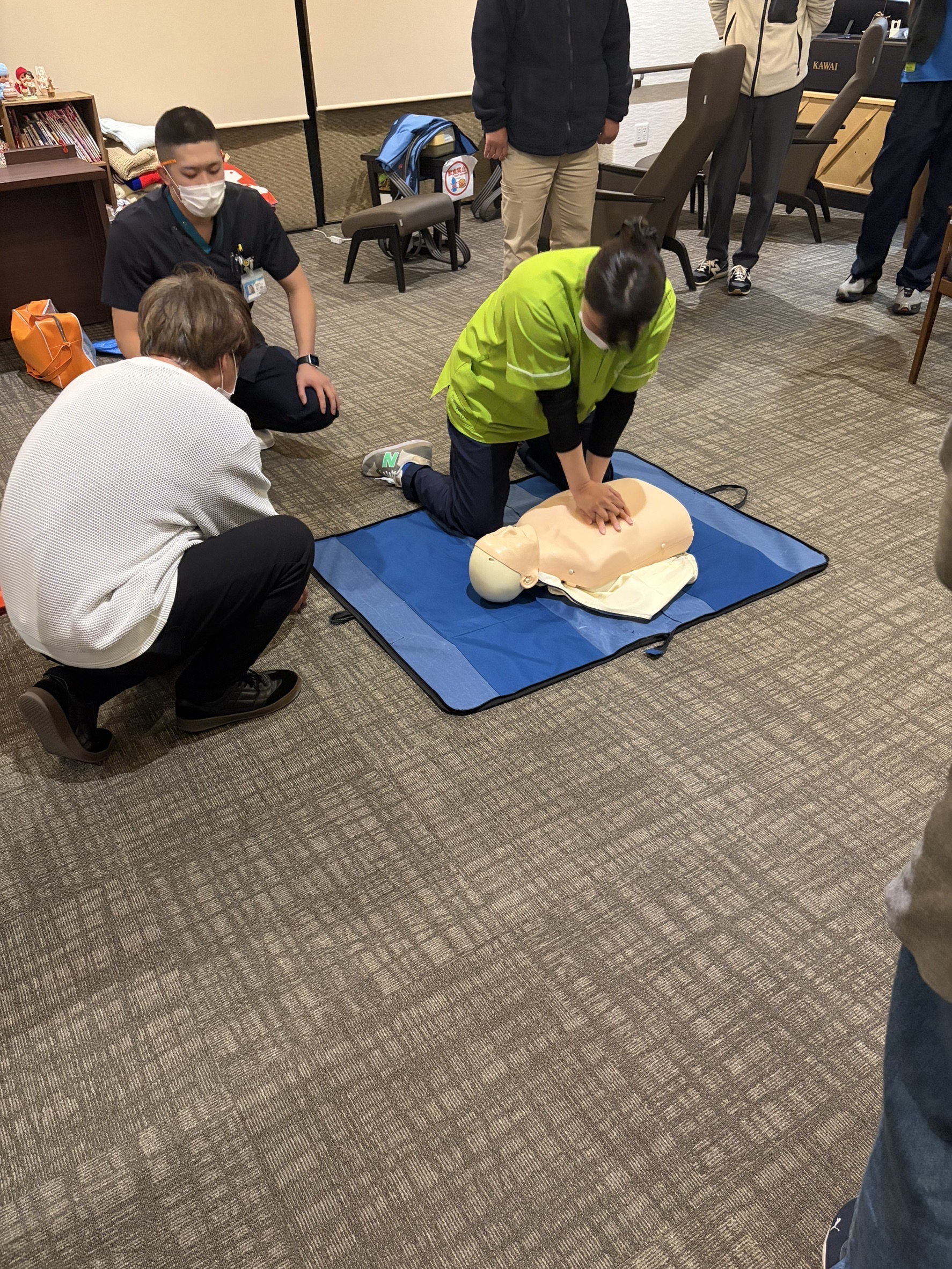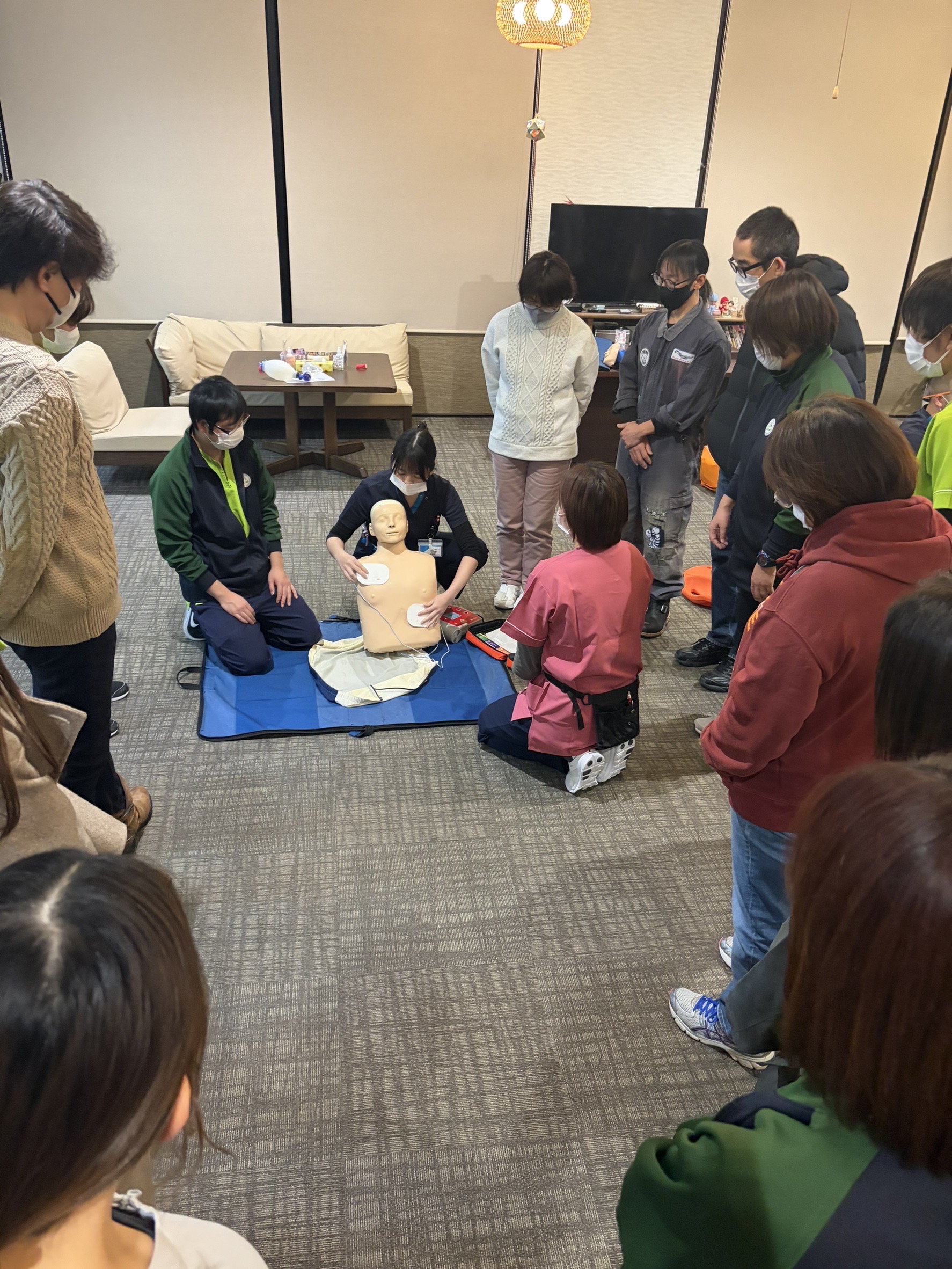 職員は訓練用のマネキンを使いながら胸骨圧迫の強さやテンポを確認しながらAEDの装着からショック実行までの手順も実際に体験しました。