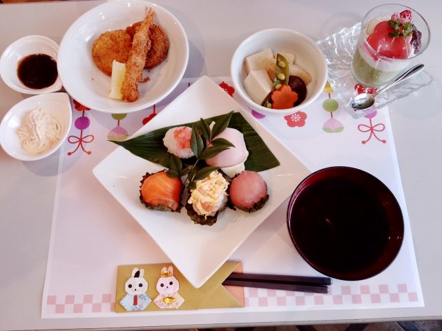 今月の行事食は手毬寿司に春のムースと