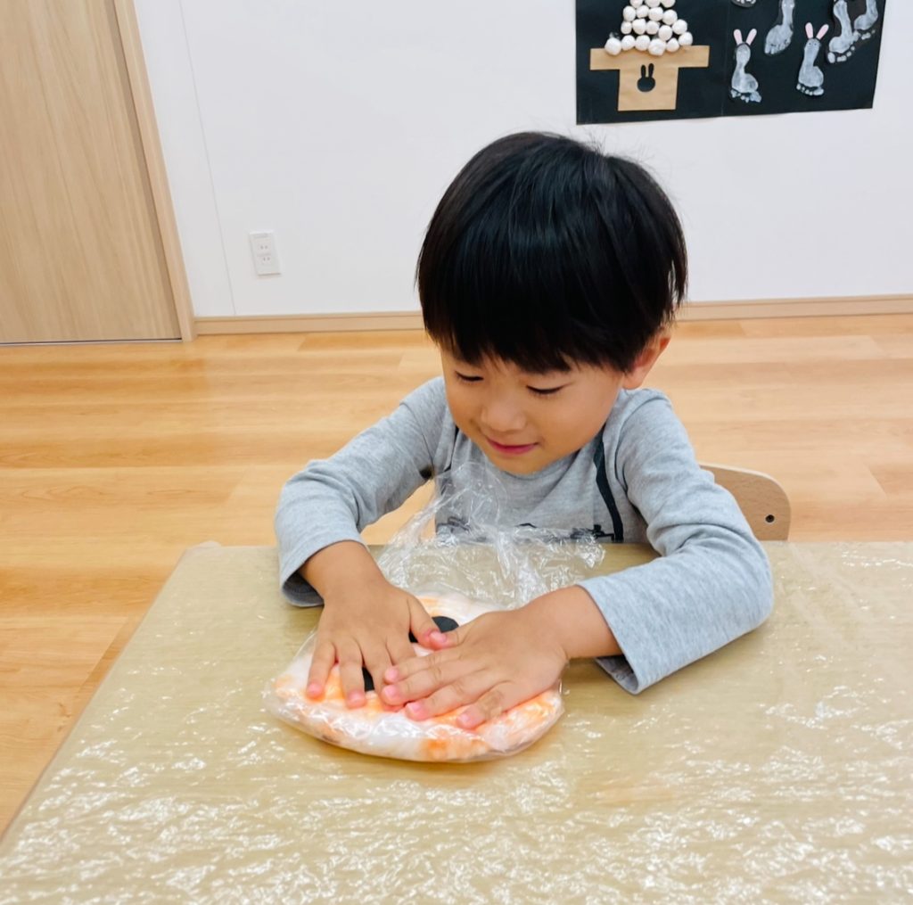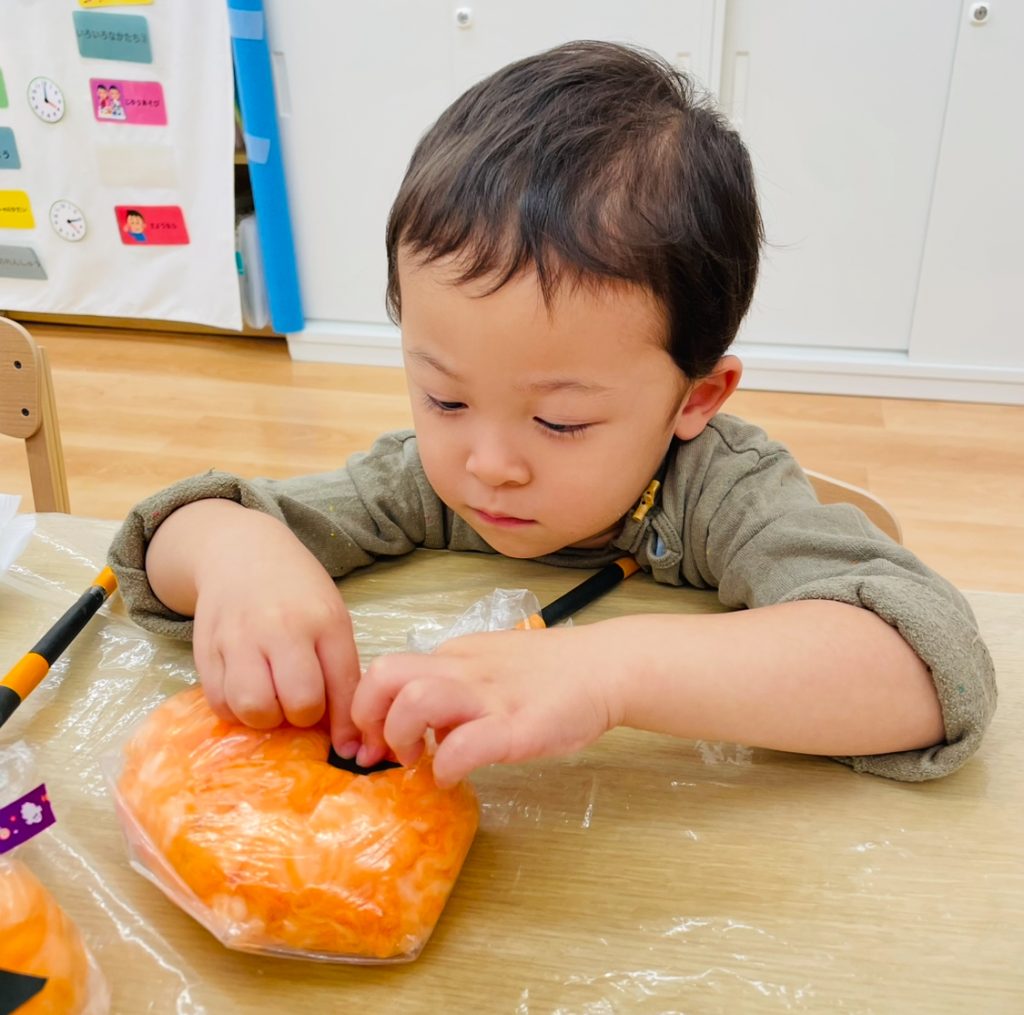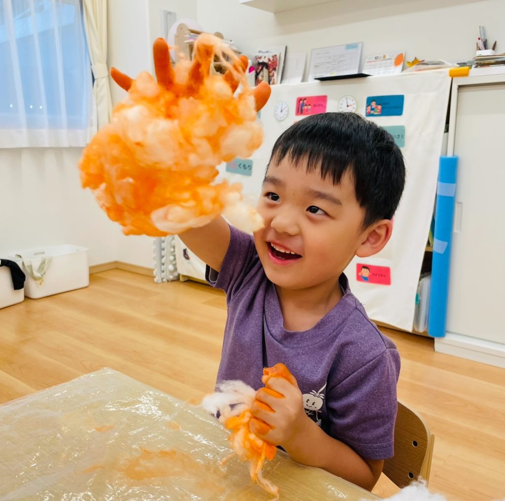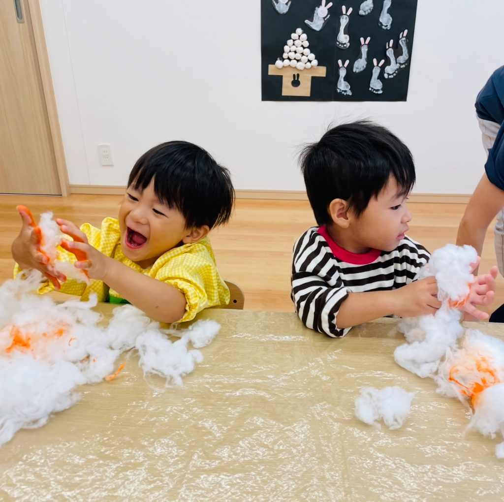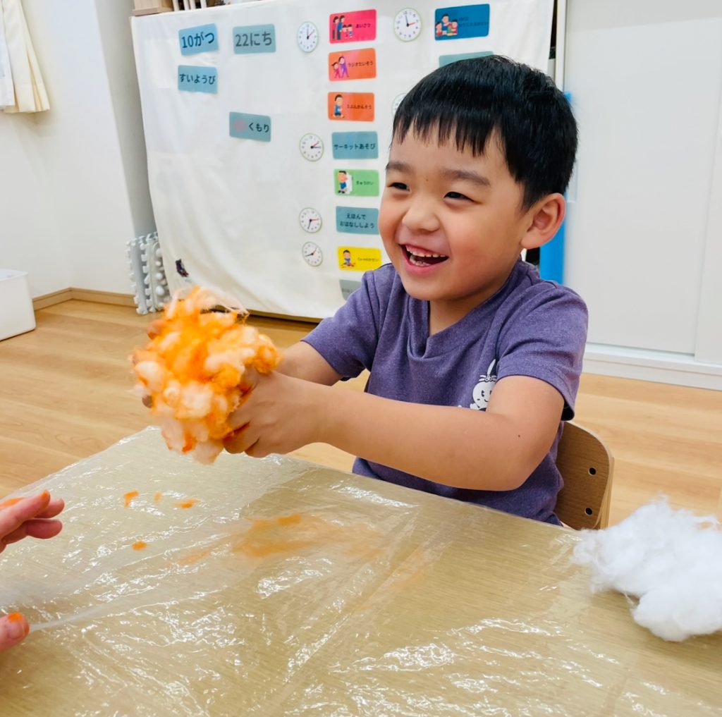 綿の感触を楽しんだ後は、オレンジ色の絵の具を手につけて