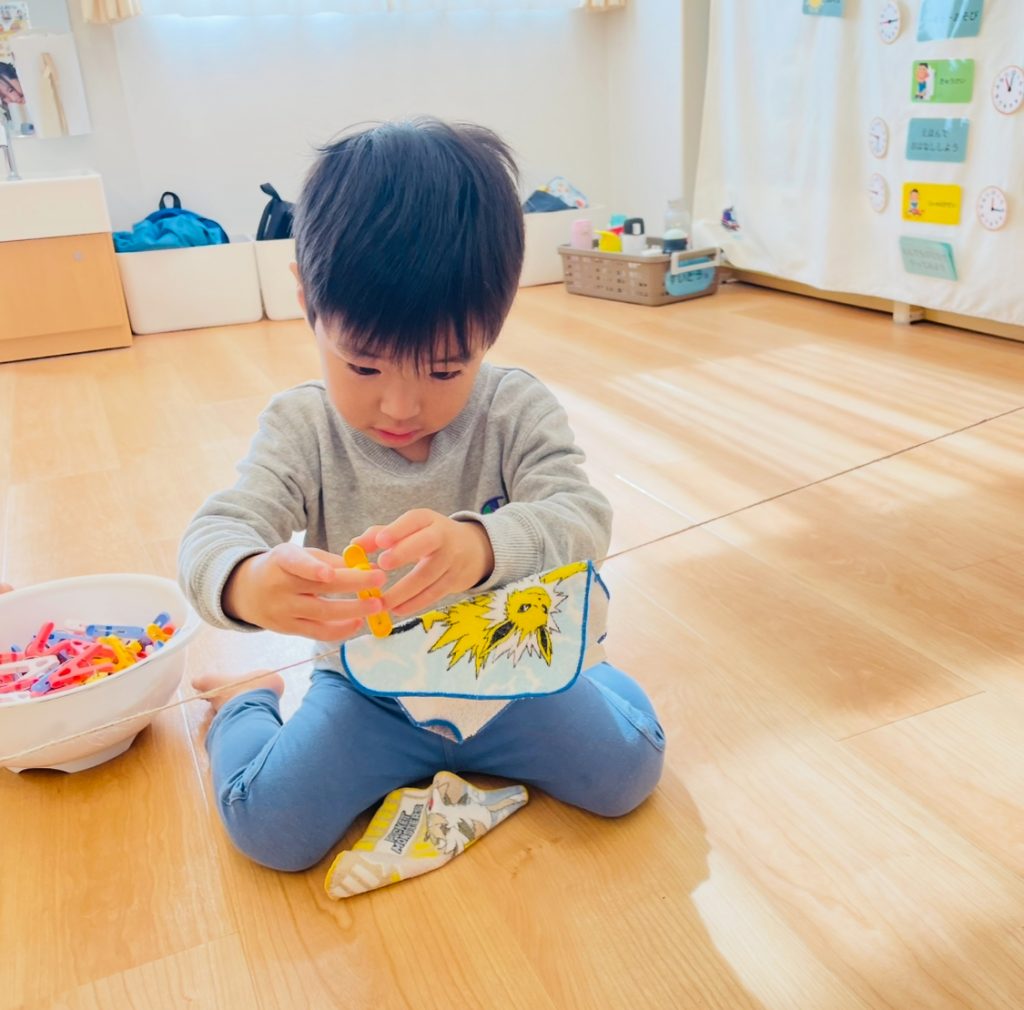 ん~~!洗濯ばさみがかたくて難しいけど、一生懸命取り組むお友達✨