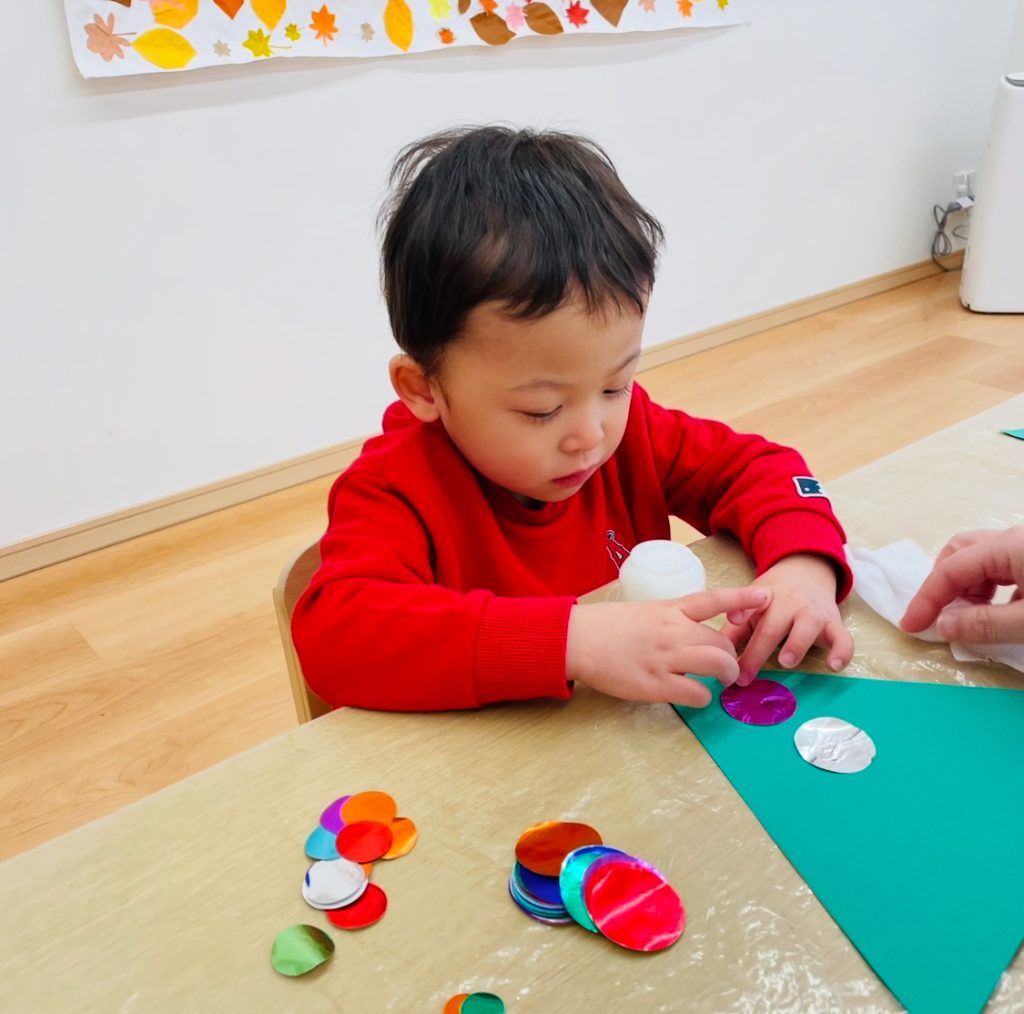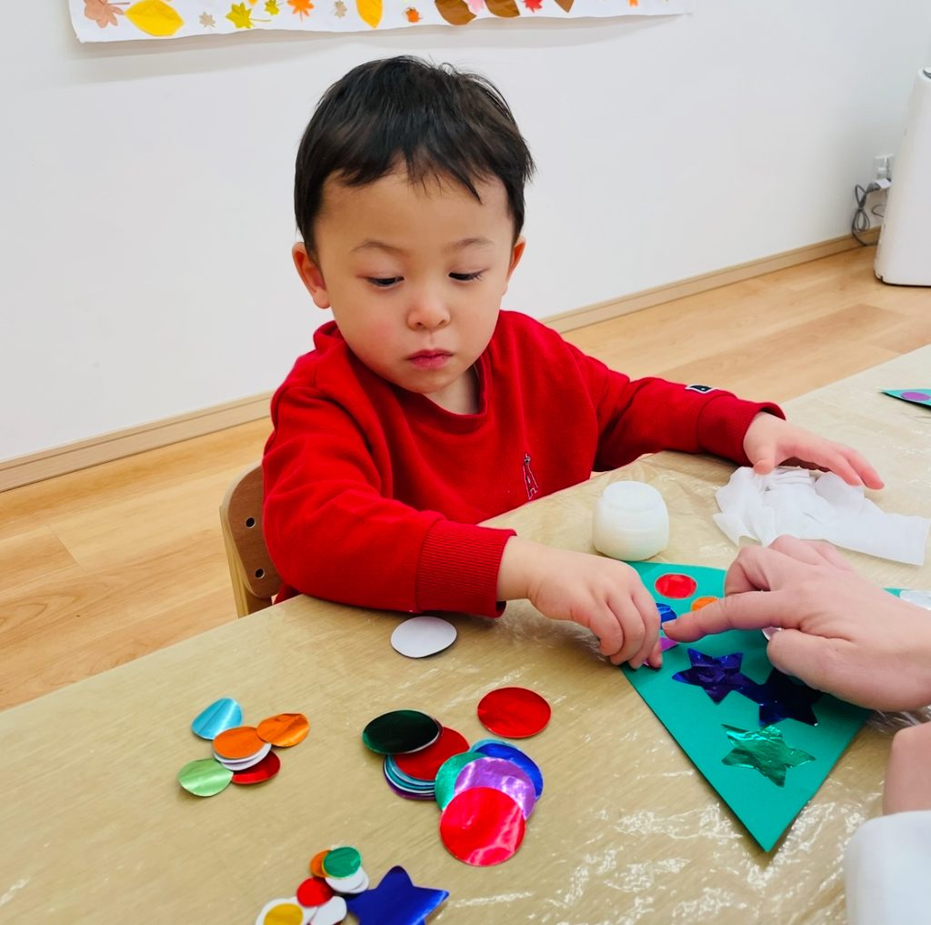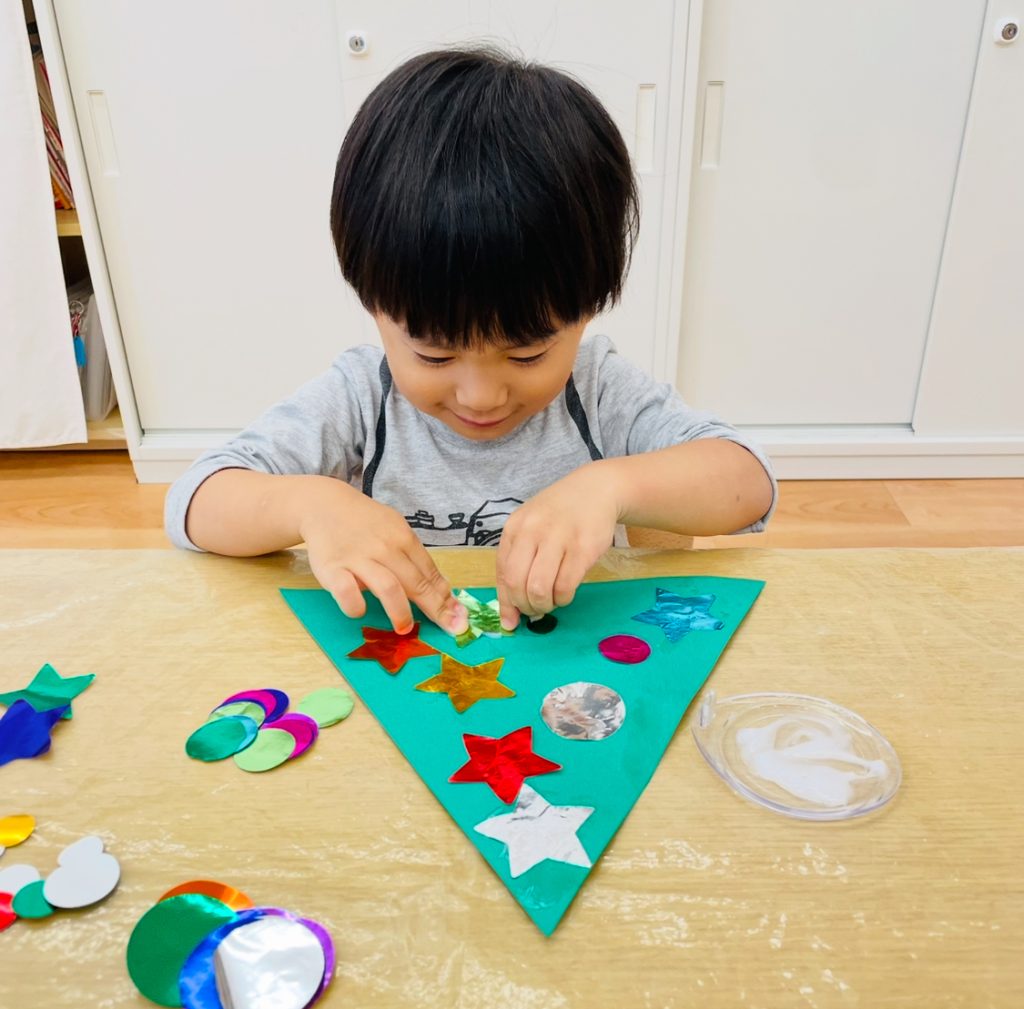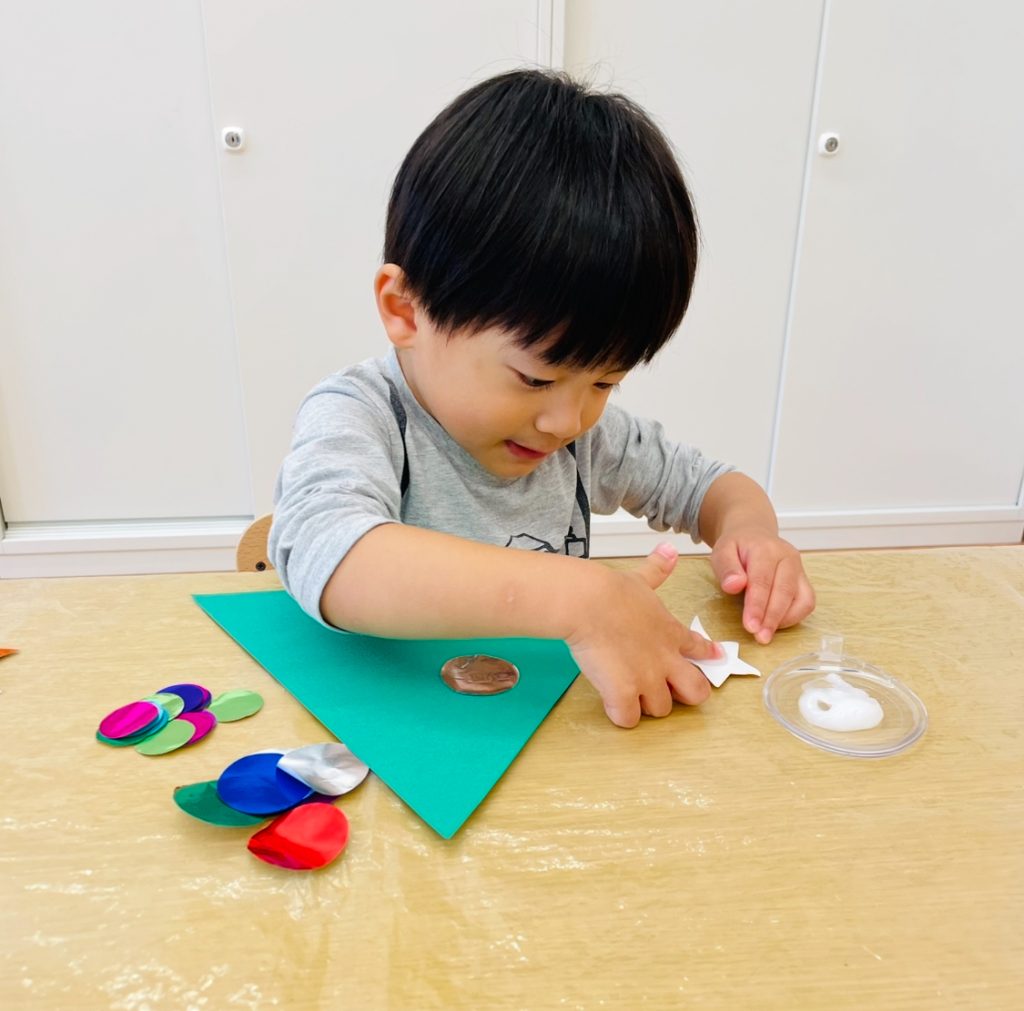 形や大きさ、貼る位置、色の組み合わせを考えて貼っていきます♪